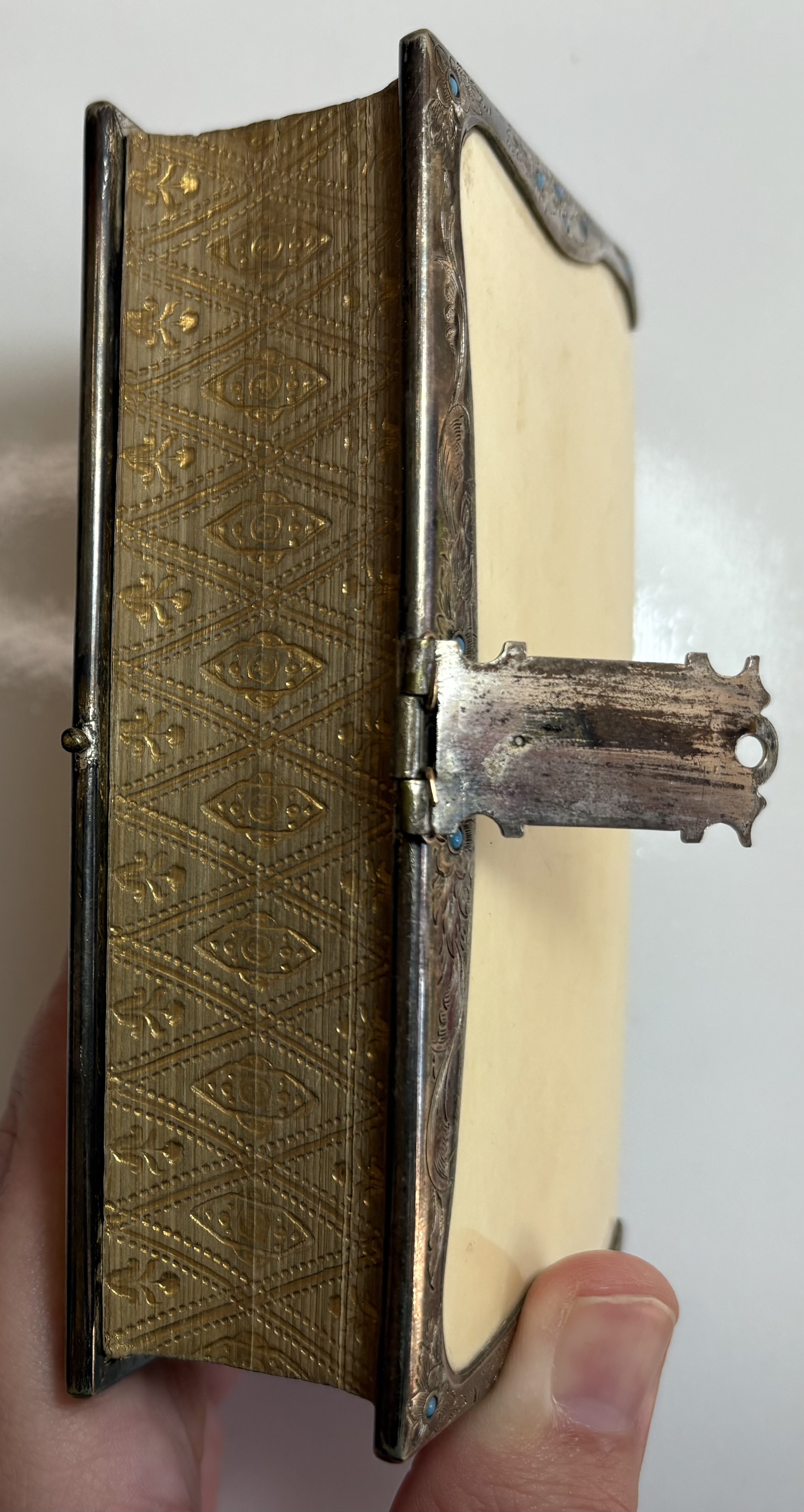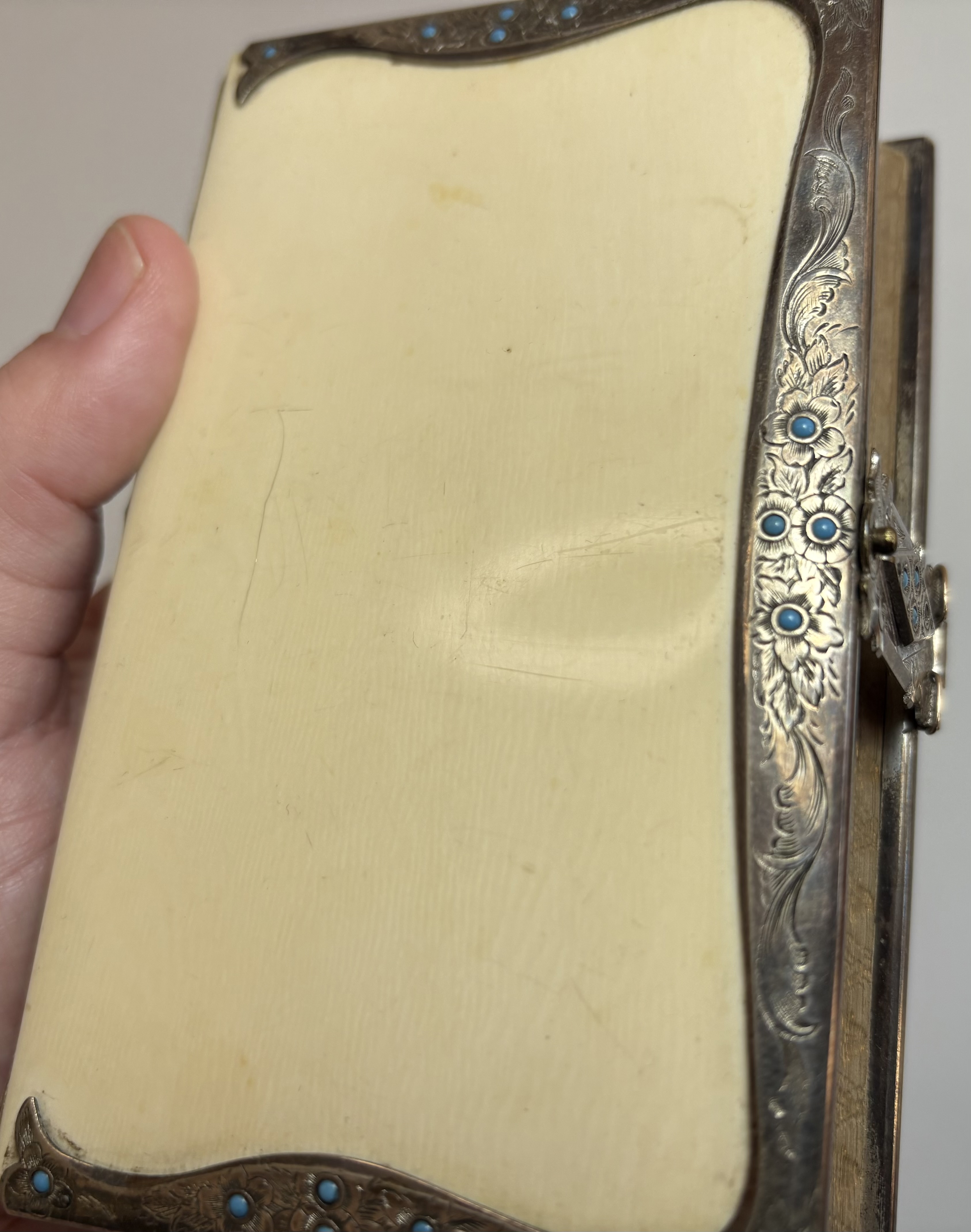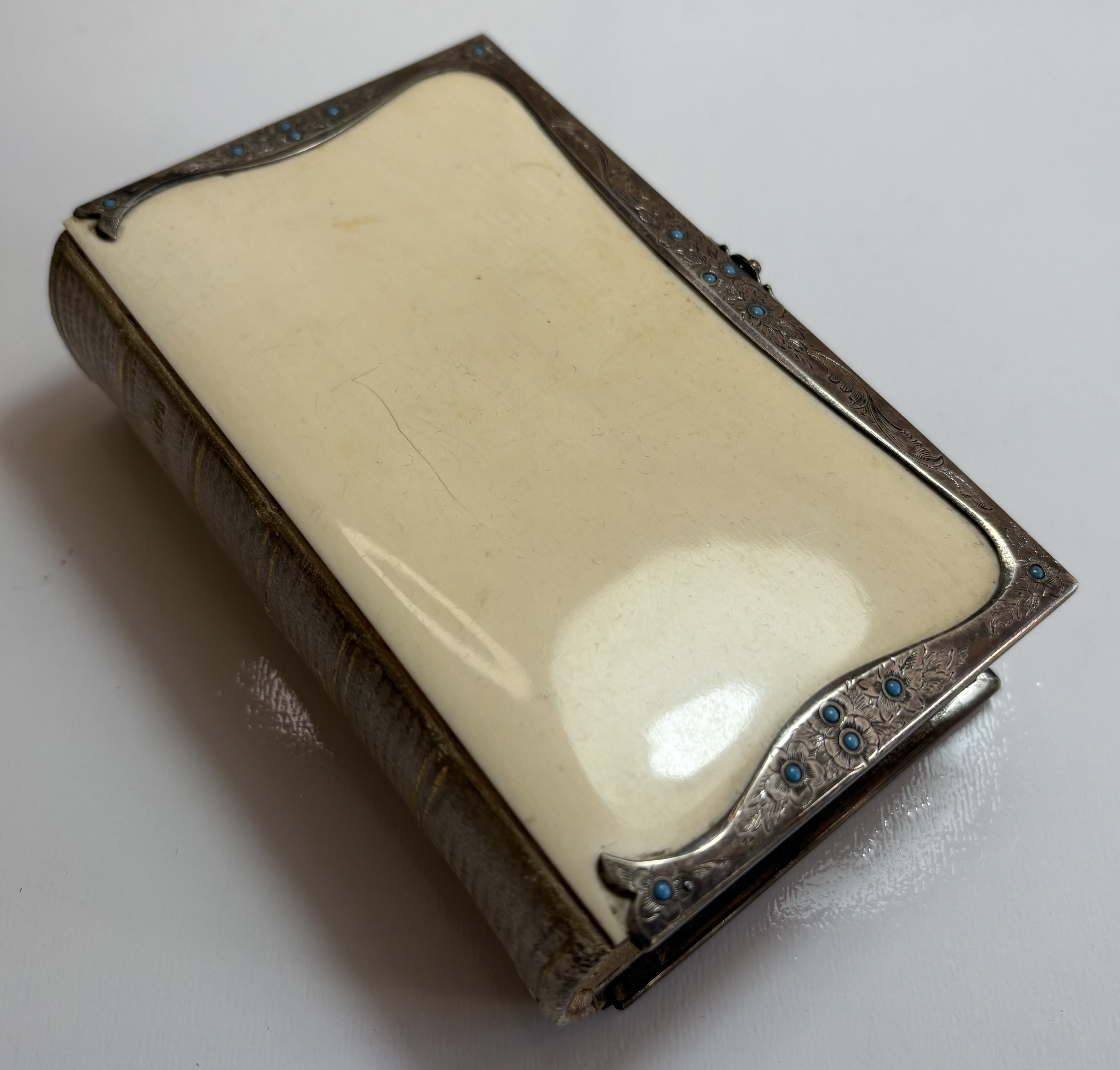 Attractively bound with front and rear "ivorine" boards, white metal border and clasp, decorated with repeating floral design with turquoise stone "pistil" embedded in each flower head. Gilt gauffered page edges, leather spine.