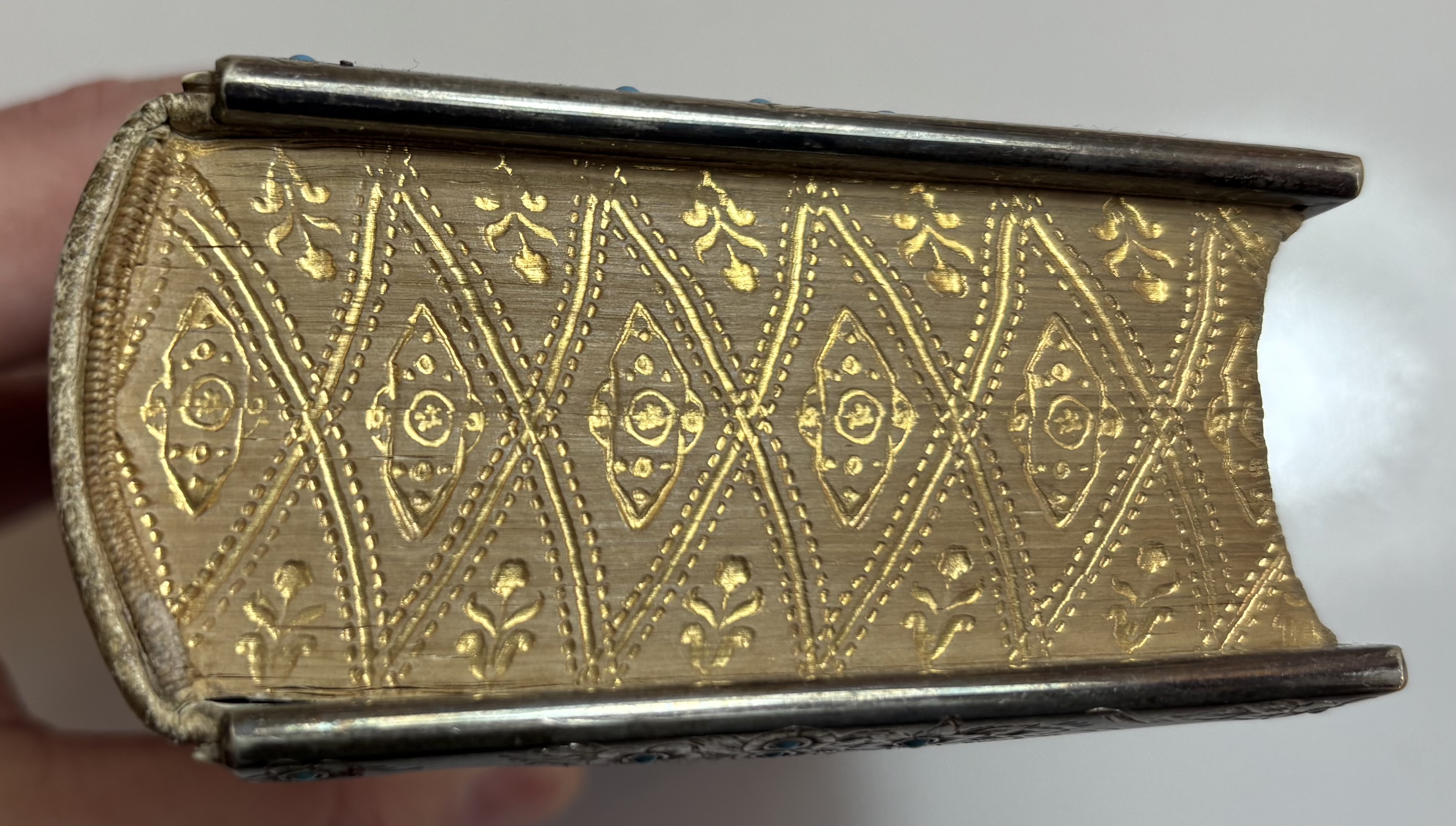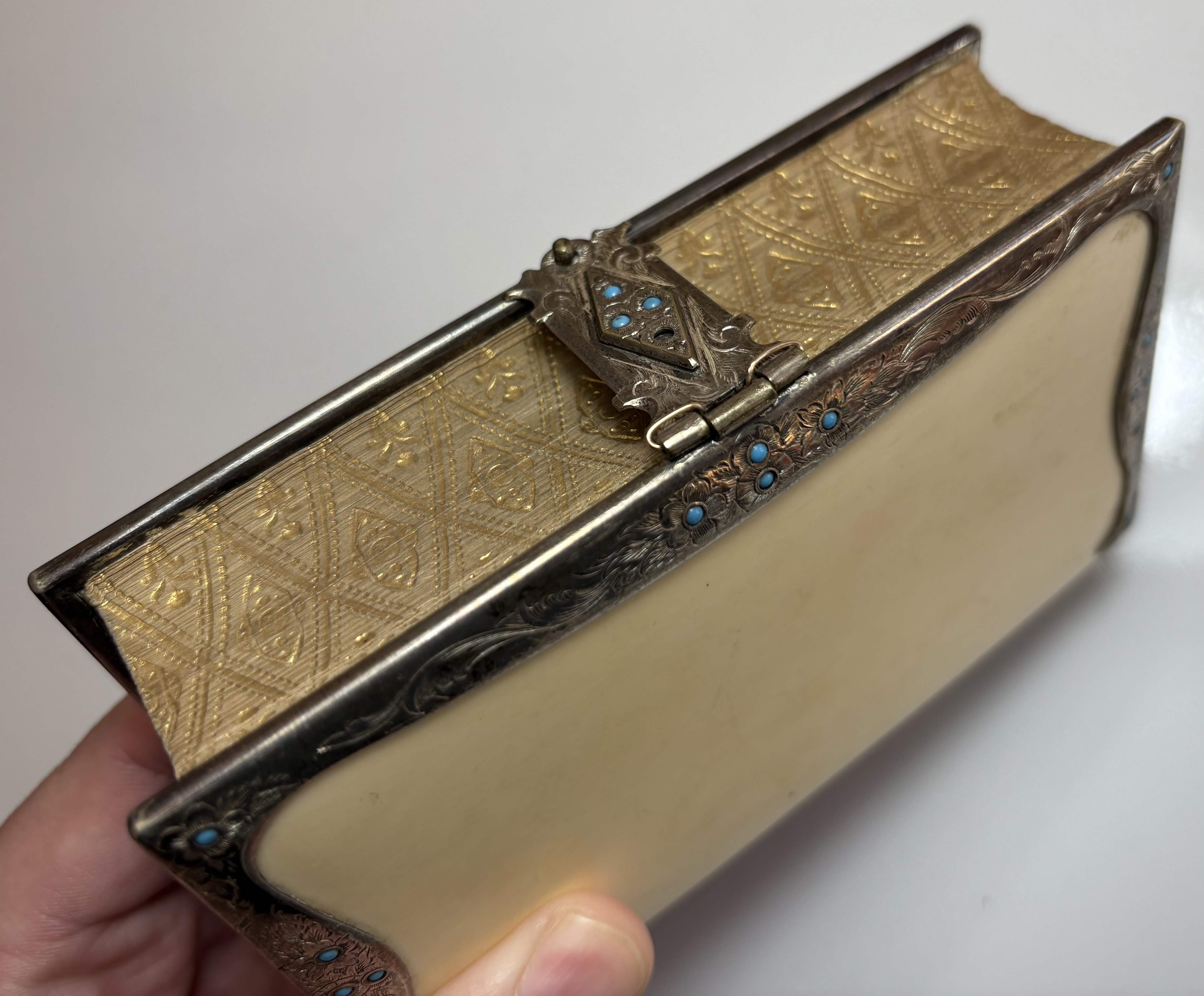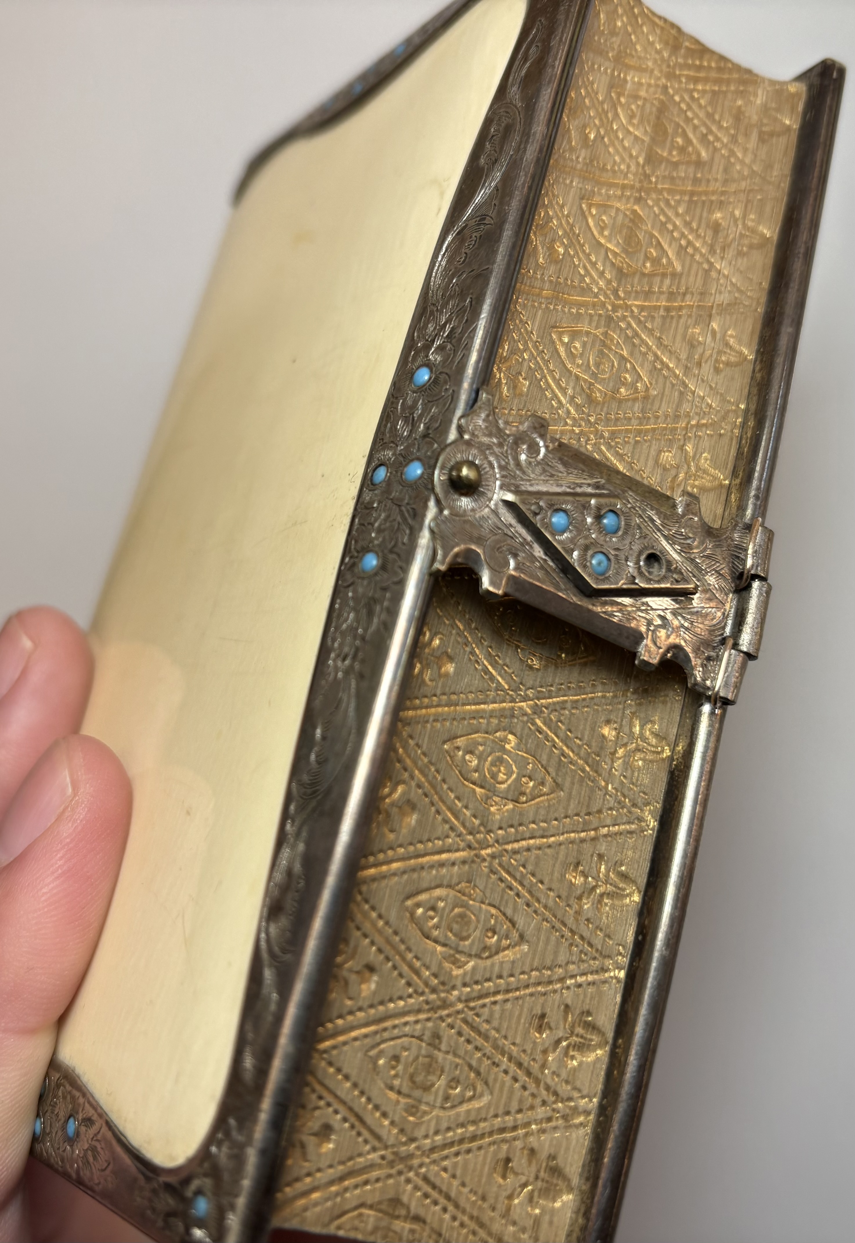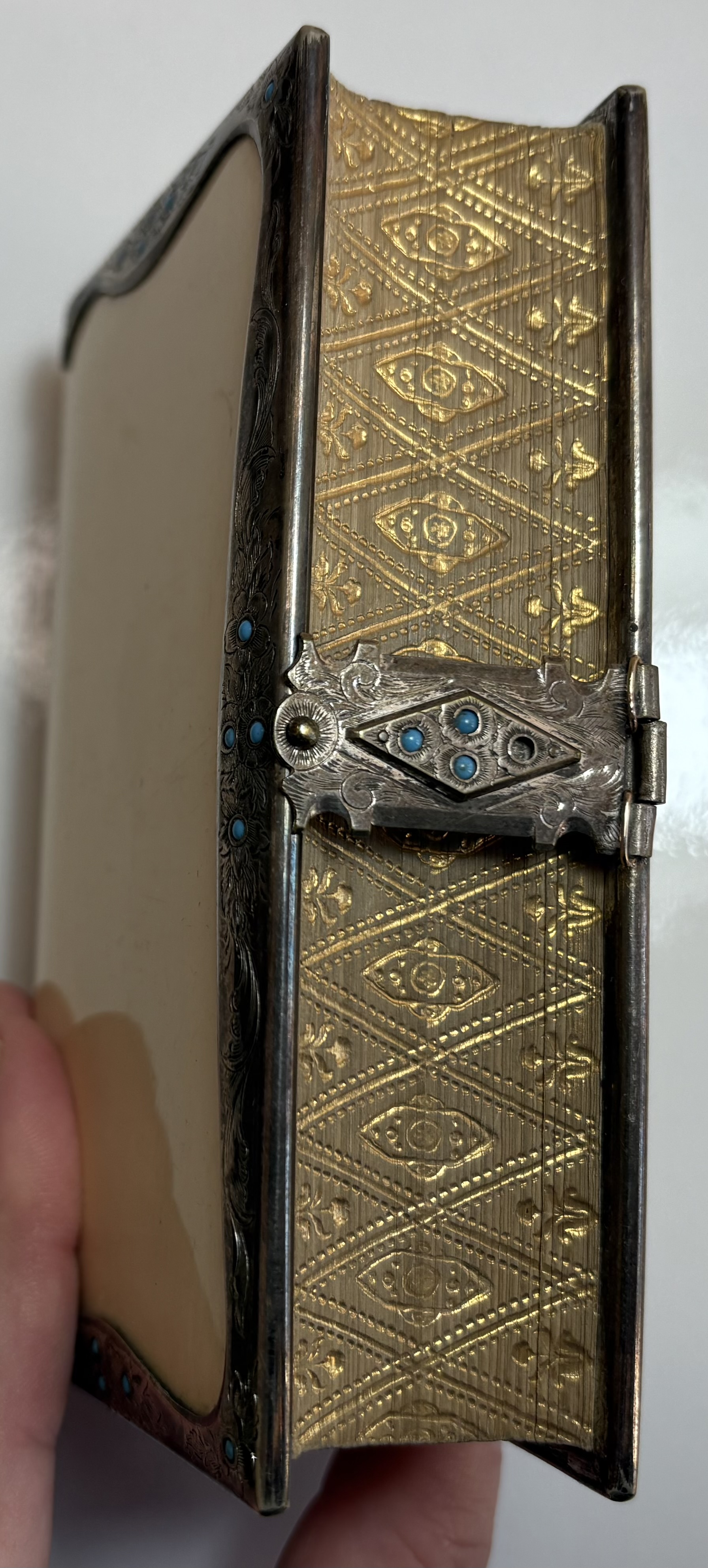 Attractively bound with front and rear "ivorine" boards, white metal border and clasp, decorated with repeating floral design with turquoise stone "pistil" embedded in each flower head. Gilt gauffered page edges, leather spine.