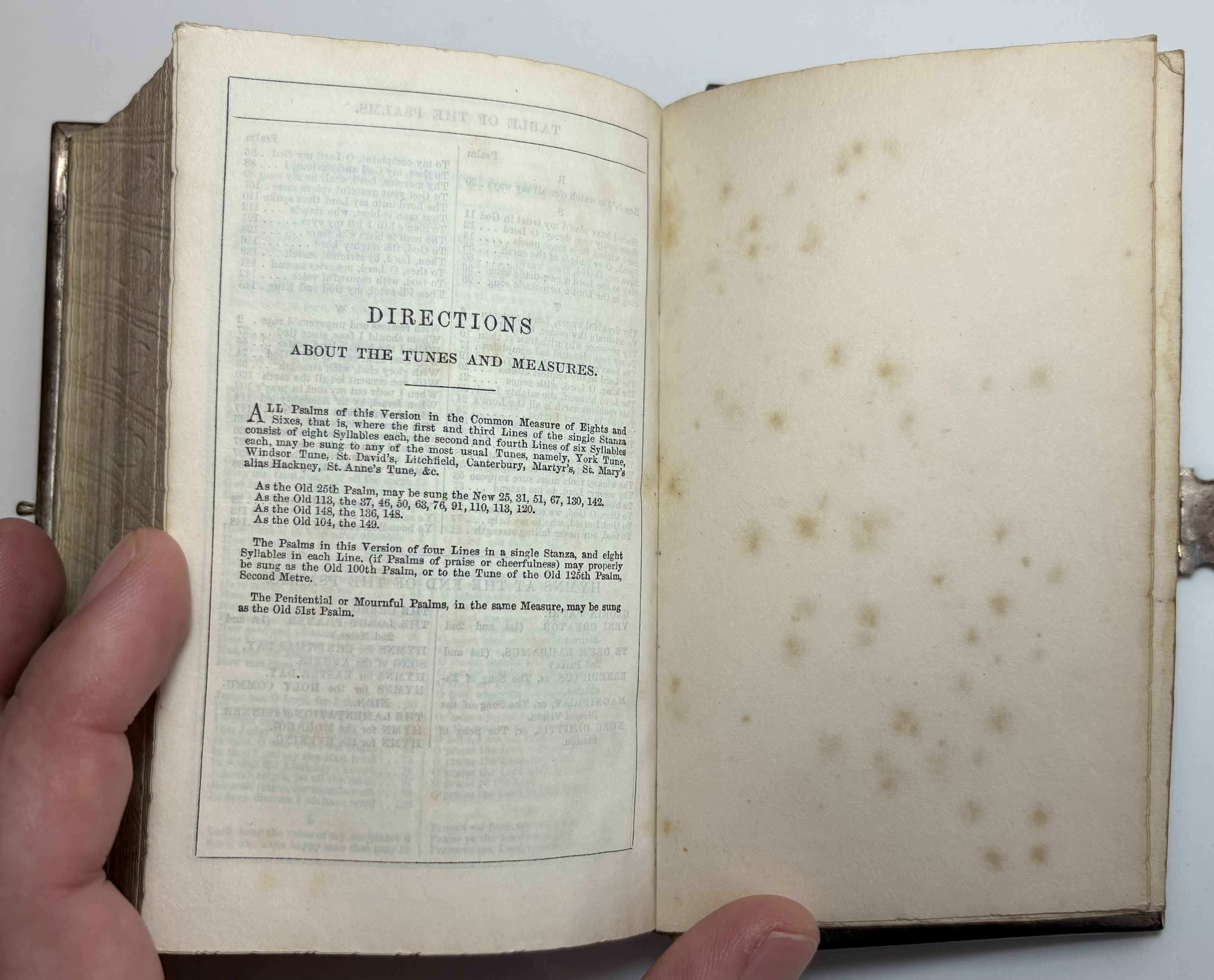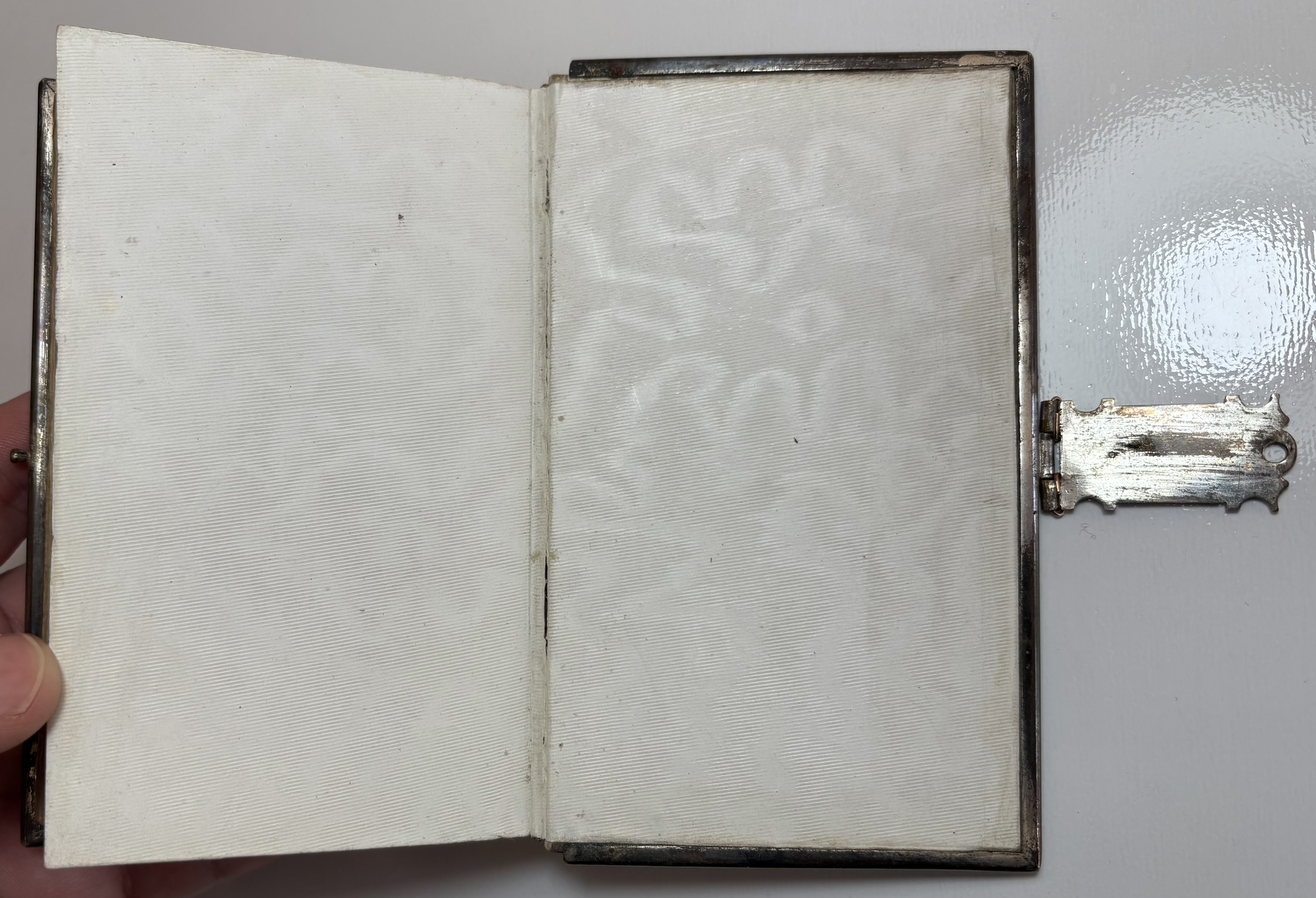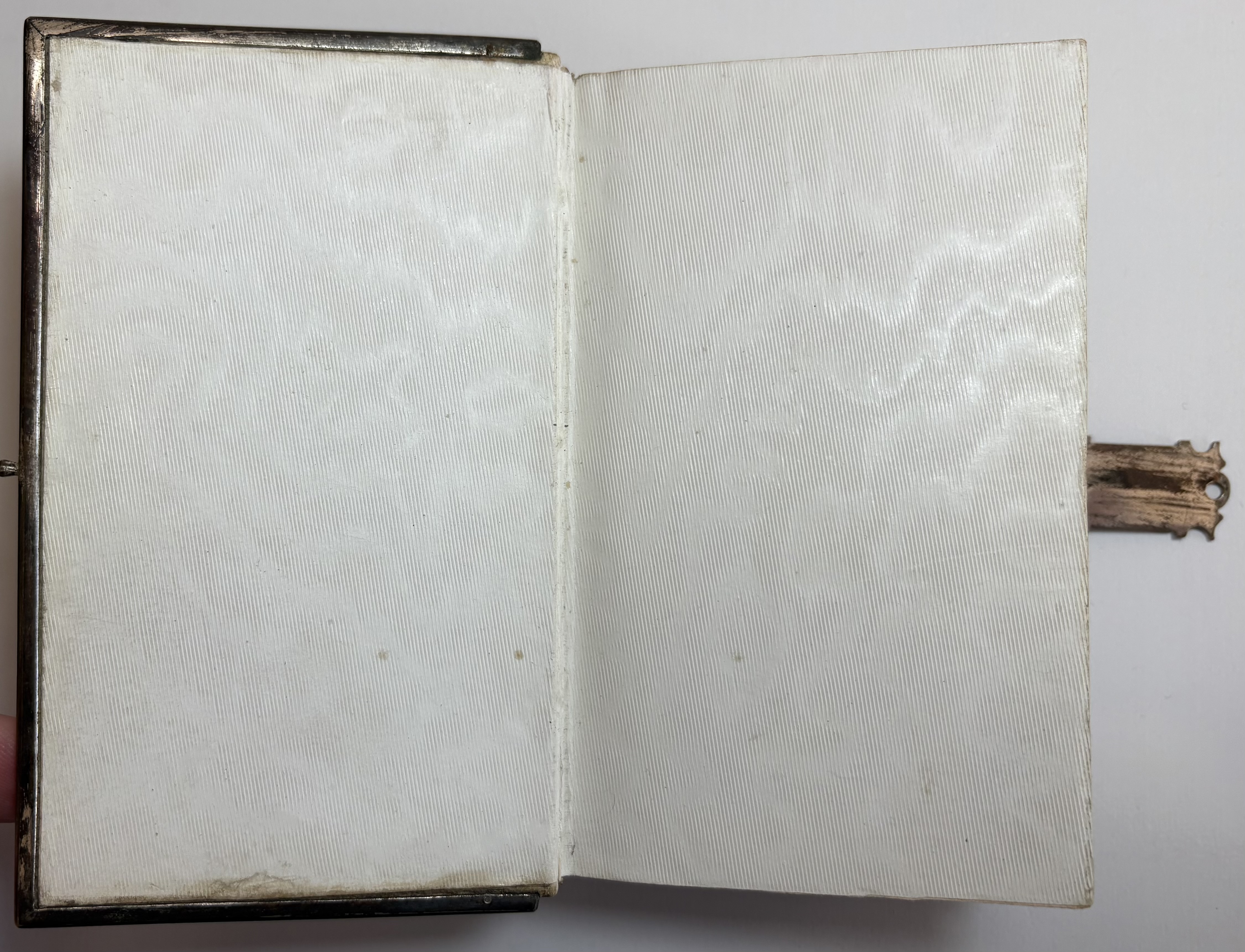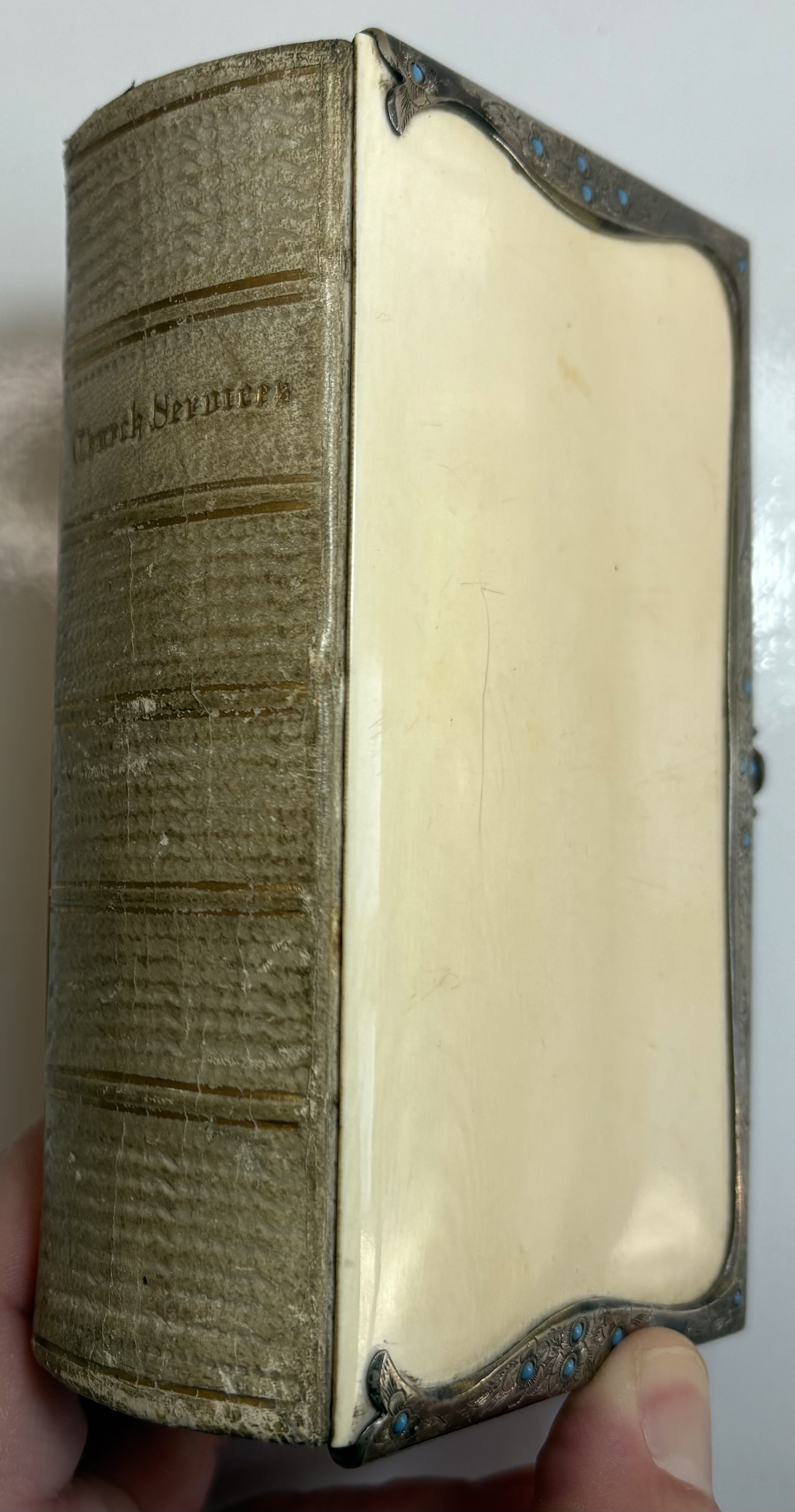 Various signs of age, use and wear. Ivorine boards have yellowed with age, some noticeable scratches and marks. Light brown leather spine faded, shelf worn, along with a few scuffs. Gilt title and lined raised bands a little faded. Joints holding well, strong with no splitting. White metal decorated edging in good condition, possibly silver but no hallmarks present. Some discolouration or patina of the metal in parts. Slight soiling/dirt running along where the edging is pinned to the boards. All original blue stones present except one on the clasp. Edging all firmly pinned to the boards and joined securely together with the clasp. Lacking original pin in the clasp hinge, replaced by the previous owner with metal wire bent through hinge and secured. Hinge in good working order. Gilt gaufferered page edges in good condition, attractive design, slightly faded/scuffed.