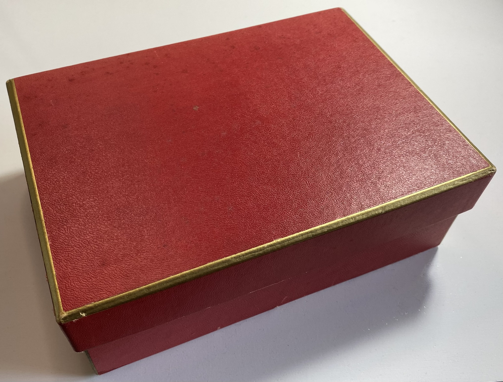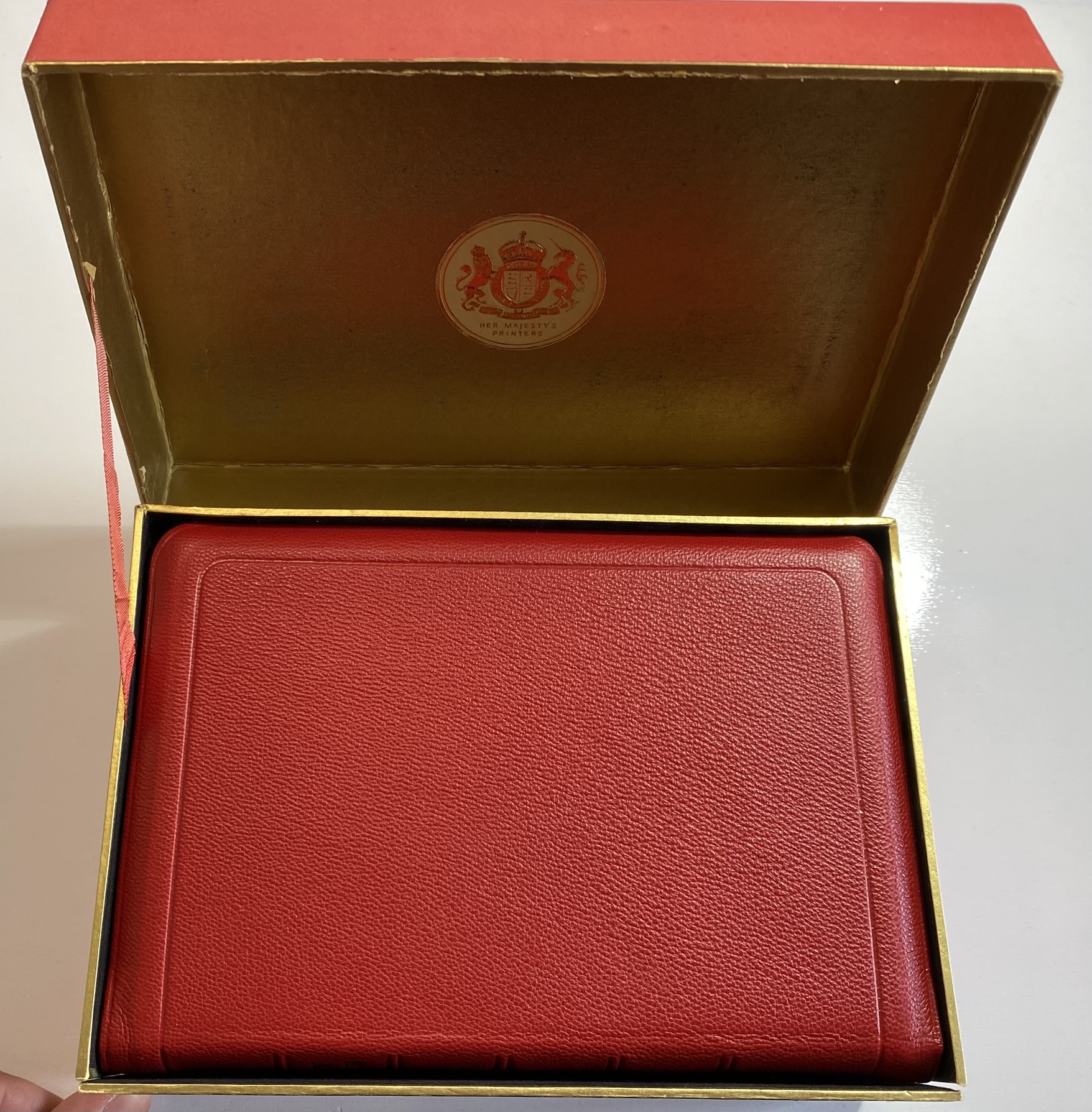 This set comes in its original cardboard box. The red exterior with gold edging has discoloured with age, some noticeable marks and scuffs, the rear is particularly sunned. The bottom has a small surface torn section, this does not affect the structure and is surface level only. The box remains in solid functional condition and has protected the books within very well. The top lid opens with strong hinge and red ribbon support. A gilt Eyre & Spottiswoode Royal Seal emblem is attractively stamped central to the gold underside of the lid. The front flap of the box has been designed to open out flat when the lid is lifted. This reveals a soft black velvet lining, with the smaller Book of Common Prayer housed at the bottom, cushioned either side with velvet blocks. The "Shelf" above is hinged, allowing for better access to the Common Prayer. The Holy Bible sits perfectly on this upper shelf. Both books sit very comfortably within the box, very well produced and has protected the books wonderfully.