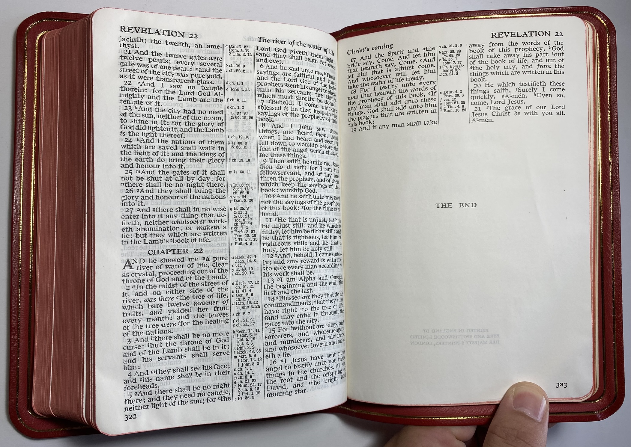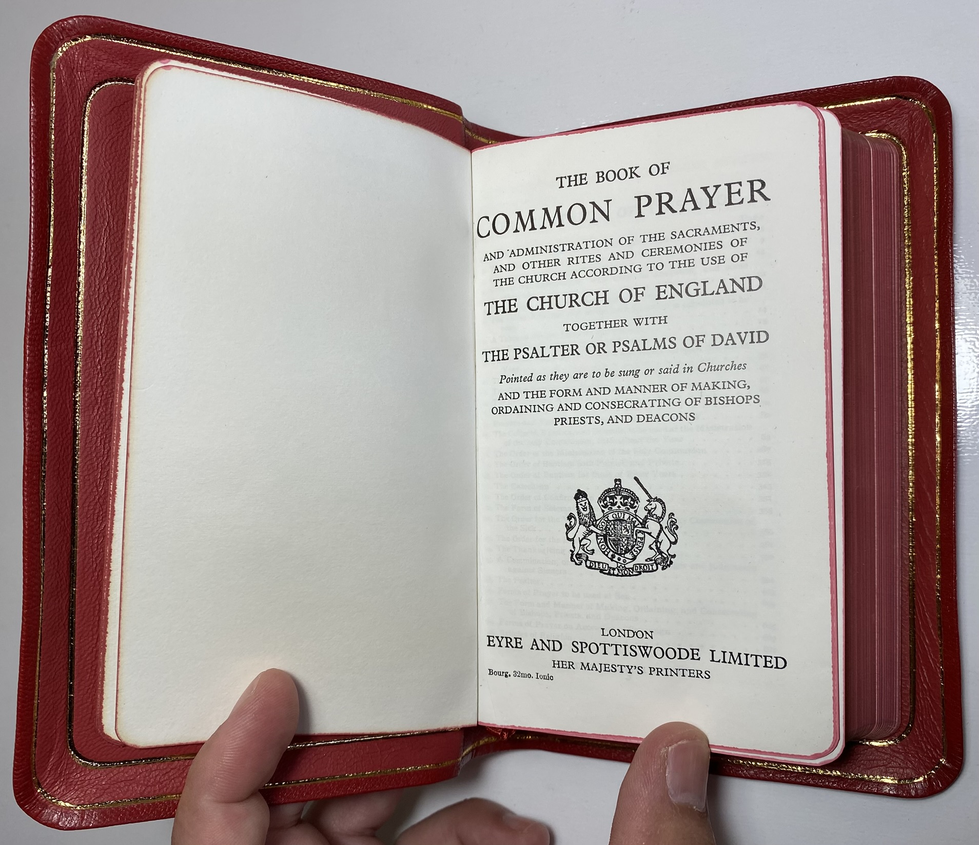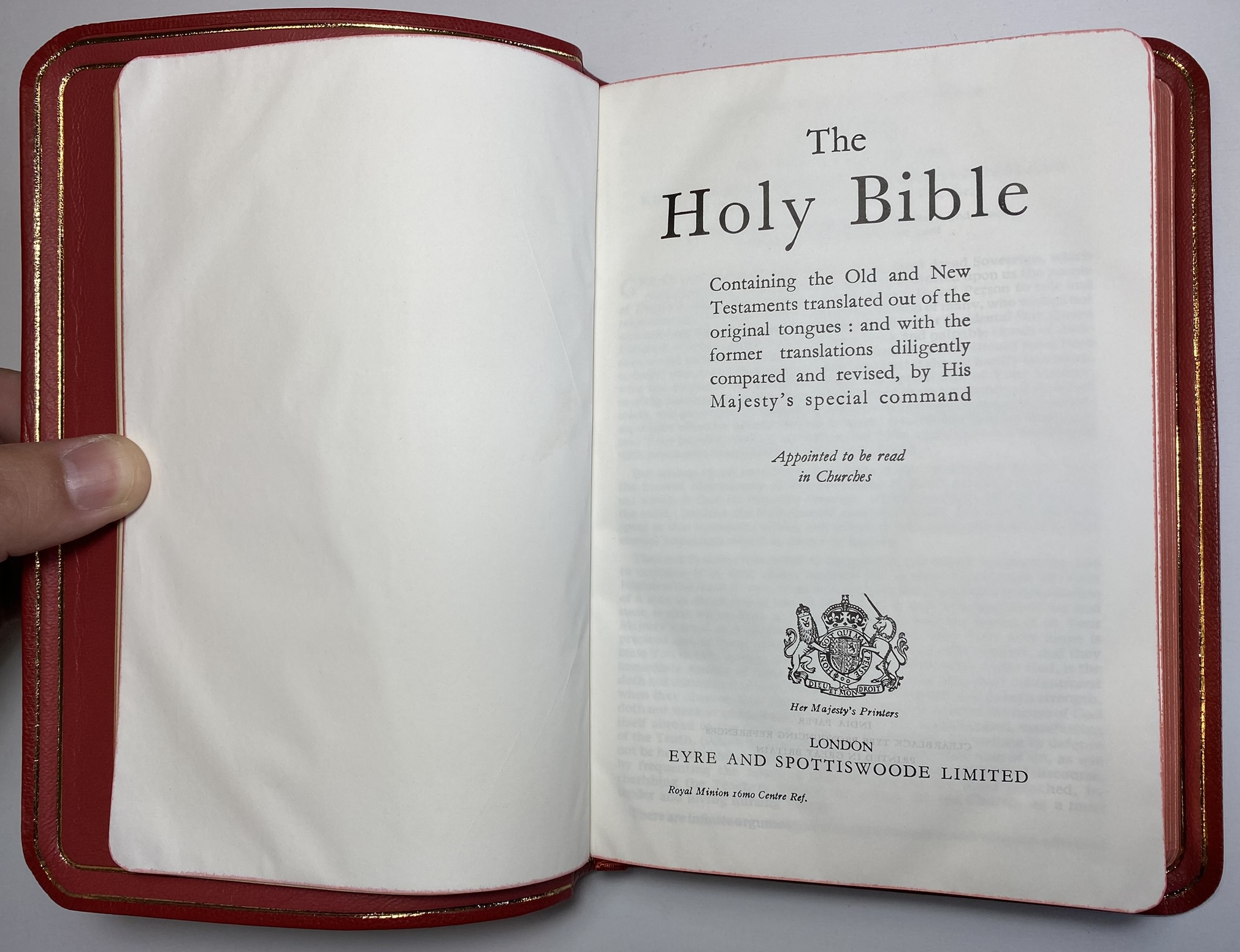 Both books are in remarkable condition for their age, hardly touched at all. These are estimated to have been produced prior to 1970, as Eyre & Spottiswoode ceased trading as a separate entity in the 1970's. Both books are identically bound in a deep red Morocco (Goatskin) leather, with rose gold gilded titles to the spines. The covers are in excellent condition, no signs of wear or markings. Both books have generous yapp edges, helping to protect the contents. The inside covers are leather lined with matching red flyleaf. The outer edges are edge lined with two gilt lines. The text blocks are Nylon sewn. The page edges are red coloured under gold gilt. The gilt remain nice and bright, with just a couple of light marks from handling, the red under gilt really brings the block and the binding together. There are two red ribbon page markers in the Bible, and four in the Common Prayer, all remain in excellent condition. The text blocks are clean and bright, with no previous owner inscriptions, notes or highlighting. The thicker card stock blank end papers at both front and rear of the books have developed some age related foxing, not uncommon in early vintage and antiquarian books.