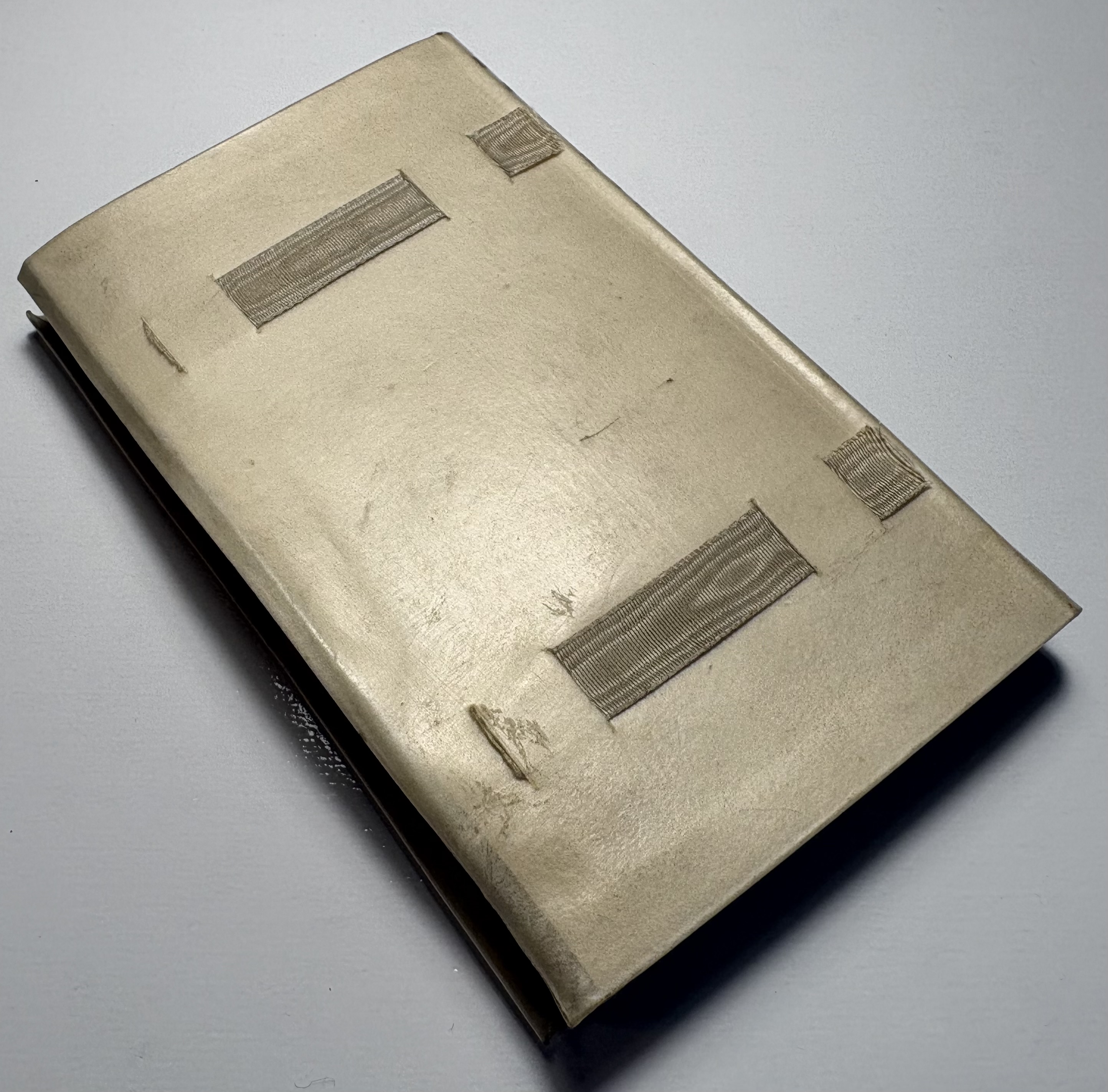 Overall a wonderful little book, beautifully bound in vellum, with high quality Japanese vellum text block. A shame about the missing ribbon ties leading to some warping of the covers. With time, and placed between books on your book shelf, the warping may improve.