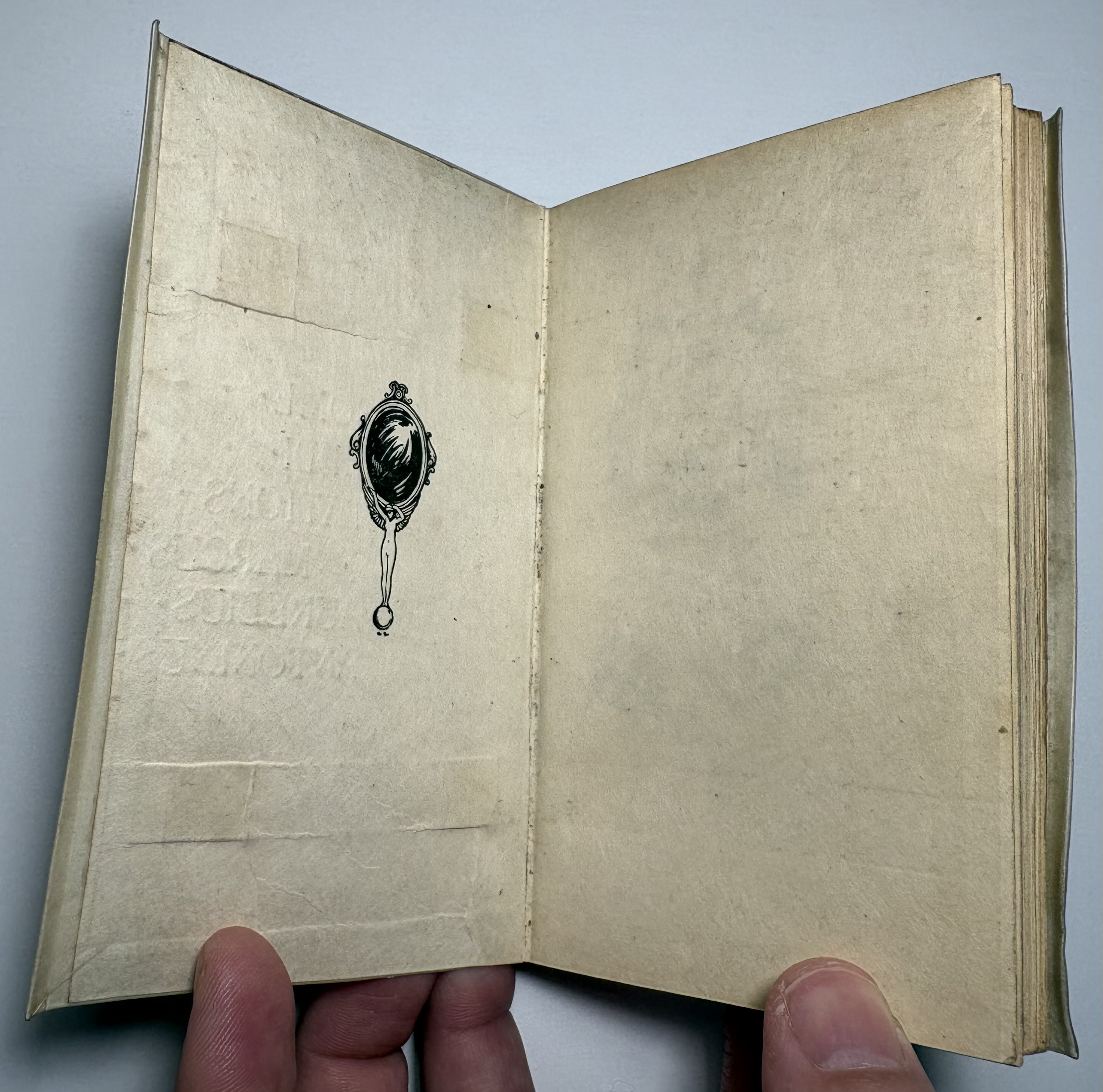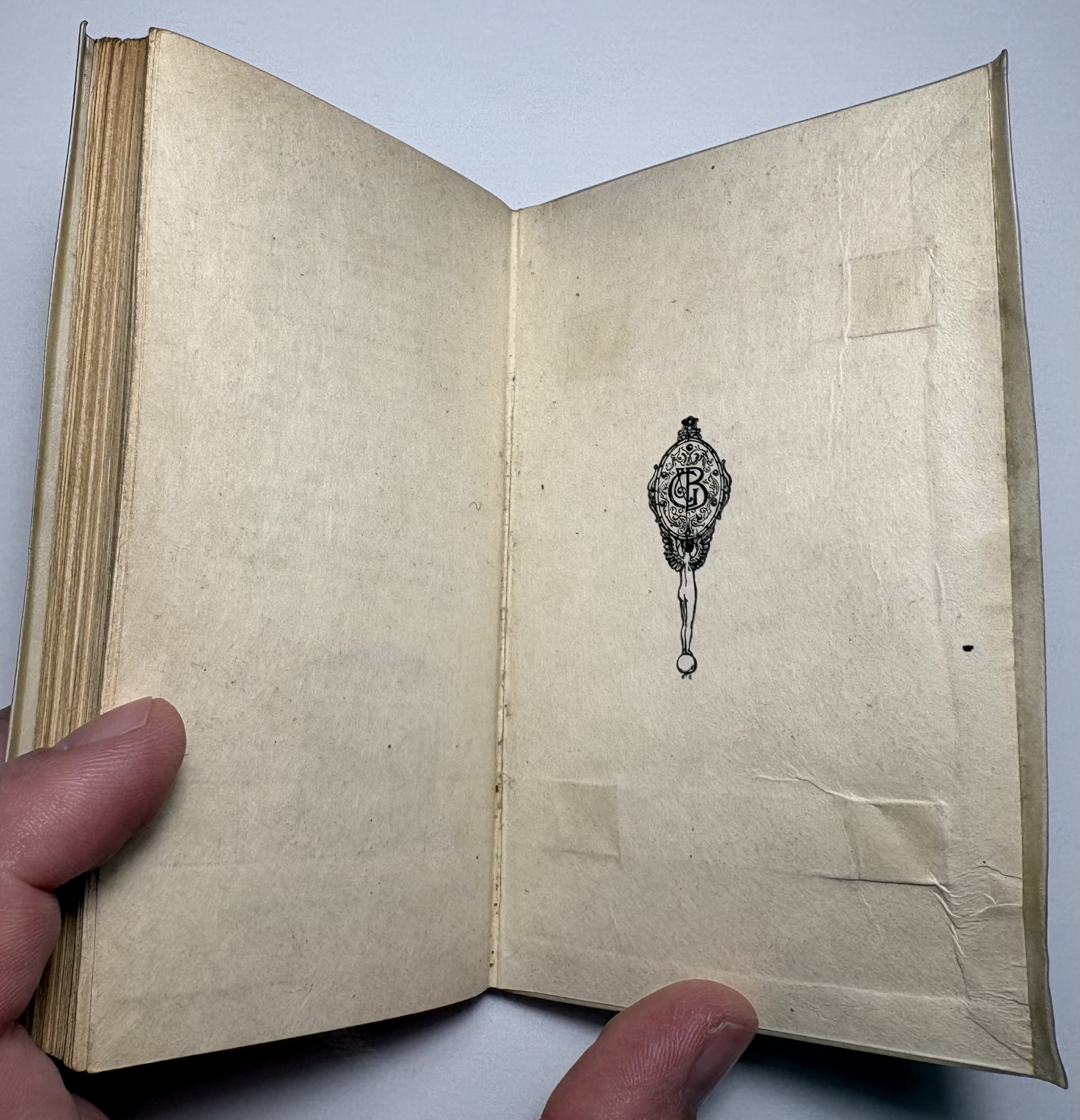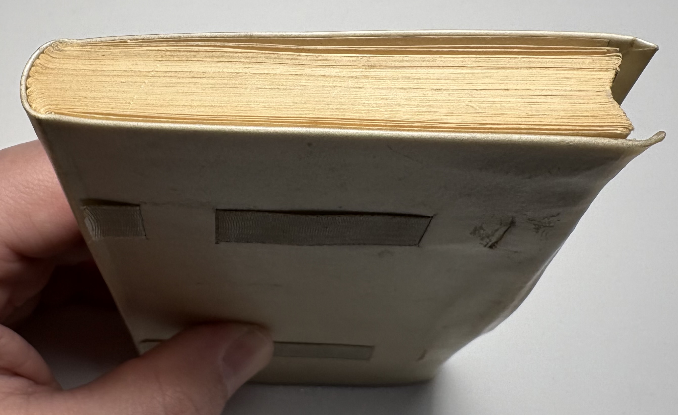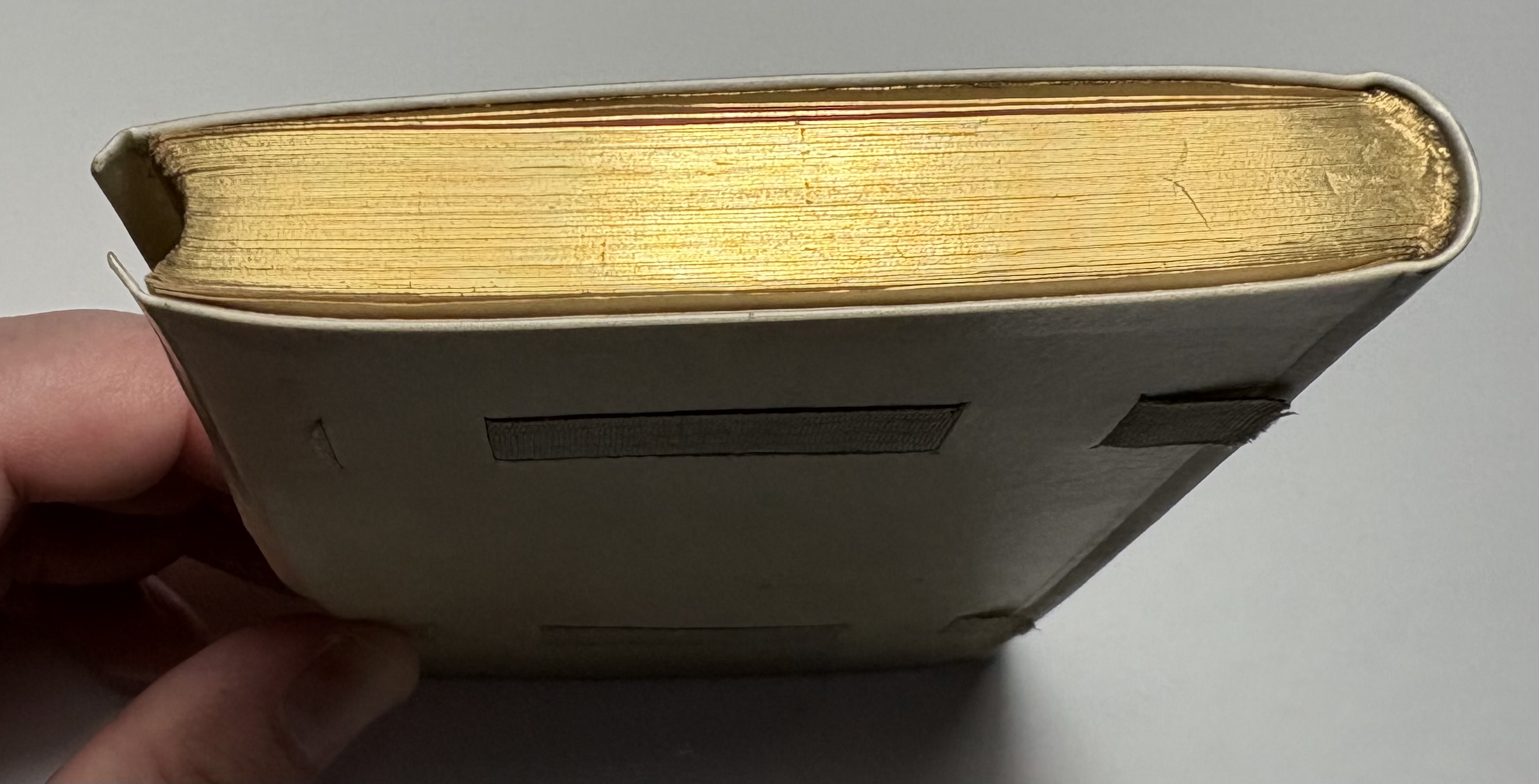 The creamy vellum binding is good, some light marks and rubbing from handling. Gilt title on upper board and spine remains bright and legible. Joints good, sturdy with no cracking. Fore-edge of both boards have slight overhanging yapp edges, rear board yapp edge a little warped. Ribbon has been bound into both boards, with some loss of the ribbon at the fore-edge ends, presumably where there used to be loose ends that would tie together to keep the book closed. Through age and use these have broken away from the binding and are no longer present, as a result the vellum covers rise and warp slightly. A common occurrence with limp vellum covers, and why the ribbon ties were included originally. Vellum has a high sensitivity to moisture and environmental changes, it reacts to humidity by expanding, contracting and distorting.