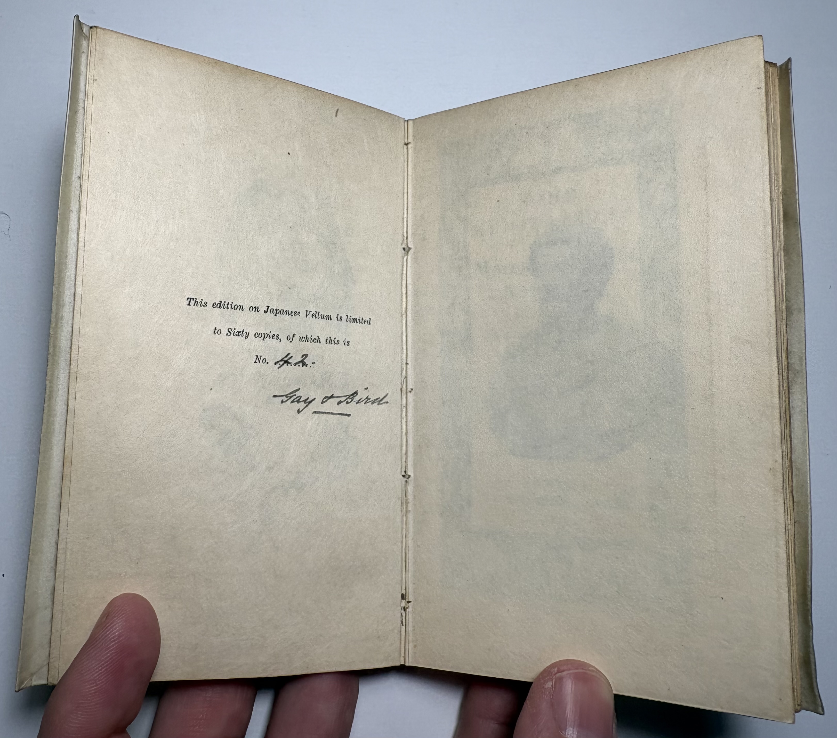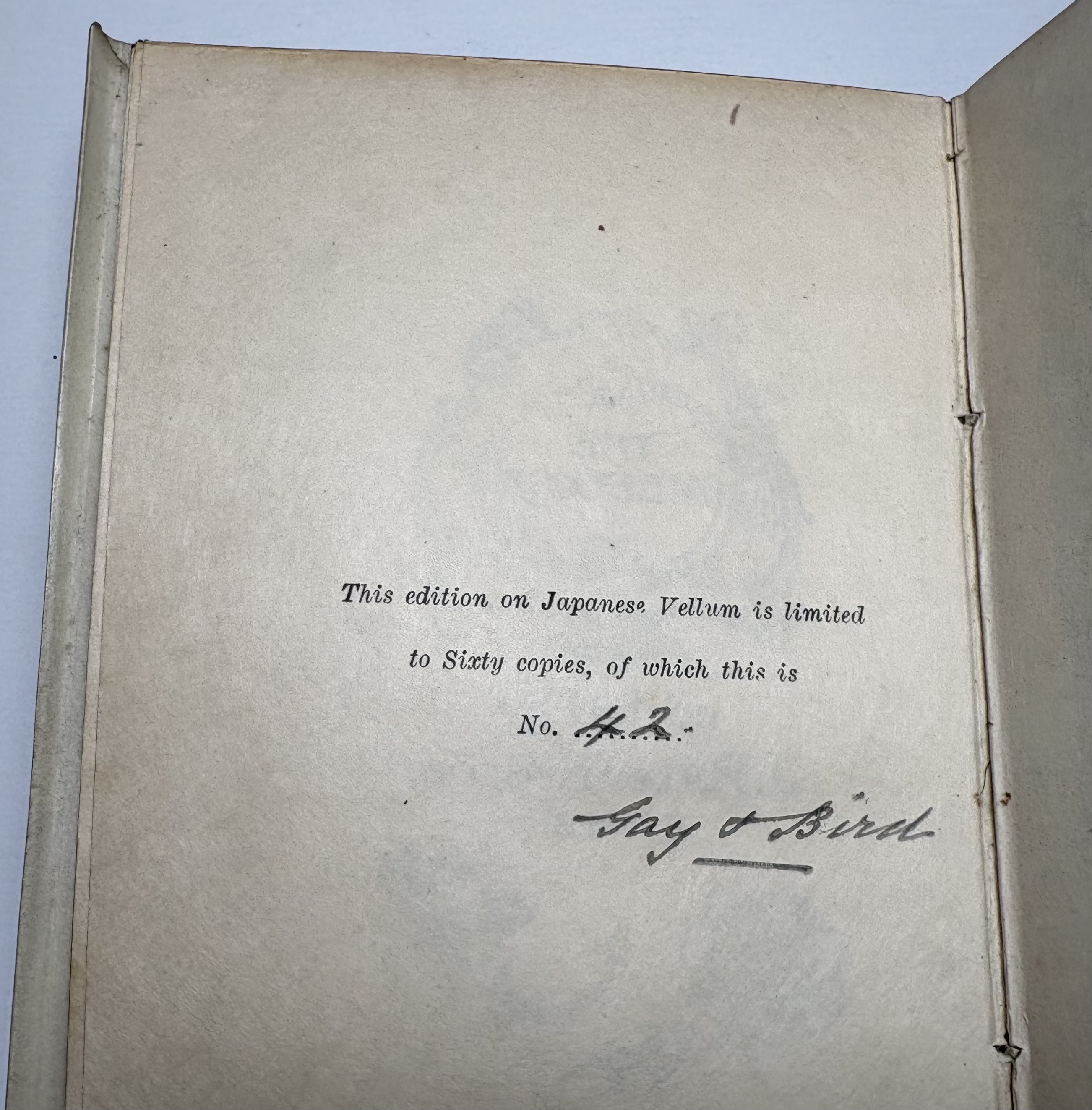 This edition on Japanese Vellum is limited to Sixty copies, of which this is no. 42.