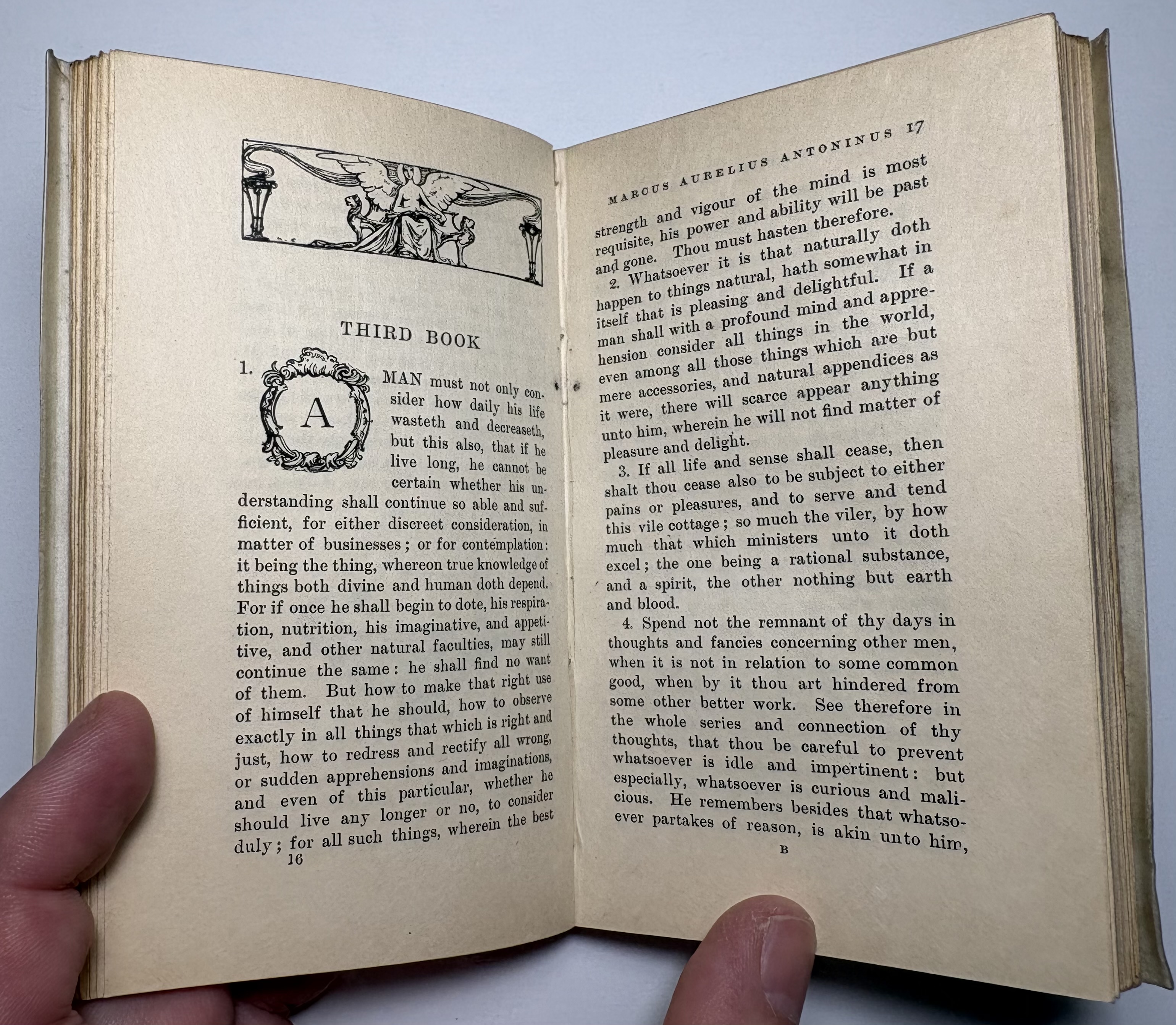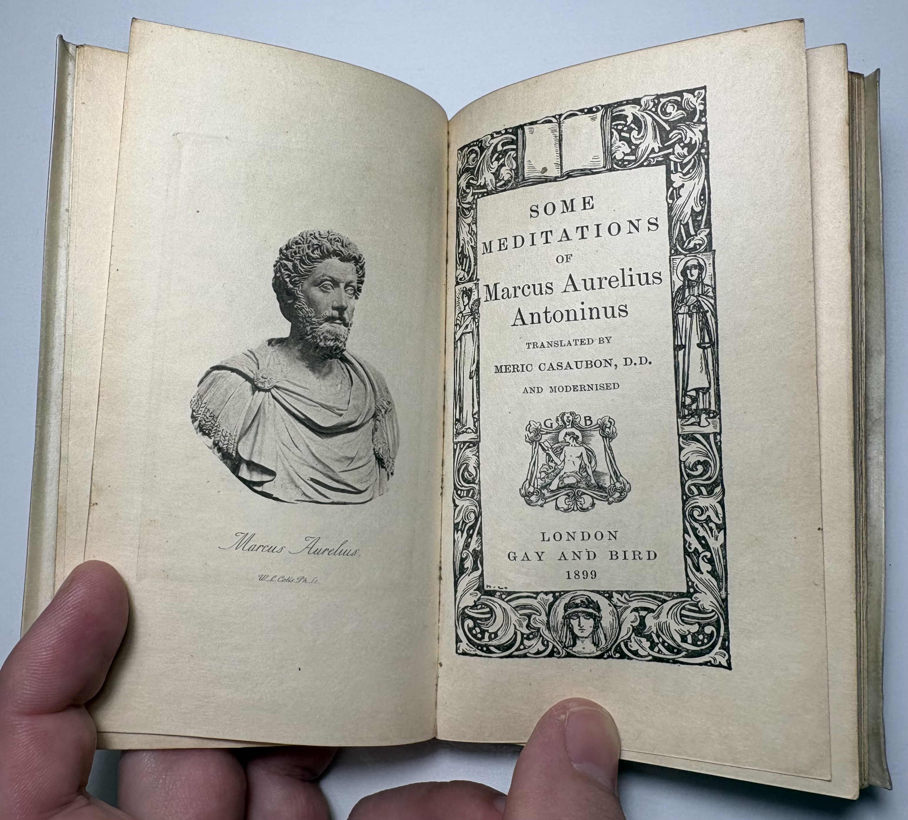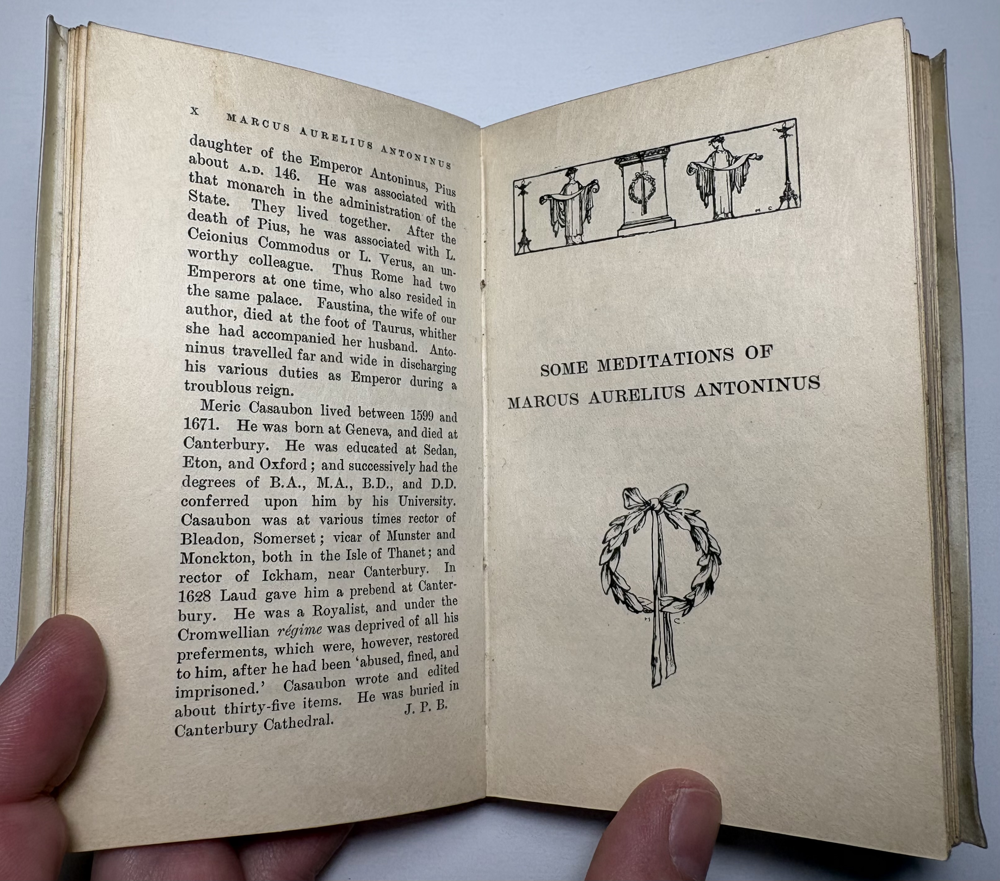 This Bibelot (A miniature book, especially one that is finely crafted) contains the substance of Marcus Aurelius' Book of Meditations concerning Himself, or Golden Book, expressed in the language of Casaubon's translation, or rather paraphrase. The text is that of the second edition of that version, published in 1635, with such omissions as were necessary to bring it within the limits of a volume of this series, without the annotations of Casaubon, and with a few slight alterations in punctuation, the spelling throughout has been modernised, and some proper names have been altered. The work has suffered very little, if any, by abridgment; in fact, it has been made more generally readable by the process. The title-page of the second edition of Casaubon's translation is enclosed within a double-mitred border.