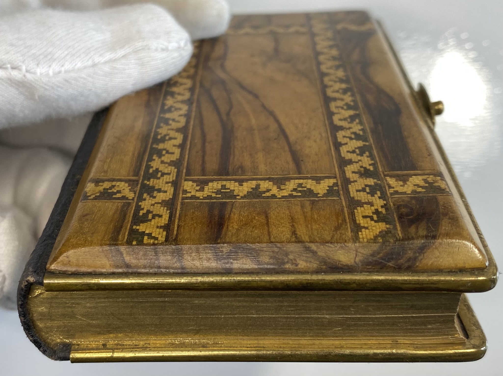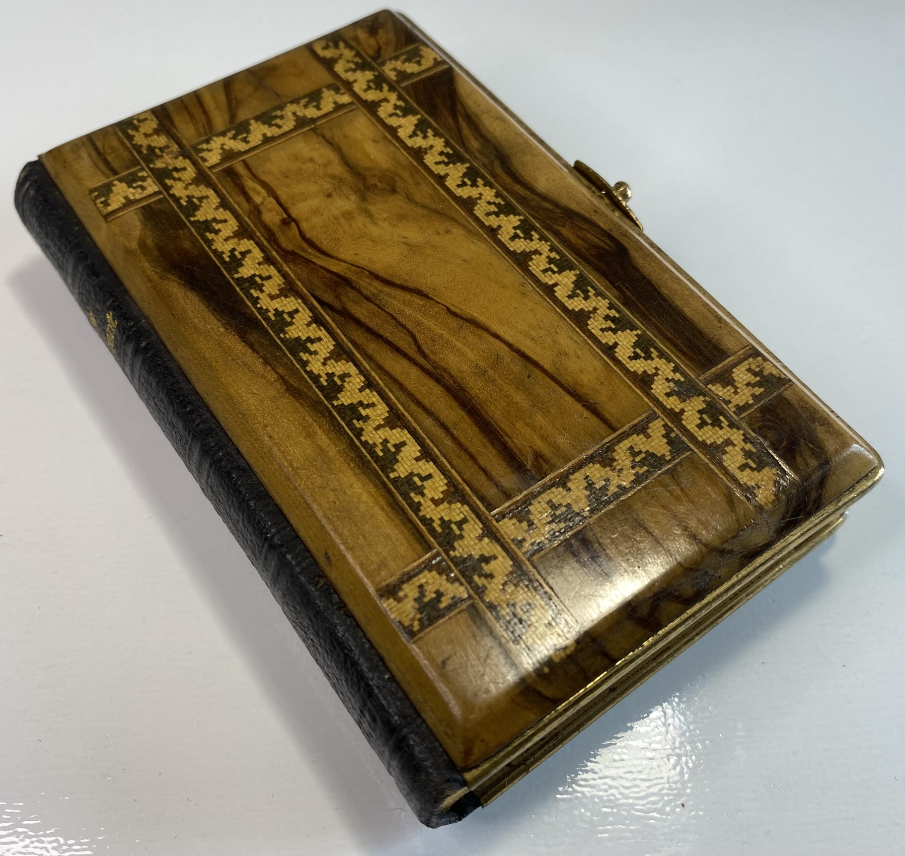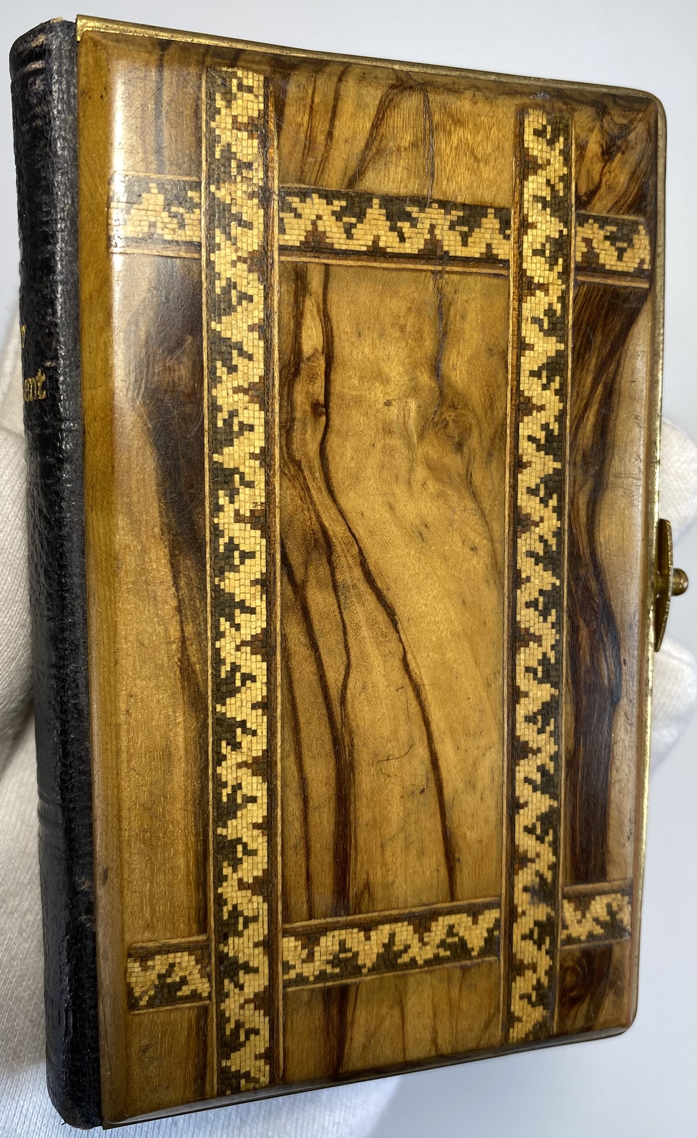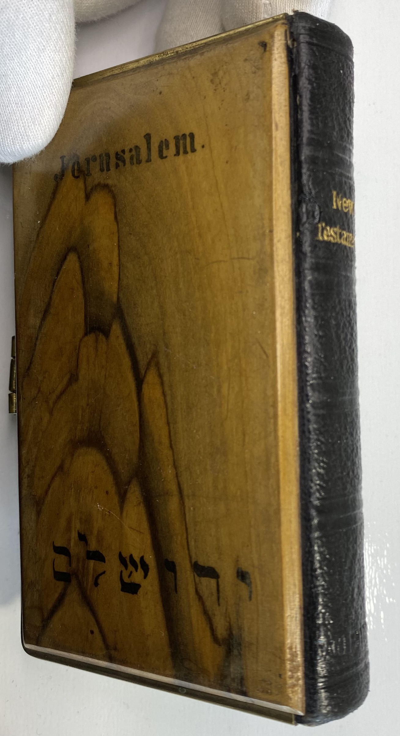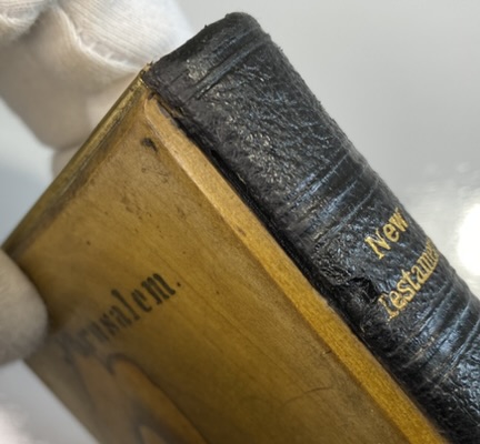 Some clear signs of age, use and wear. The Olive Wood boards show significant scuffing and scratches. Front board has lacquered sealed strips of a mosiac pattern around the edges. Rear board has faded Jerusalem title. Both boards are mounted to brass edging, with clasp. Clasp still in good working order, although the hinge has slightly shifted and a little loose. Brass has age related patina. Black leather spine with gilt title. A small circular section of loss of surface leather, affecting the gilt title of Testament.