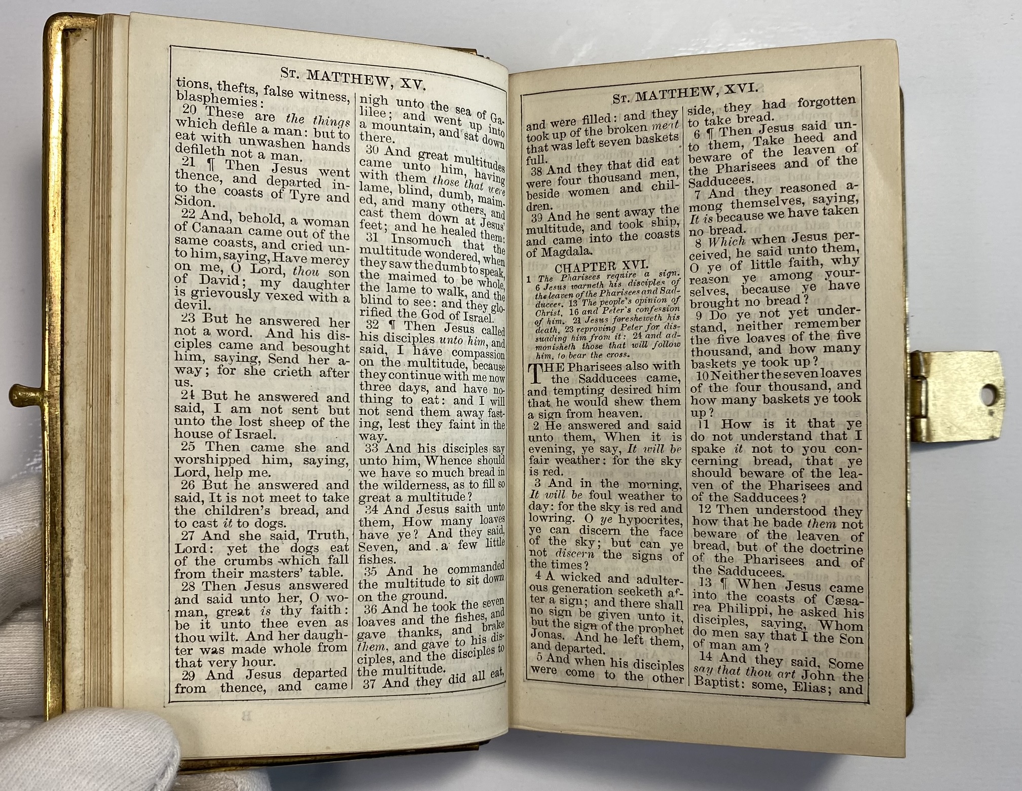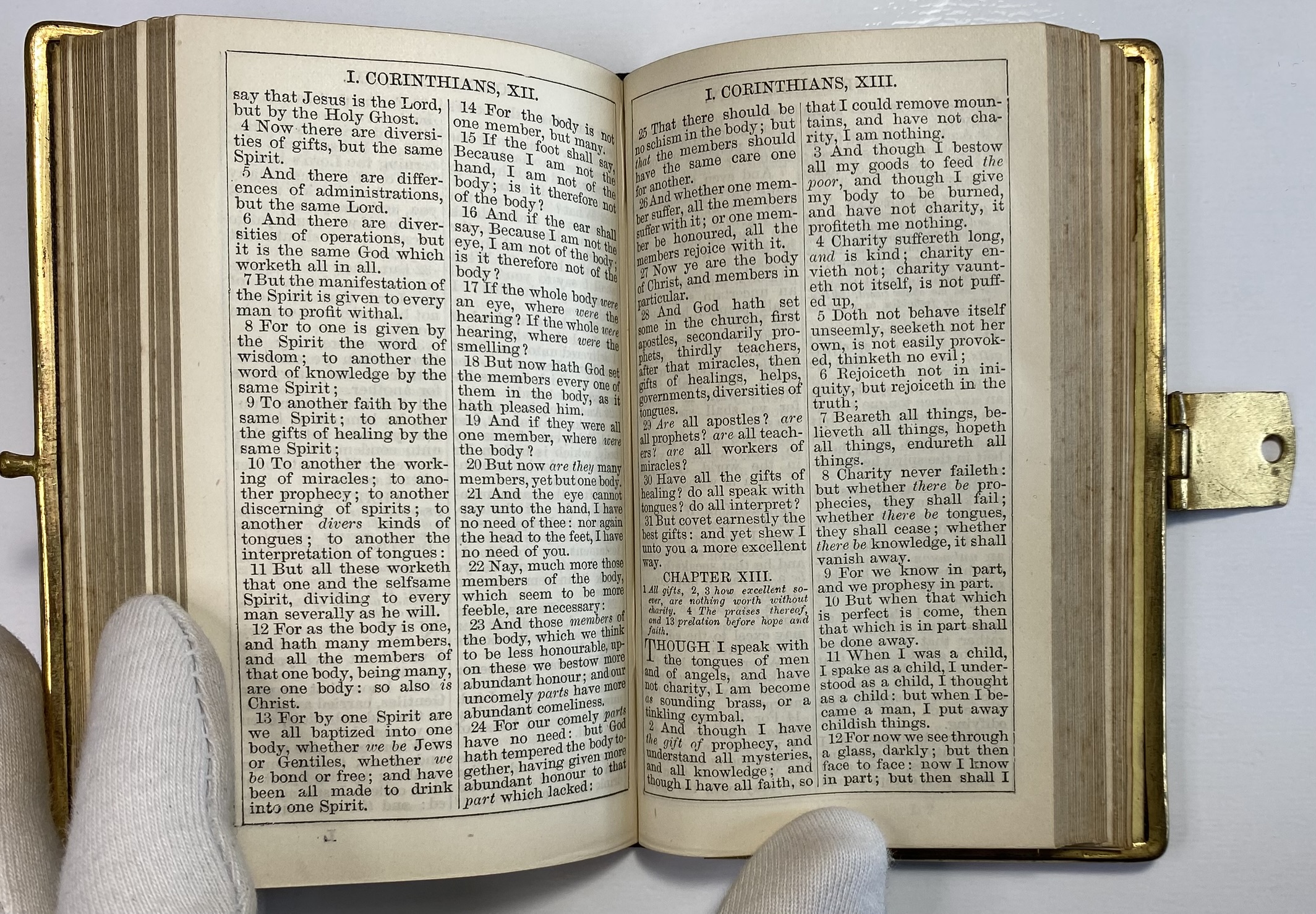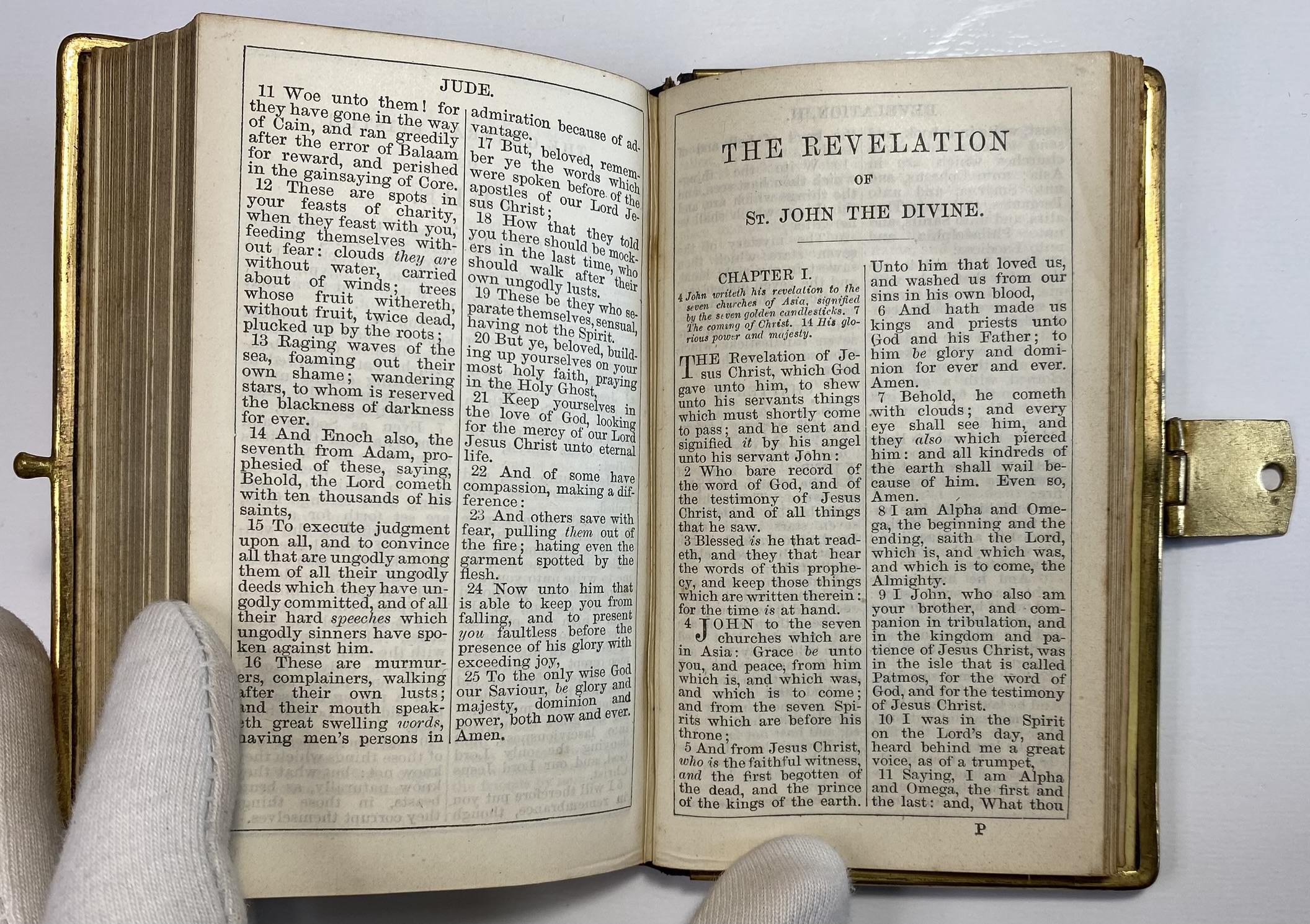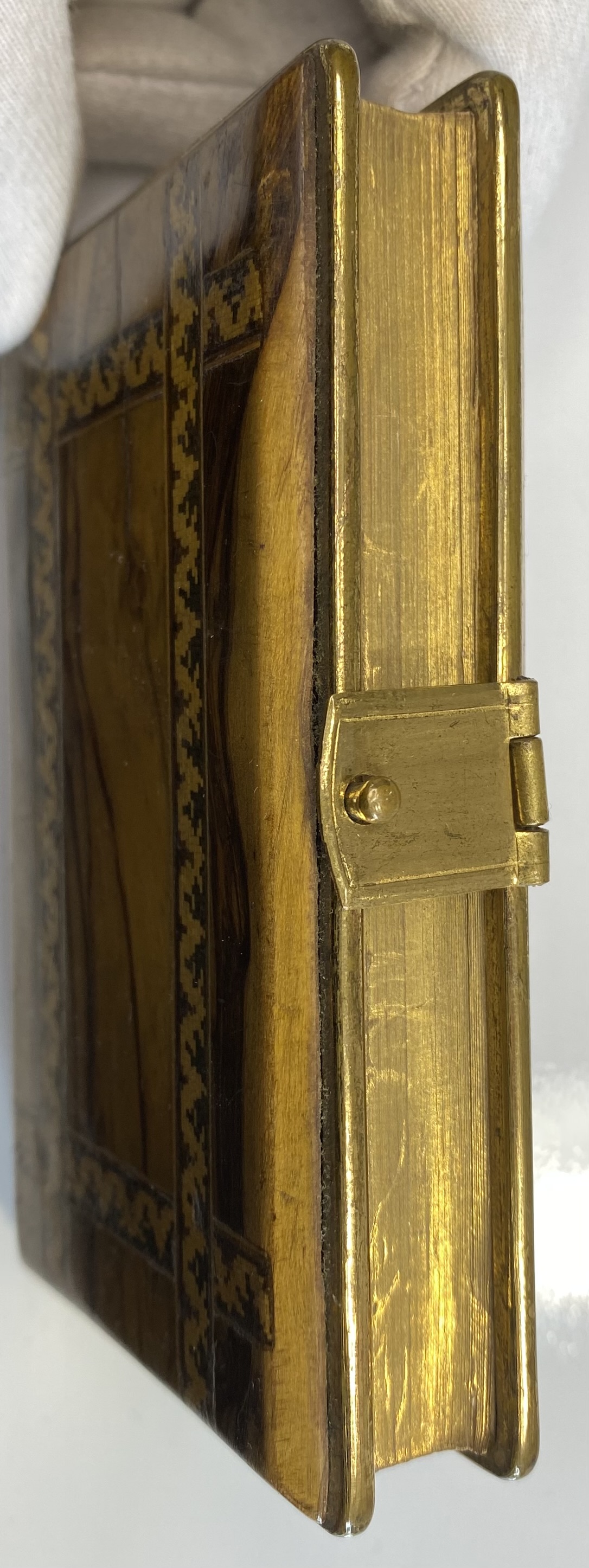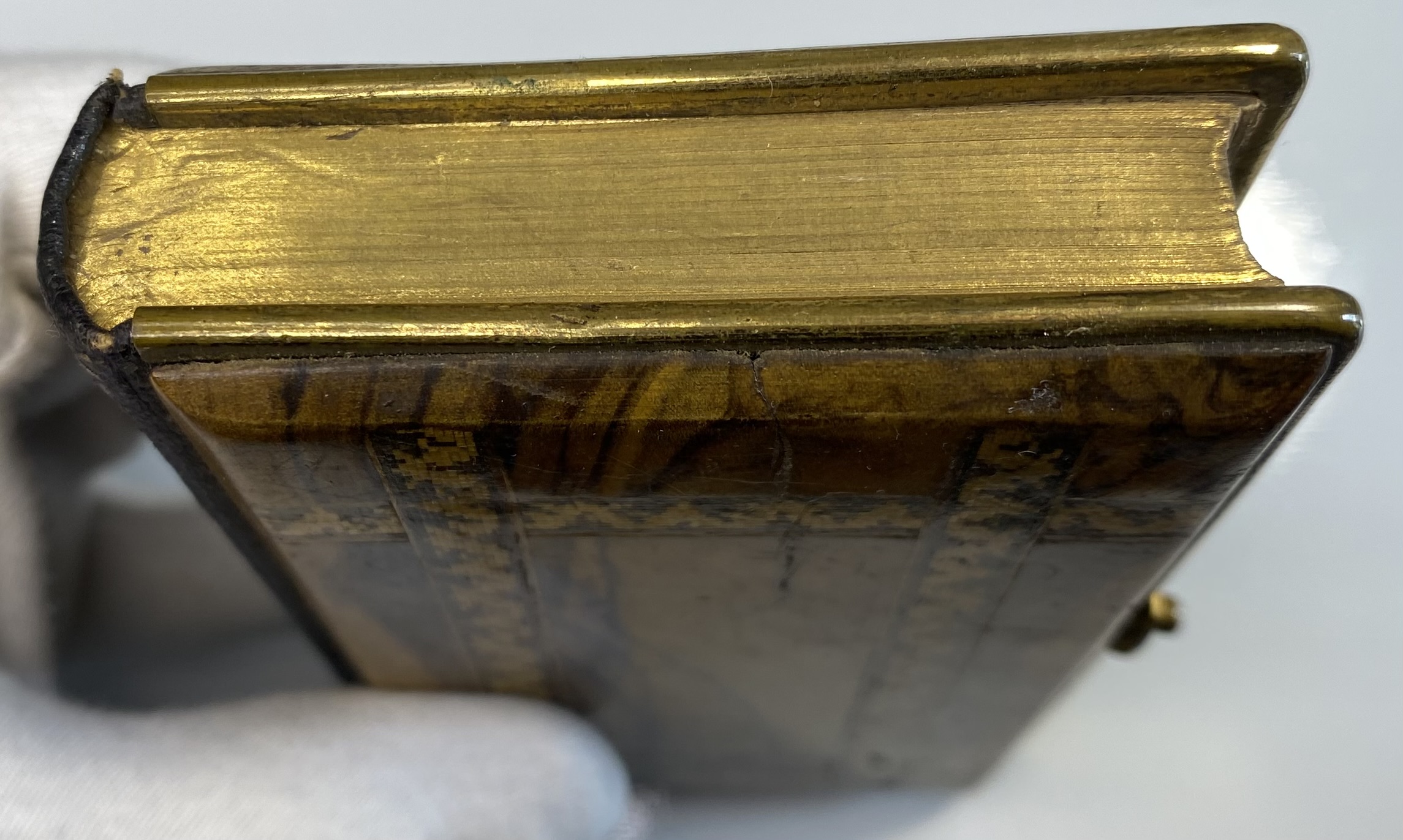 Some clear signs of age, use and wear. The Olive Wood boards show significant scuffing and scratches. Front board has lacquered sealed strips of a mosiac pattern around the edges. Rear board has faded Jerusalem title. Both boards are mounted to brass edging, with clasp. Clasp still in good working order, although the hinge has slightly shifted and a little loose. Brass has age related patina. Black leather spine with gilt title. A small circular section of loss of surface leather, affecting the gilt title of Testament.