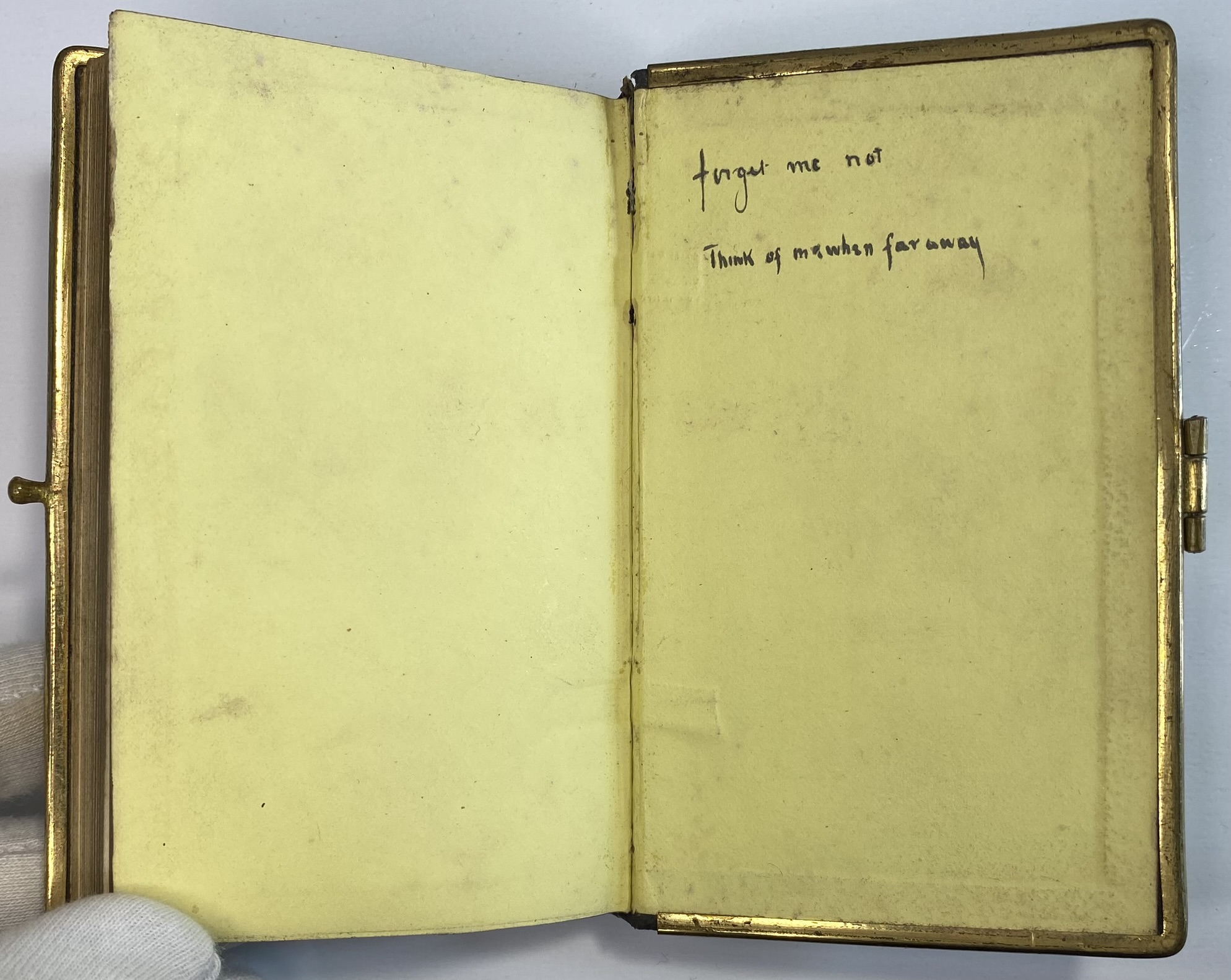 Yellow end papers at the rear, with ink inscription on pastedown "Forget me not, Think of me when far away." Front board flyleaf is stuck or glued down over the yellow pastedown, opening immediately to the title page. Text block is in good reading condition, age related toning throughout, mild foxing also present, mostly affecting the first and last few pages. Minor page creasing from use. All text legible, no further inscriptions, highlighting, underlining or notes. All edges gilt, some fading, scuffing and scratches from handling.