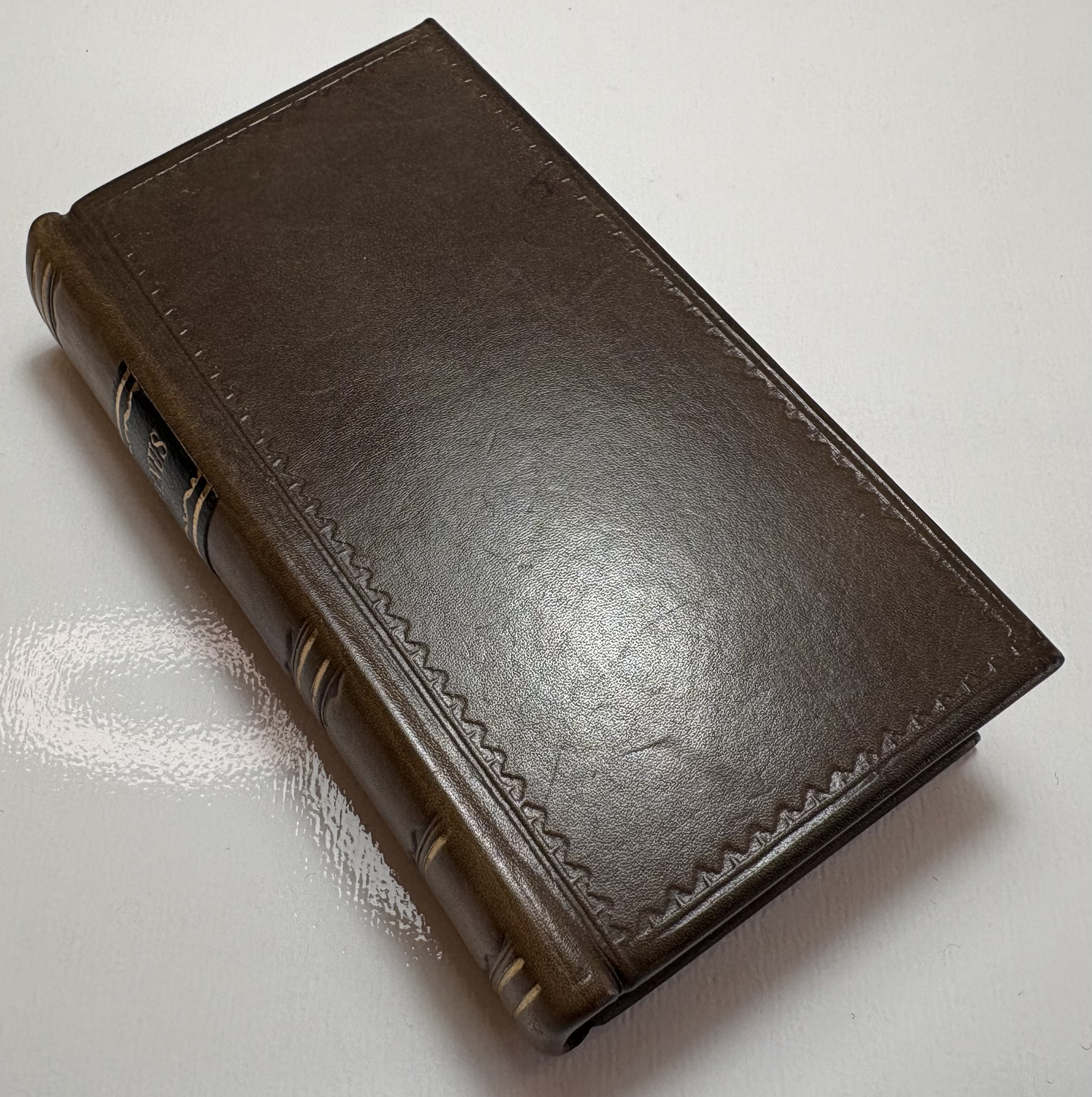 No indication of when the book was rebound. The cover has a few light scratches, spine noticeably sunned. Binding is solid, good firm joints with no splitting. Paste downs/flyleaf good, no hinge splits. Lovely engraved title page. Text block age toned throughout, light foxing, light staining in parts. Text all legible and complete. A couple of small chips/loss of the fore edge margin, not affecting text. No further inscriptions or notes following the full page of notes on the verso of title page. Gilt page edges dulled and scratched with age.