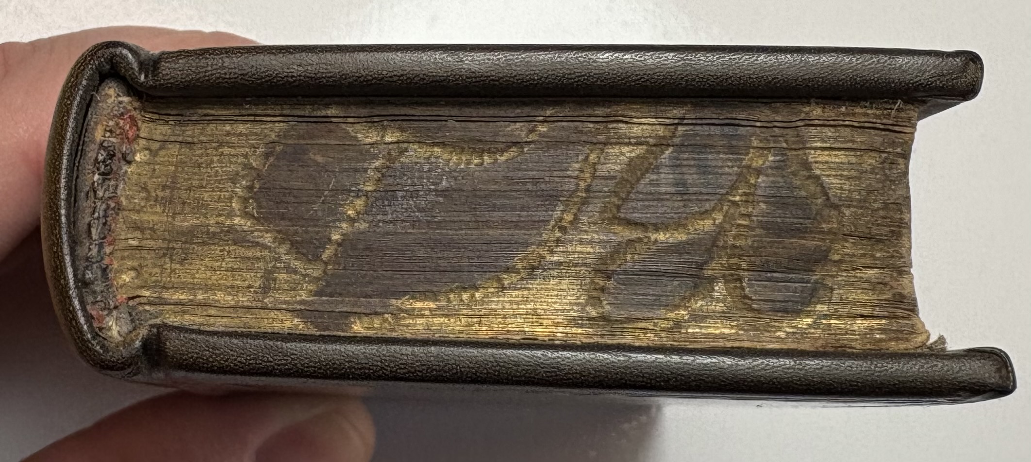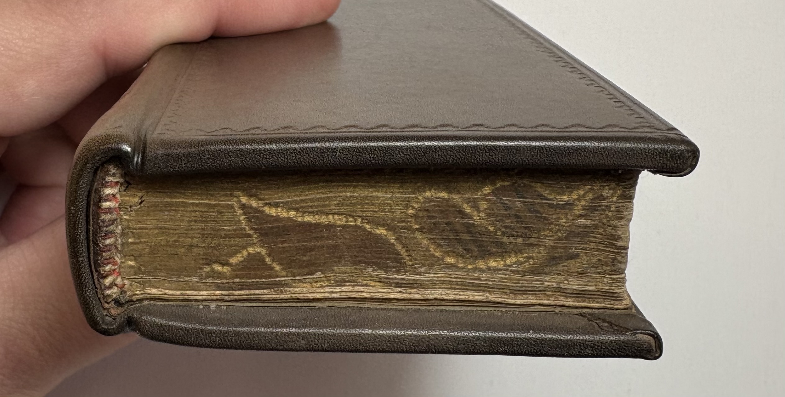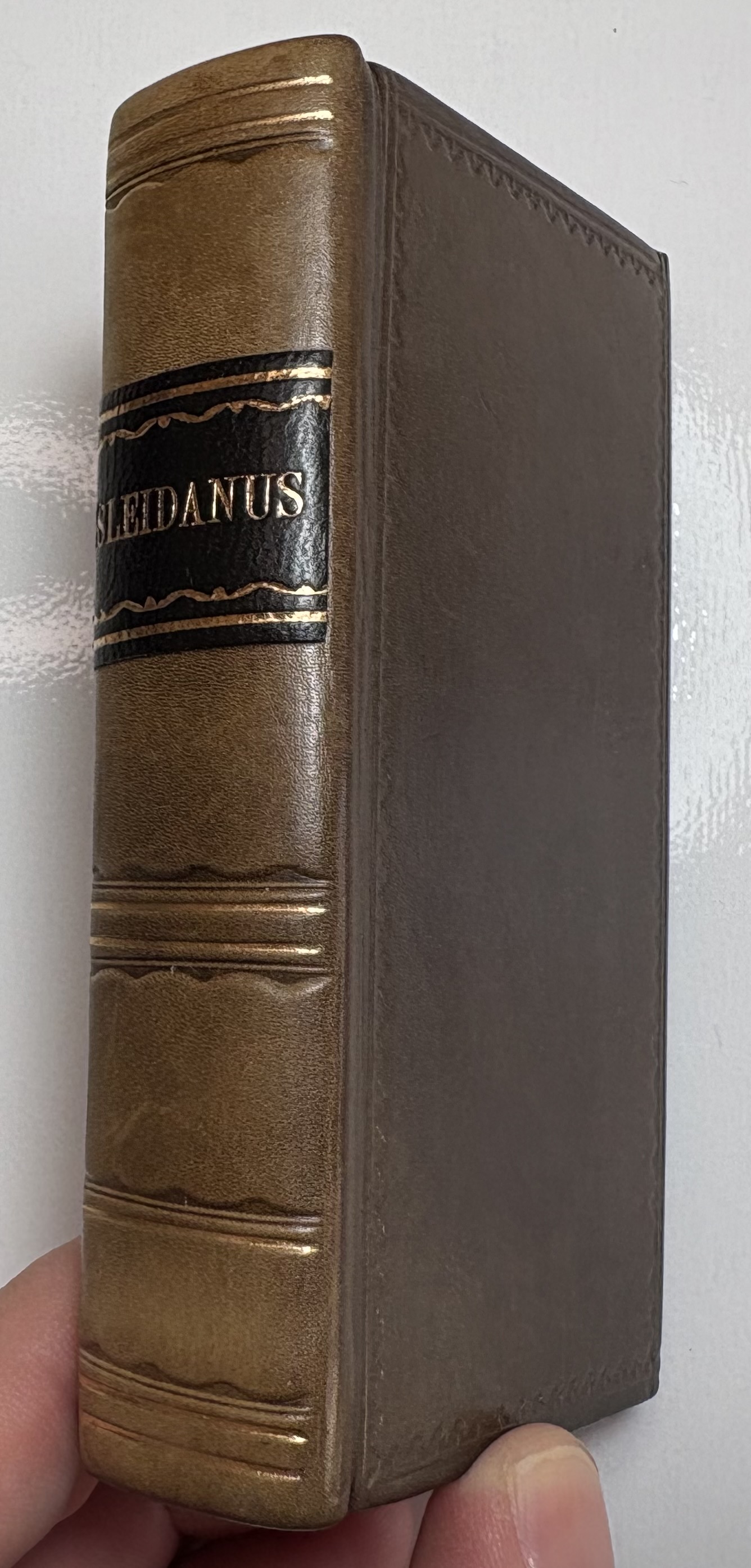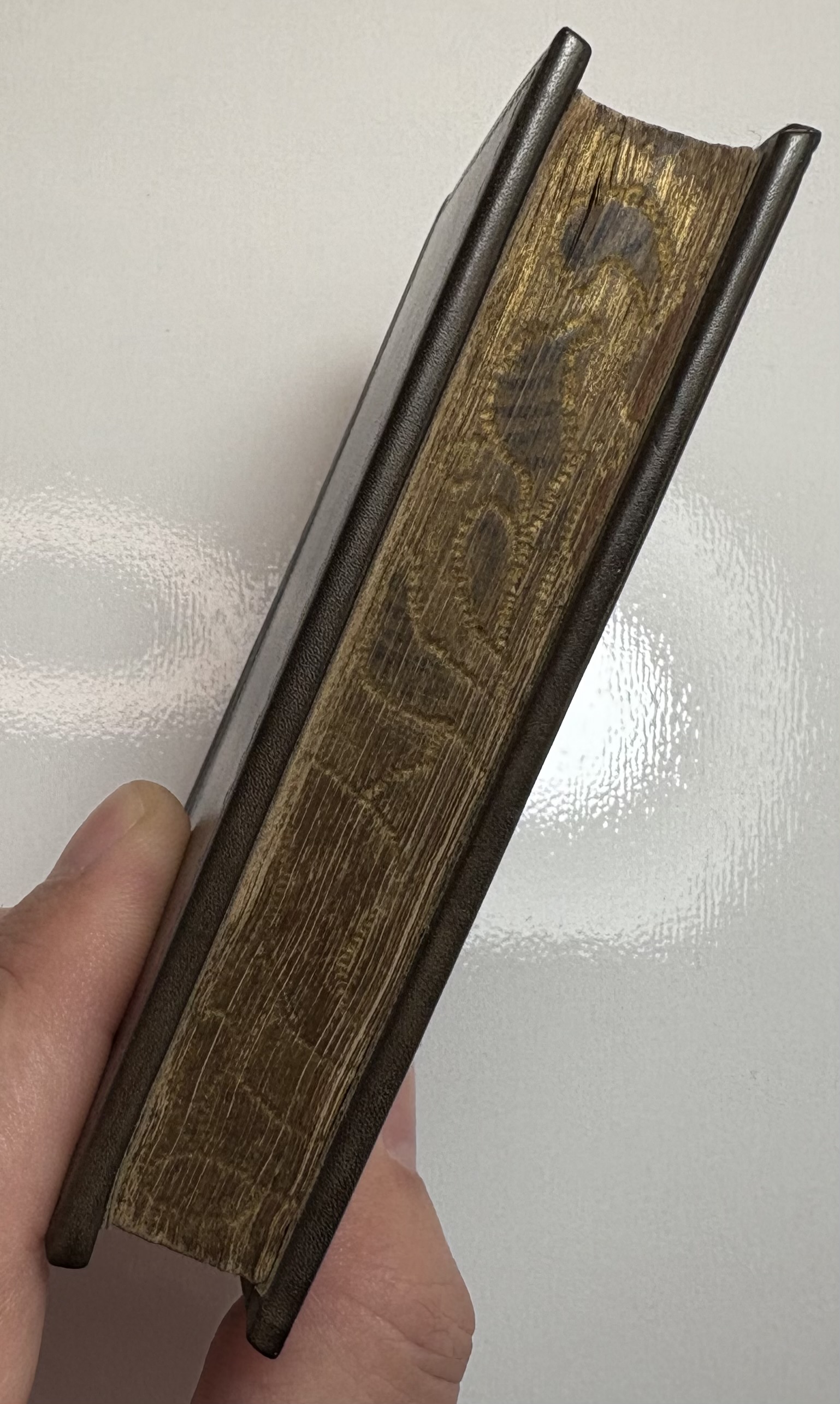The book has been rebound in dark brown leather, black gilt title label on spine, gilt lined bands, replaced paste downs/flyleaf. Unusual gilt gauffered page edges, appears to be floral, rather amateur looking with faint remnants of colour added. Possibly original, certainly not added during the rebind. Full page ink notes written in Latin by original owner on verso of title page.