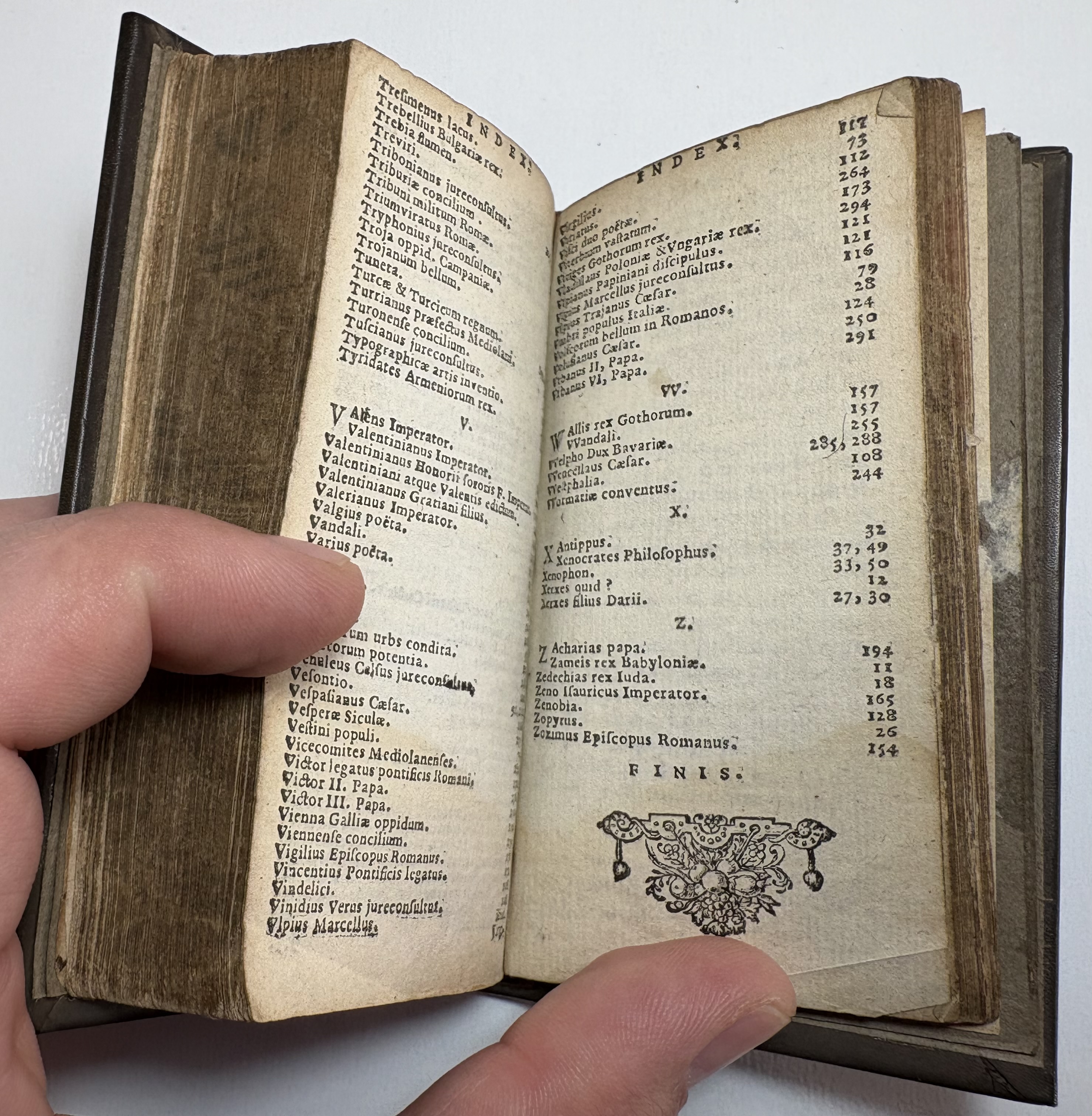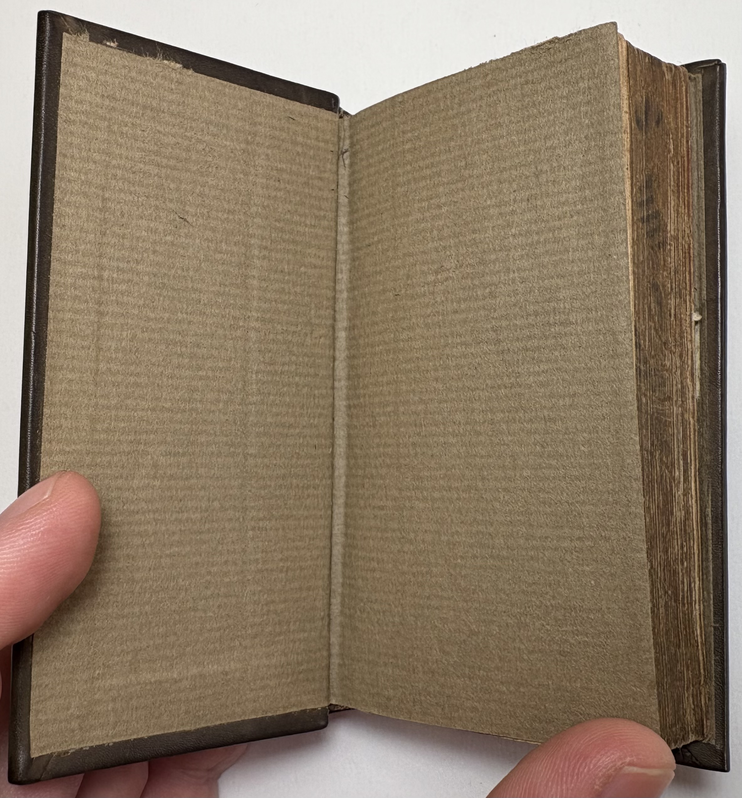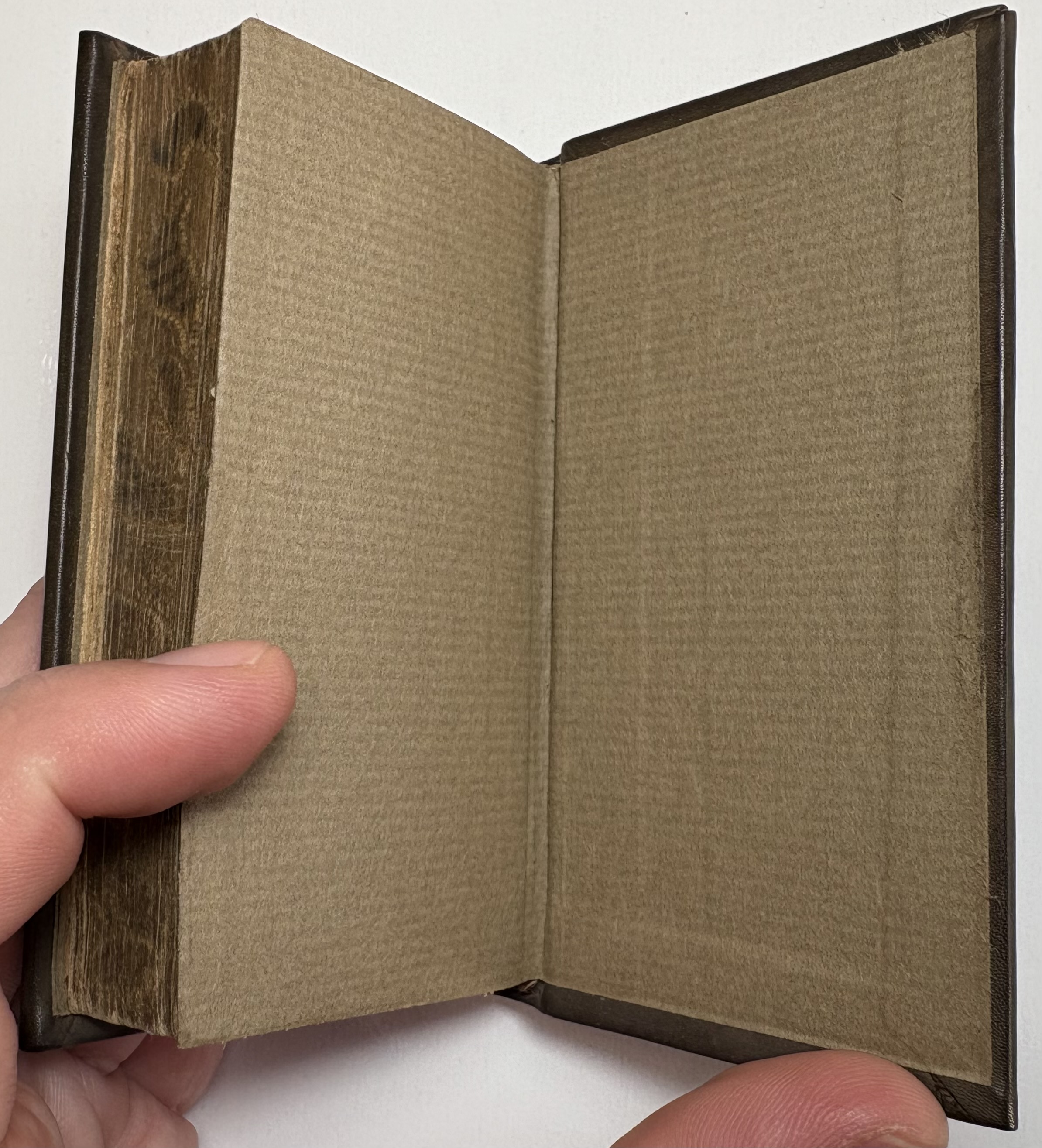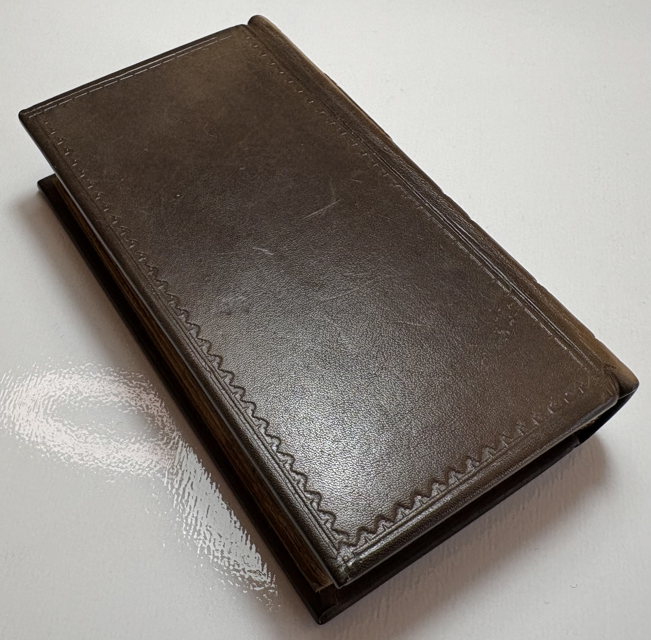 The book has been rebound in dark brown leather, black gilt title label on spine, gilt lined bands, replaced paste downs/flyleaf. Unusual gilt gauffered page edges, appears to be floral, rather amateur looking with faint remnants of colour added. Possibly original, certainly not added during the rebind. Full page ink notes written in Latin by original owner on verso of title page.