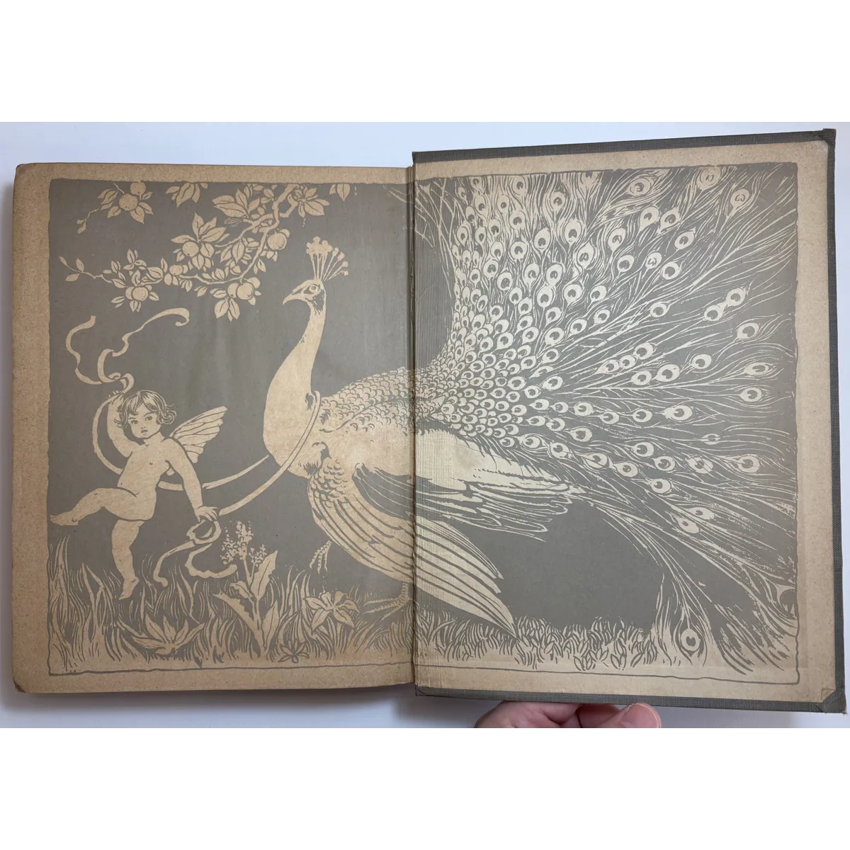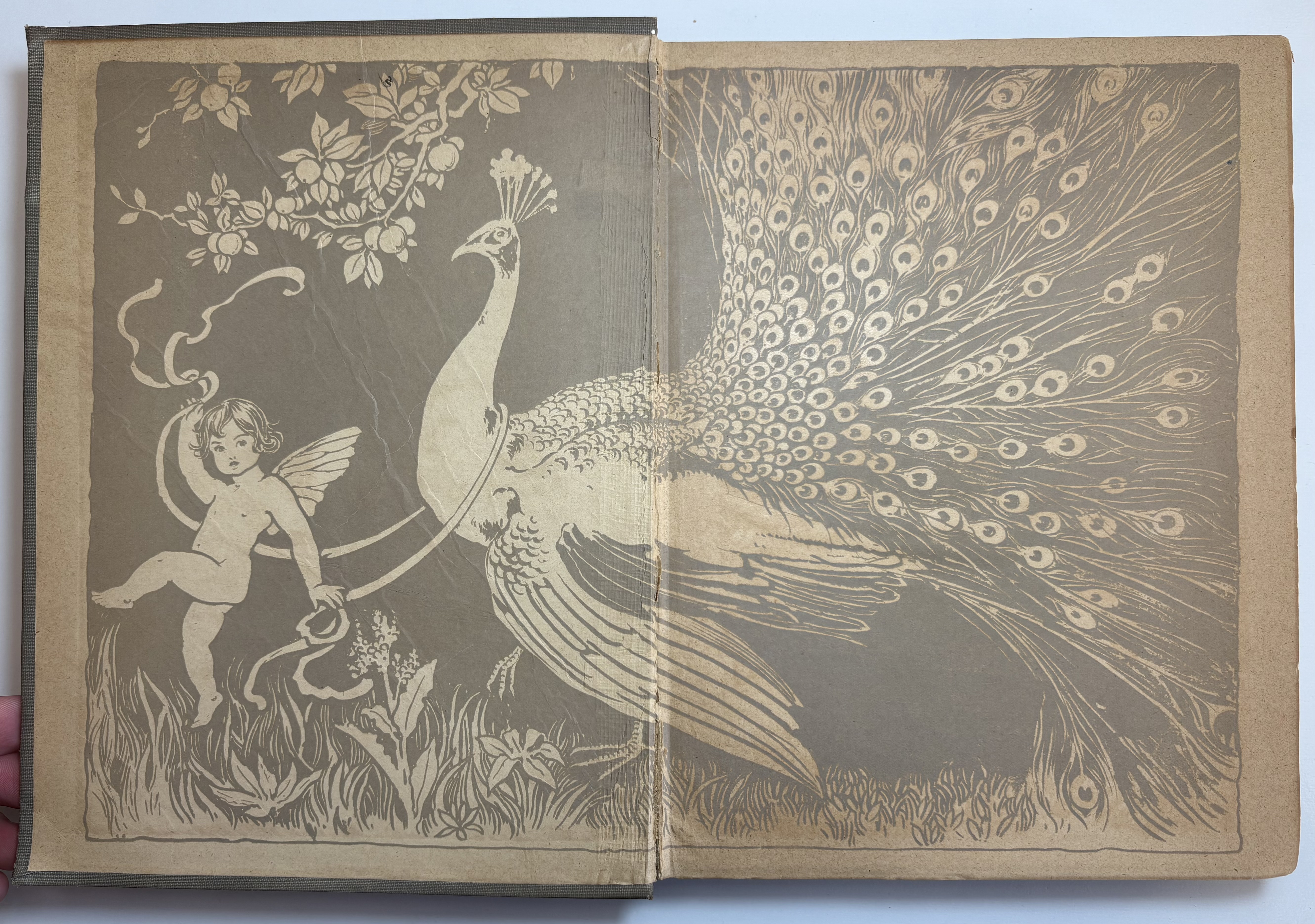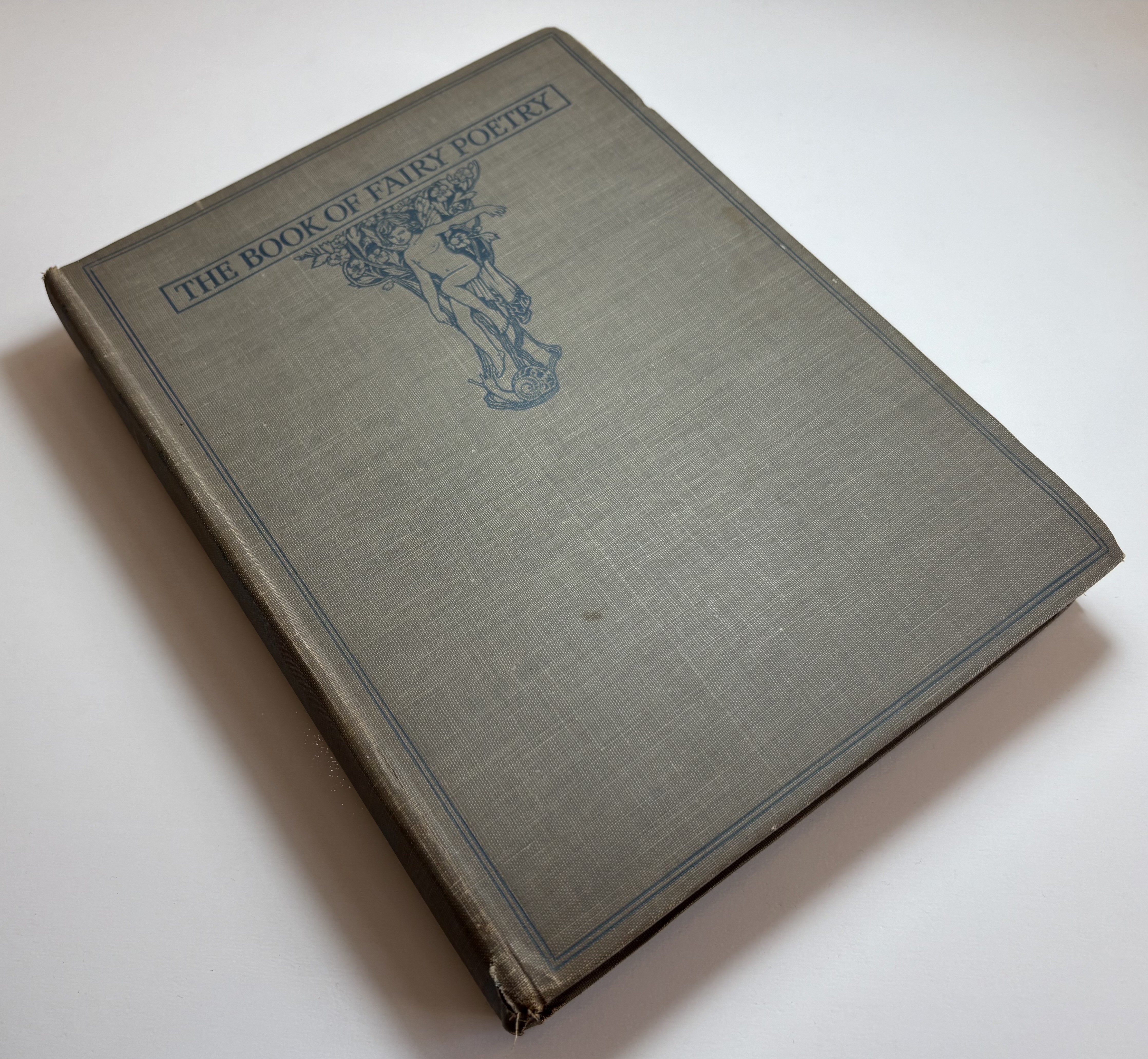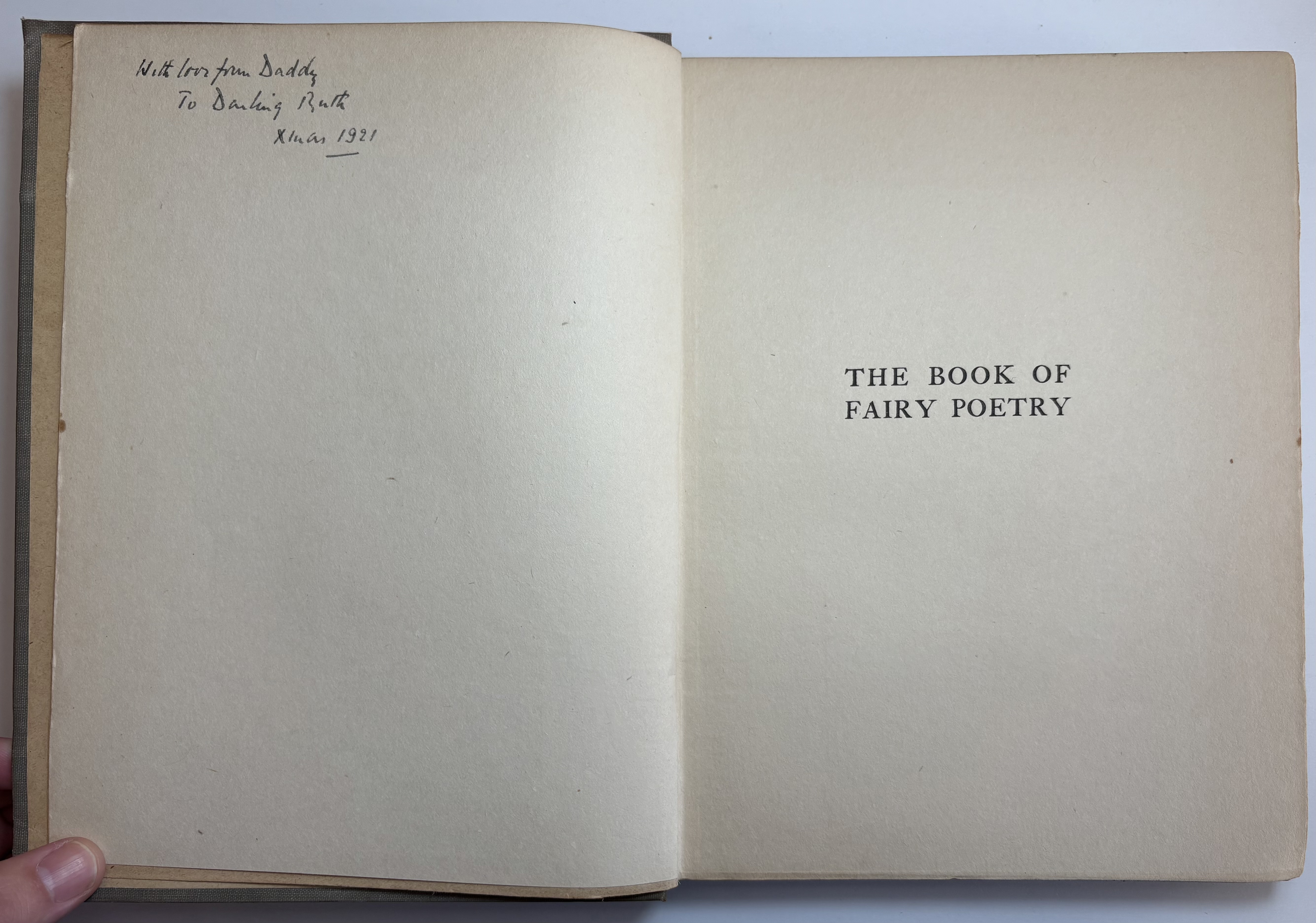 There are various signs of age, use and wear. The original publishers olive cloth binding is darkened in parts, some faint discolouration spots and rubbing dotted all around. Both boards have rubbing along the edges, and corners bumped. The spine is sunned, darkened more so than the boards. Title in blue on front board and spine, along with Fairy illustration. Head and tail of spine have particular shelf wear, some fraying of the edges, some surface splitting of the cloth. Joints holding well, no exterior splitting, boards holding firm to the text block. Attractive endpapers illustrated with a Fairy and Peacock, paper yellowed with age. Upper board hinge webbing visible, but holding well. Black Ink inscription opposite half title page reads "With love from Daddy, to Darling Ruth, Xmas 1921." The overall text block has age toned, yellowed throughout, some minor foxing. A couple of pages have some unidentified margin staining, possibly soiled from dirty hands, mostly affecting pages 82,83, 93. All text remains legible. All illustrations present, all in good condition, protected with tissue guards. Page edges toned. No loose or missing pages, binding good.