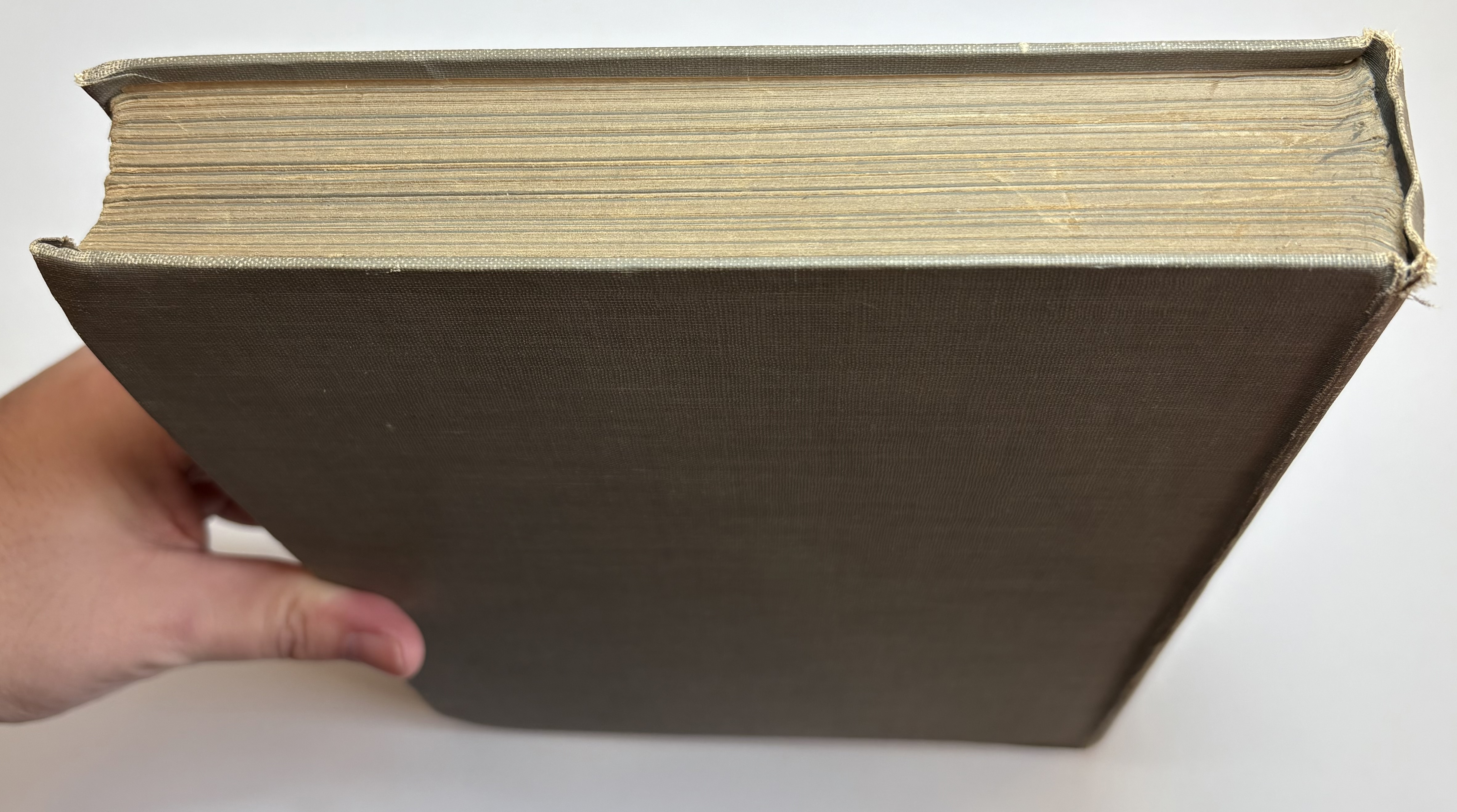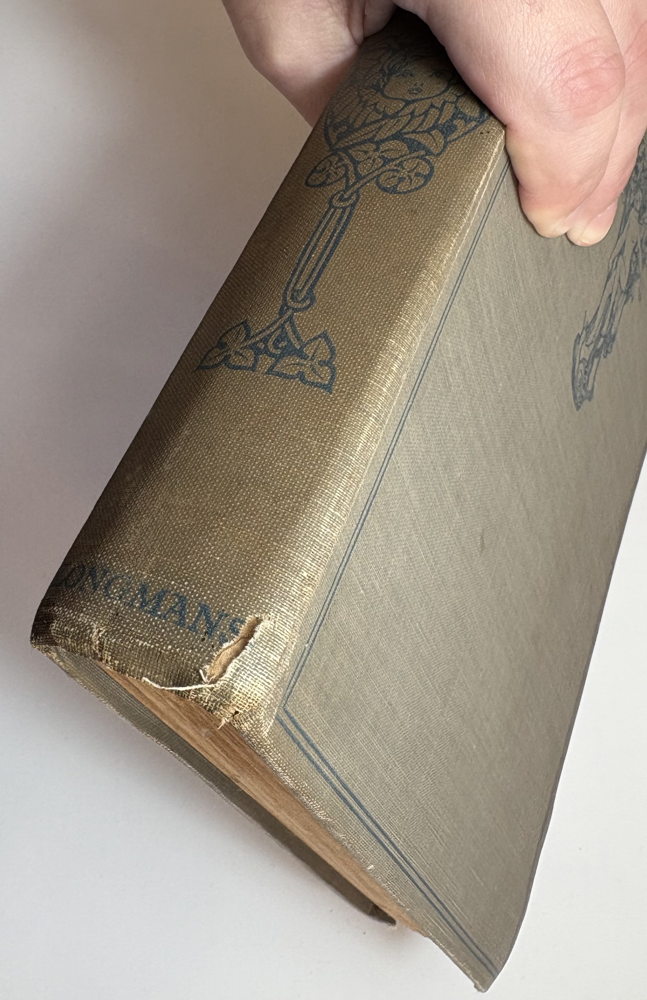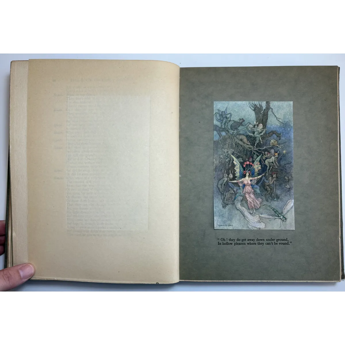 There are various signs of age, use and wear. The original publishers olive cloth binding is darkened in parts, some faint discolouration spots and rubbing dotted all around. Both boards have rubbing along the edges, and corners bumped. The spine is sunned, darkened more so than the boards. Title in blue on front board and spine, along with Fairy illustration. Head and tail of spine have particular shelf wear, some fraying of the edges, some surface splitting of the cloth. Joints holding well, no exterior splitting, boards holding firm to the text block. Attractive endpapers illustrated with a Fairy and Peacock, paper yellowed with age. Upper board hinge webbing visible, but holding well. Black Ink inscription opposite half title page reads "With love from Daddy, to Darling Ruth, Xmas 1921." The overall text block has age toned, yellowed throughout, some minor foxing. A couple of pages have some unidentified margin staining, possibly soiled from dirty hands, mostly affecting pages 82,83, 93. All text remains legible. All illustrations present, all in good condition, protected with tissue guards. Page edges toned. No loose or missing pages, binding good.