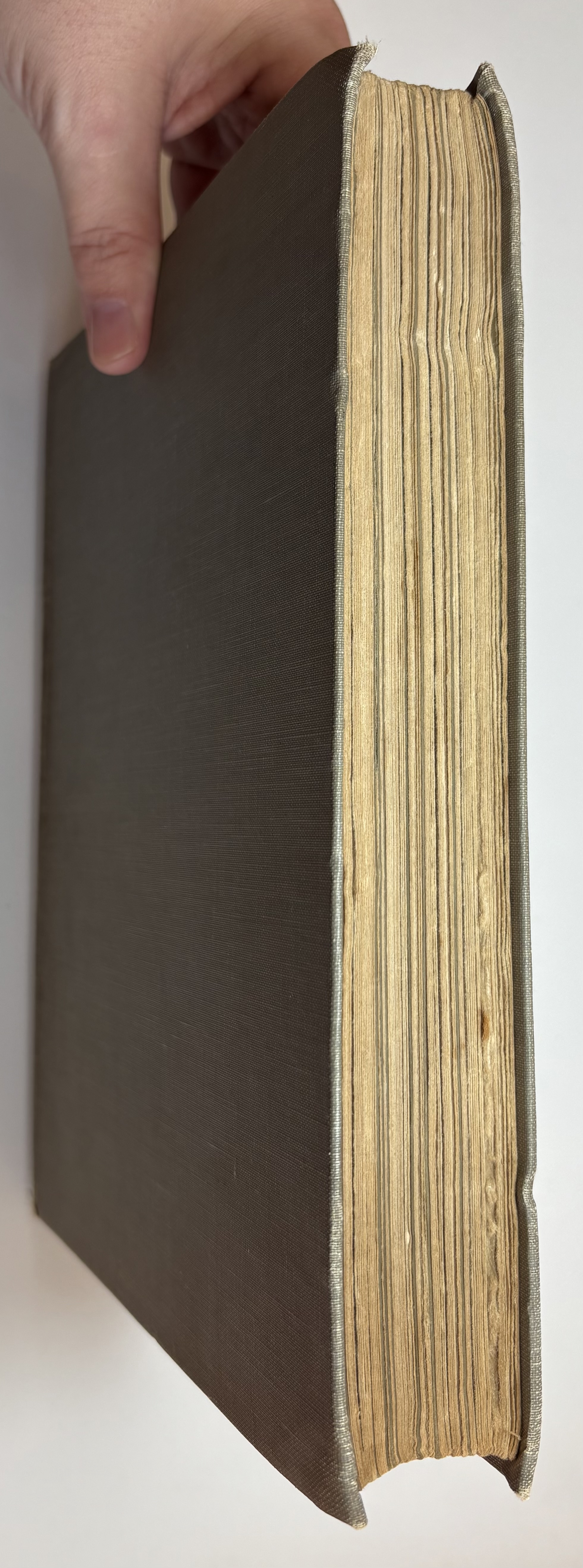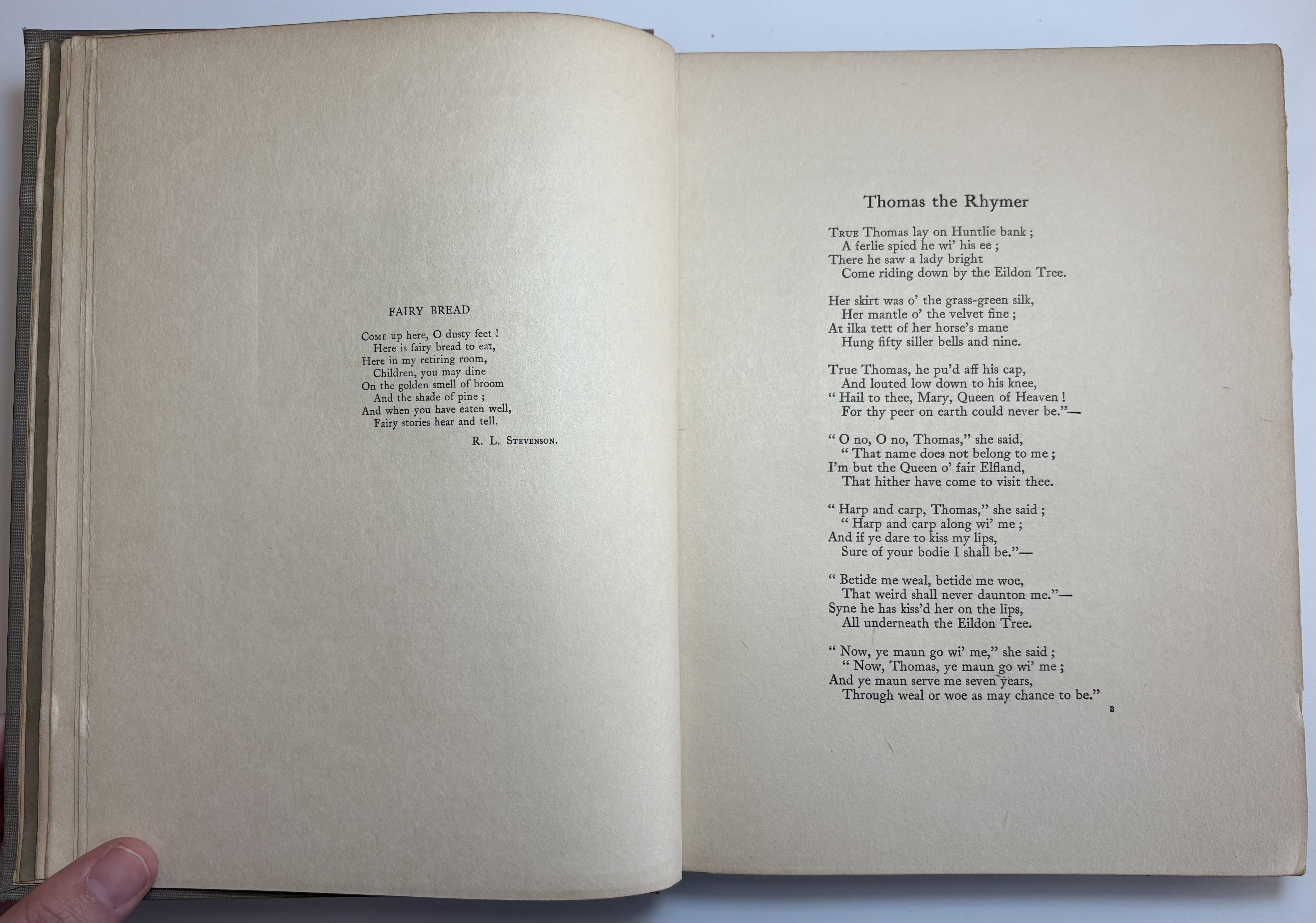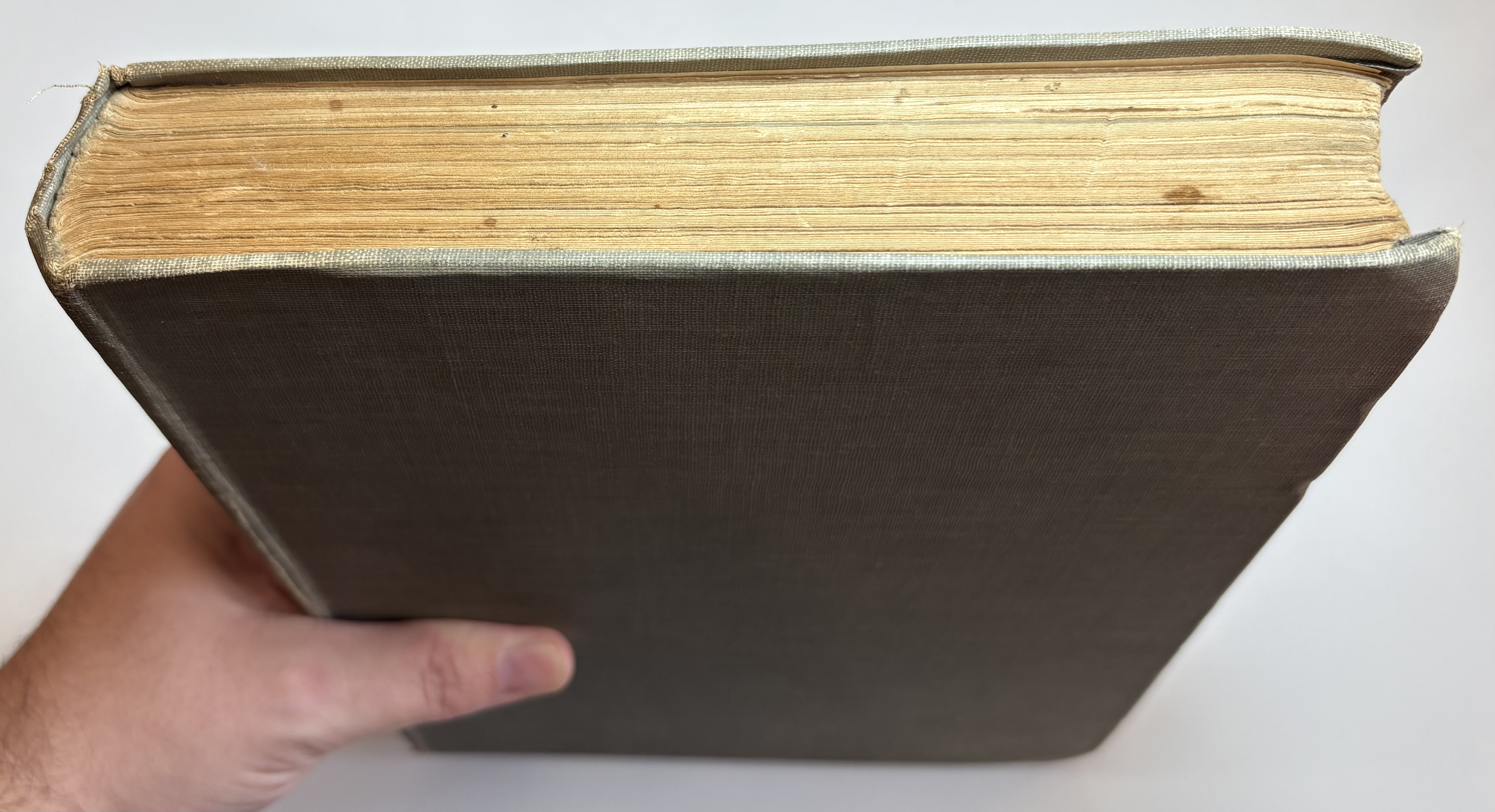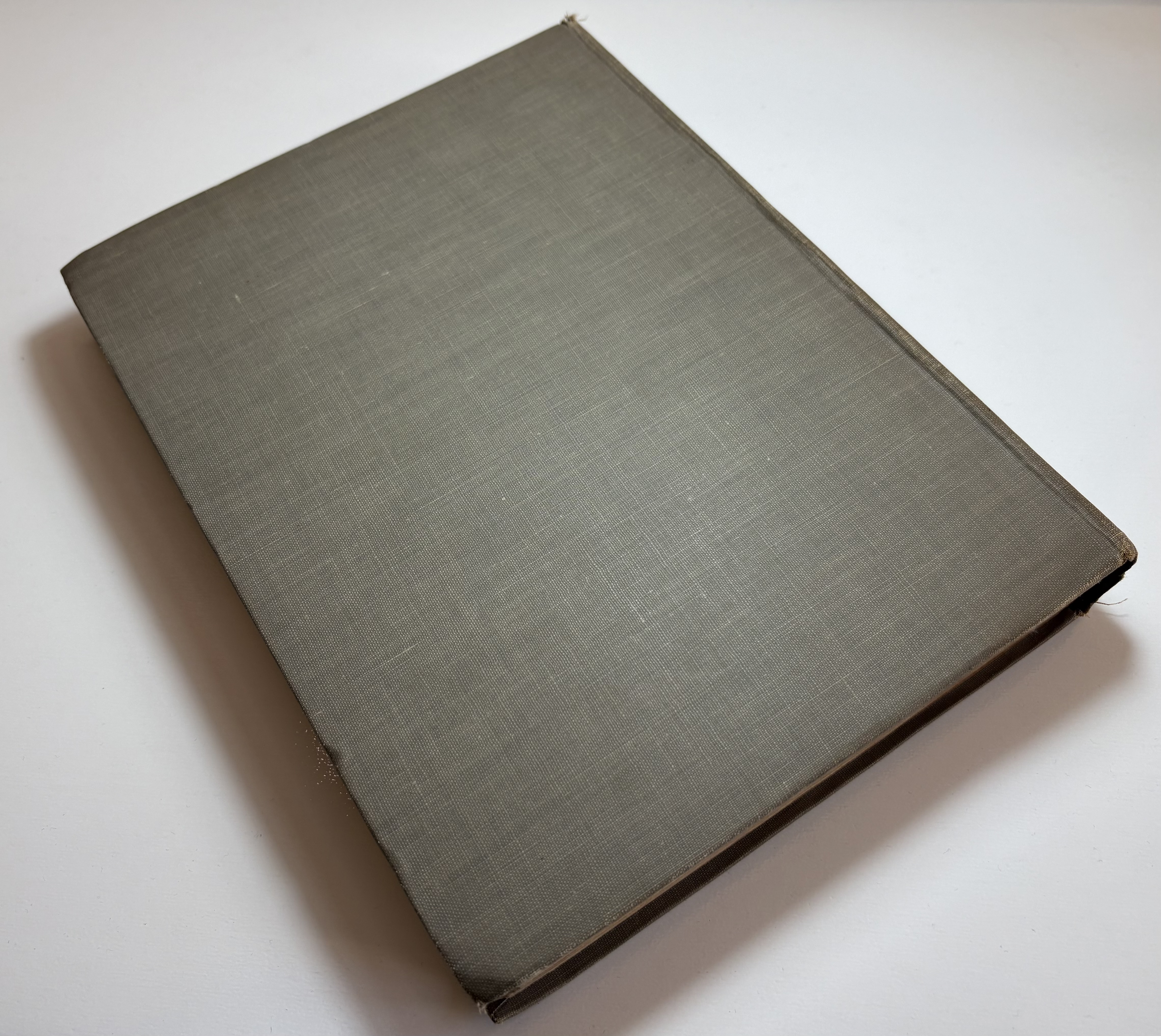 There are various signs of age, use and wear. The original publishers olive cloth binding is darkened in parts, some faint discolouration spots and rubbing dotted all around. Both boards have rubbing along the edges, and corners bumped. The spine is sunned, darkened more so than the boards. Title in blue on front board and spine, along with Fairy illustration. Head and tail of spine have particular shelf wear, some fraying of the edges, some surface splitting of the cloth. Joints holding well, no exterior splitting, boards holding firm to the text block. Attractive endpapers illustrated with a Fairy and Peacock, paper yellowed with age. Upper board hinge webbing visible, but holding well. Black Ink inscription opposite half title page reads "With love from Daddy, to Darling Ruth, Xmas 1921." The overall text block has age toned, yellowed throughout, some minor foxing. A couple of pages have some unidentified margin staining, possibly soiled from dirty hands, mostly affecting pages 82,83, 93. All text remains legible. All illustrations present, all in good condition, protected with tissue guards. Page edges toned. No loose or missing pages, binding good.