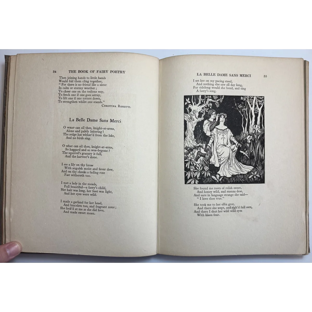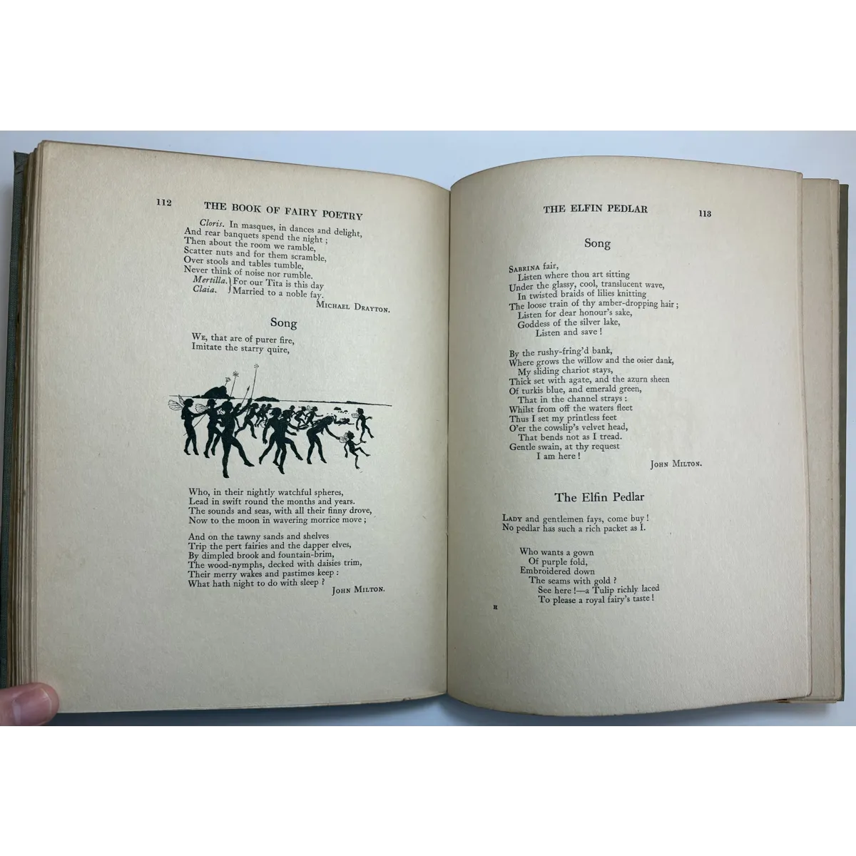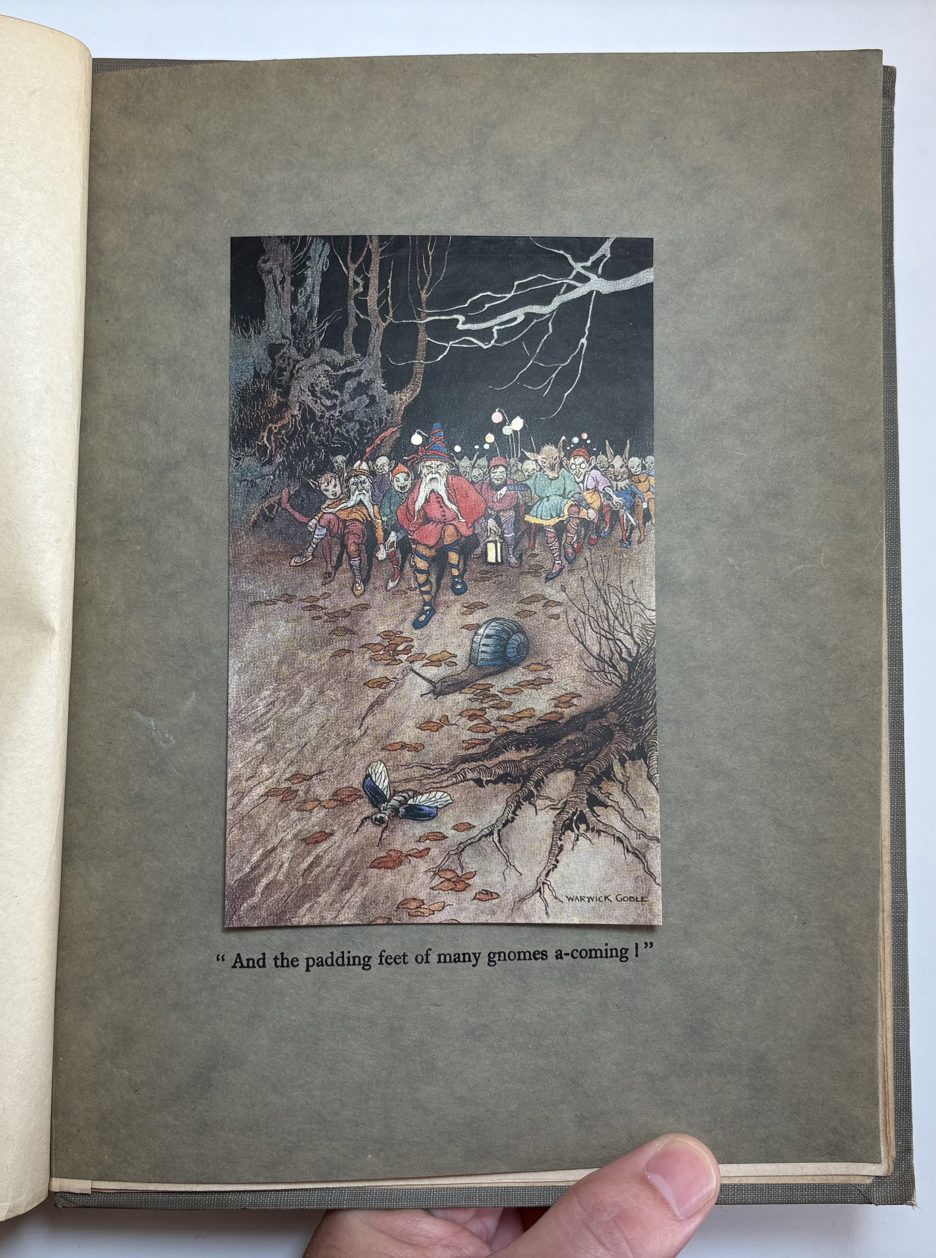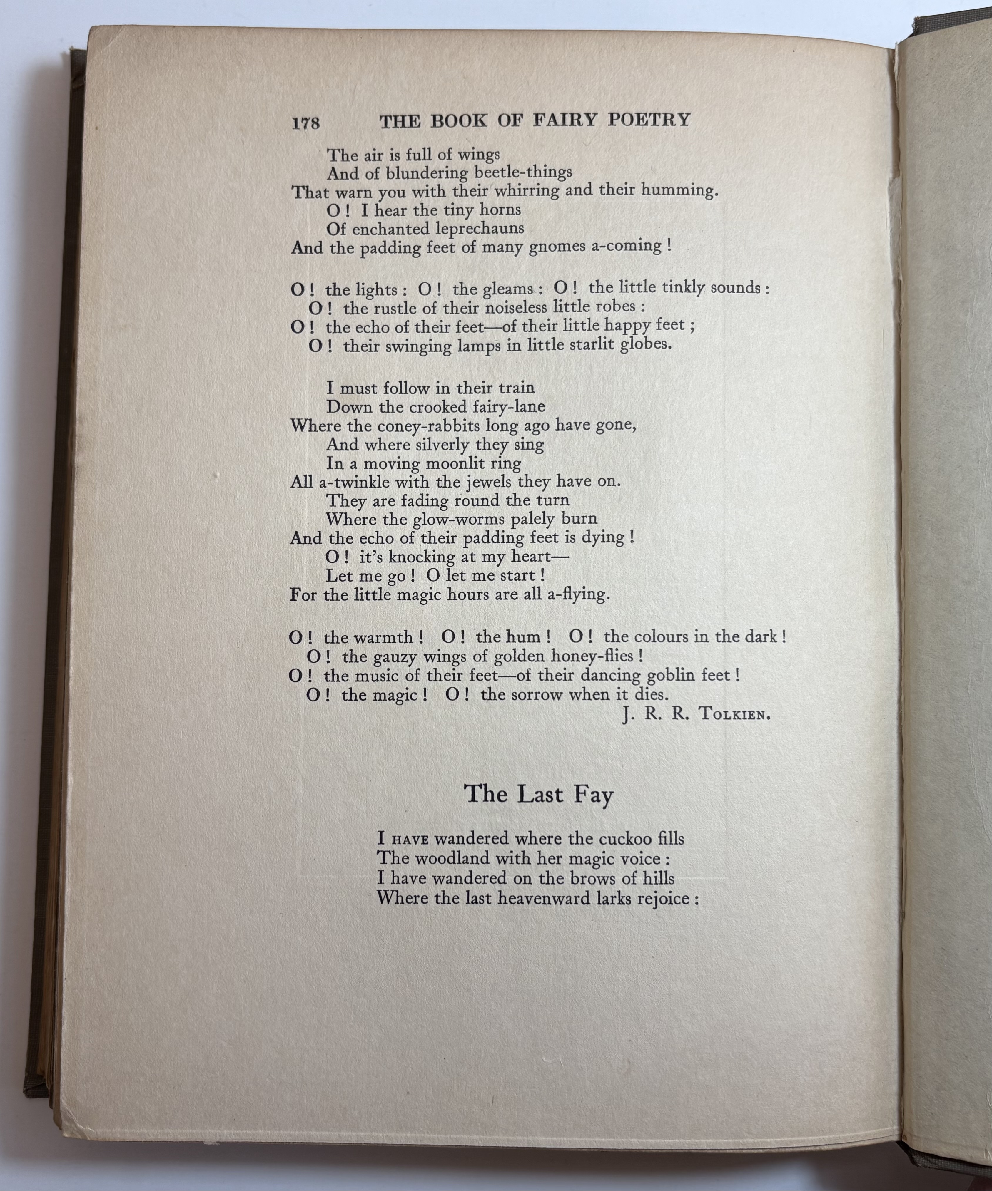 The Book of Fairy Poetry is a anthology of poems and tales involving fairies. There are three parts: Fairy Stories; Fairy Songs, Dances & Talk; Fairyland & Fairy Lore. On Part III ("Fairyland and Fairy Lore"), on pages 177-178, J.R.R. Tolkien's poem Goblin Feet is included. This is the first illustrated appearance of "Goblin Feet" by JRR Tolkien. Originally published in "Oxford Poety 1915", the poem is here accompanied by a colour plate entitled "And the padding feet of many gnomes a-coming", which has the distinction of being the very first illustration to accompany any of Tolkien's published work - years before The Hobbit. Other works included are drawn from some of the great names of English literature, such as William Shakespeare, Alfred Tennyson, Sir Walter Scott, Christina Rossetti, John Milton, Robert Louis Stevenson, William Yeats, and John Keats.