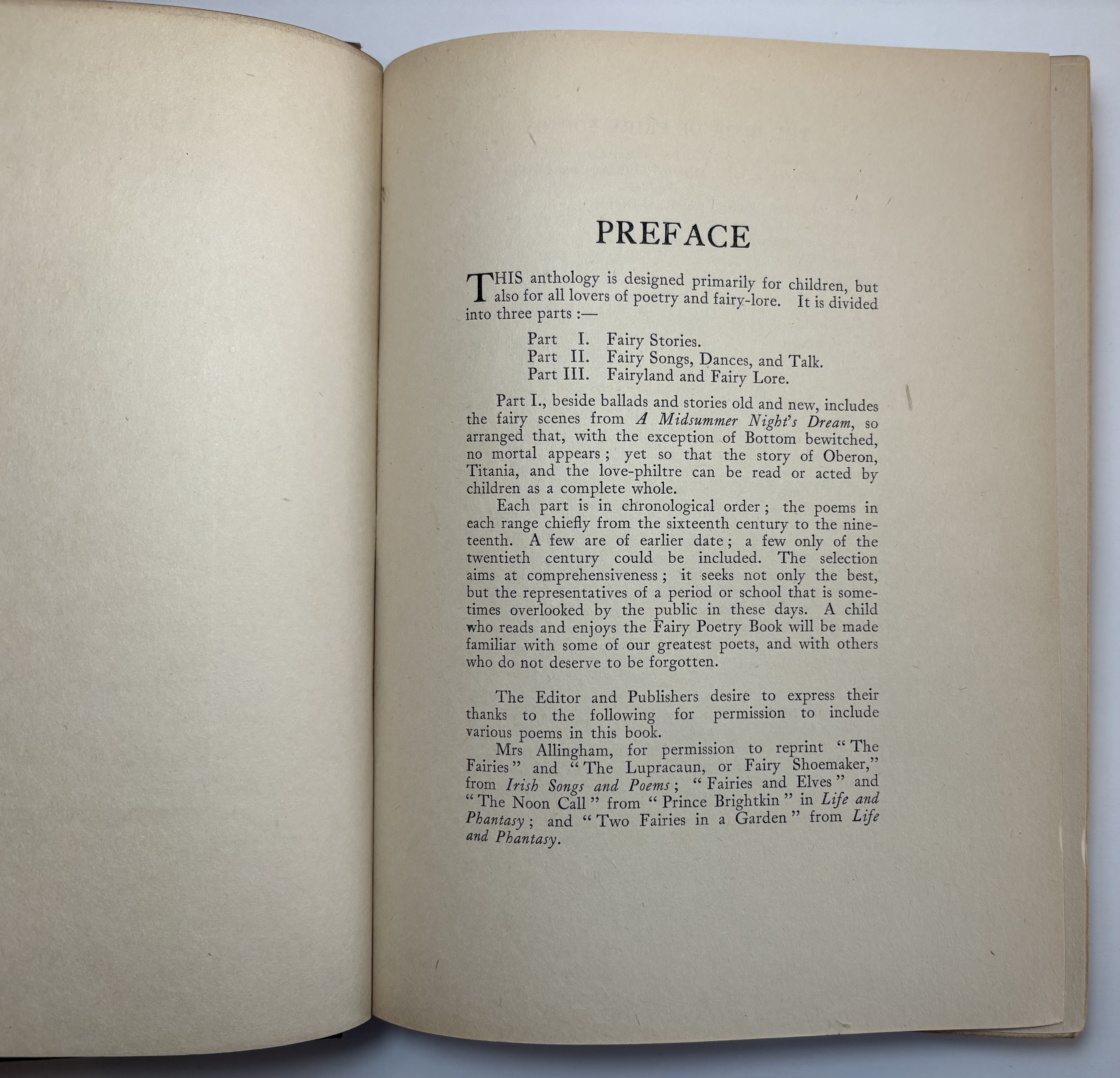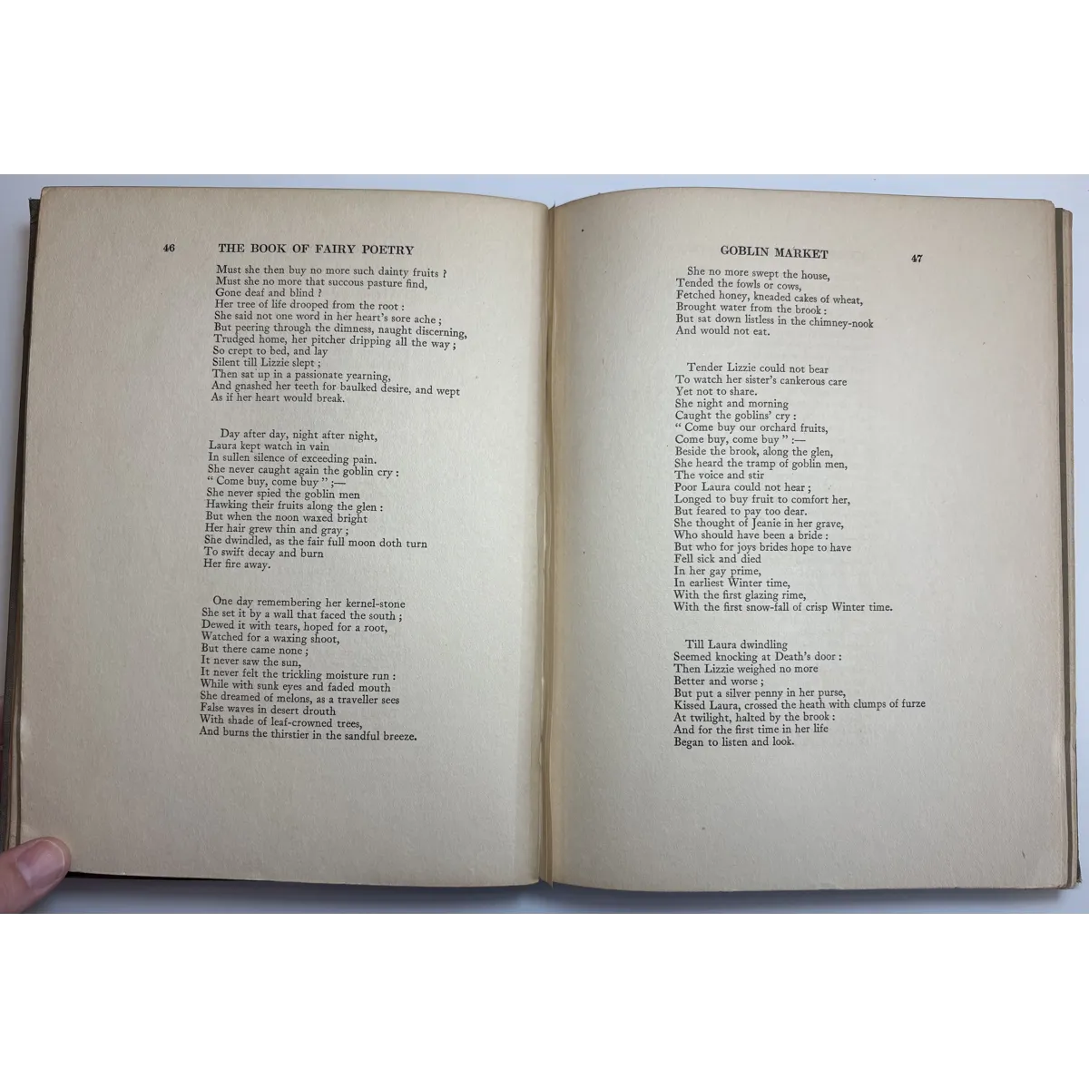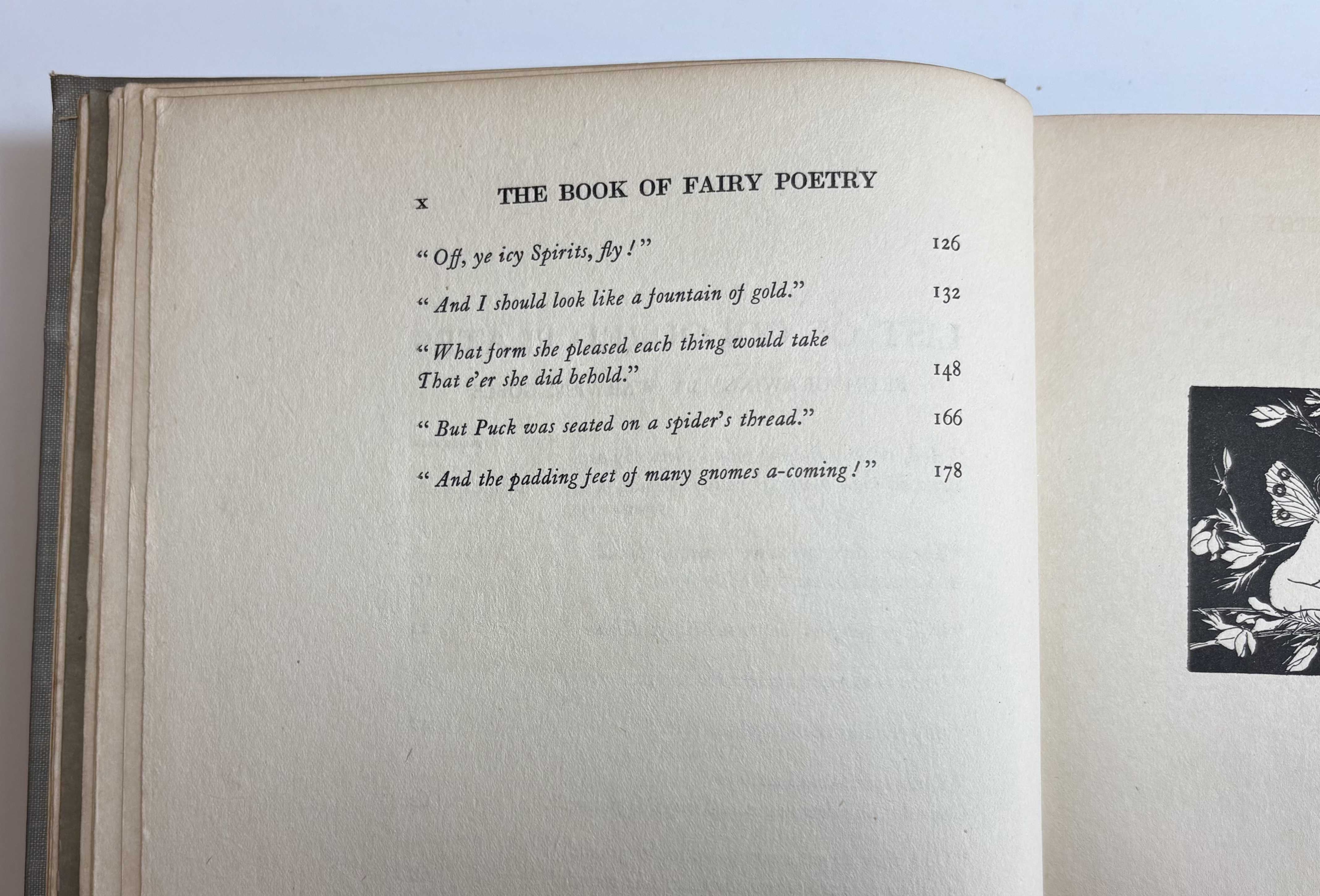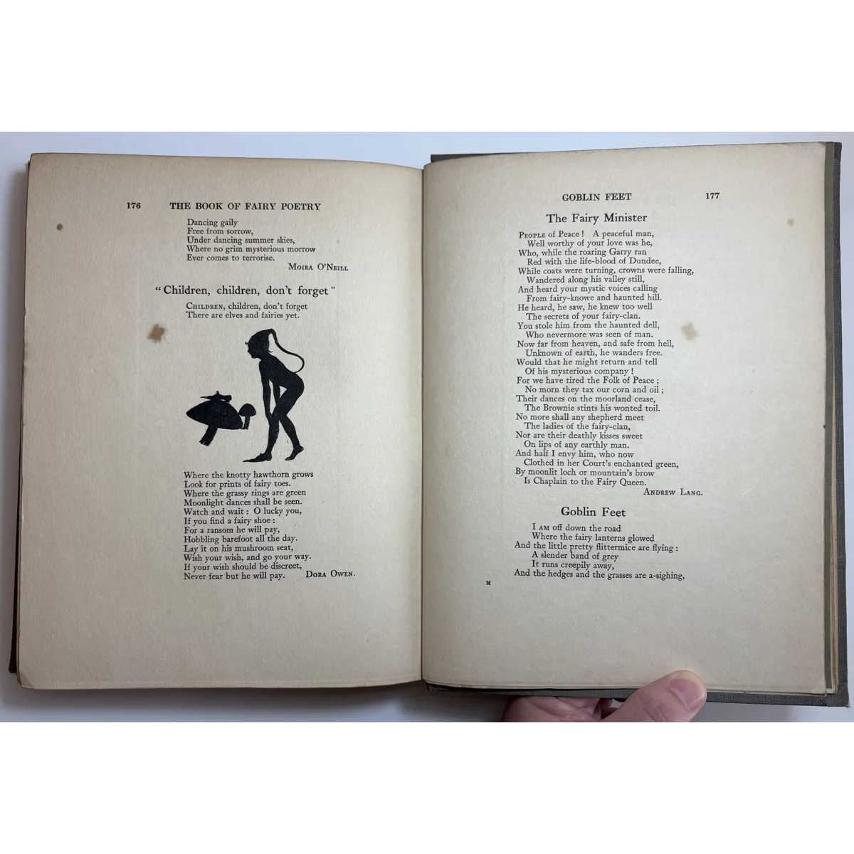 The Book of Fairy Poetry is a anthology of poems and tales involving fairies. There are three parts: Fairy Stories; Fairy Songs, Dances & Talk; Fairyland & Fairy Lore. On Part III ("Fairyland and Fairy Lore"), on pages 177-178, J.R.R. Tolkien's poem Goblin Feet is included. This is the first illustrated appearance of "Goblin Feet" by JRR Tolkien. Originally published in "Oxford Poety 1915", the poem is here accompanied by a colour plate entitled "And the padding feet of many gnomes a-coming", which has the distinction of being the very first illustration to accompany any of Tolkien's published work - years before The Hobbit. Other works included are drawn from some of the great names of English literature, such as William Shakespeare, Alfred Tennyson, Sir Walter Scott, Christina Rossetti, John Milton, Robert Louis Stevenson, William Yeats, and John Keats.