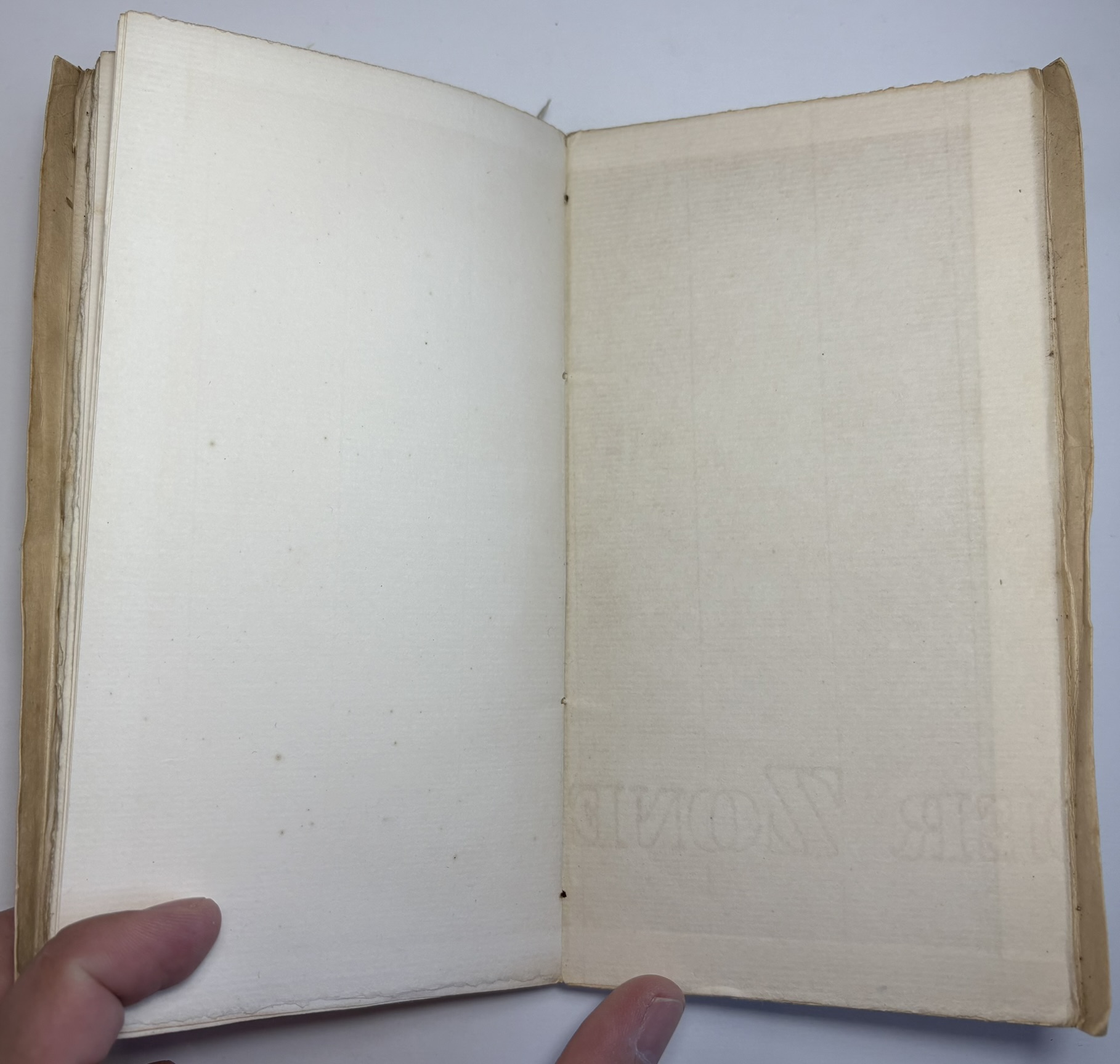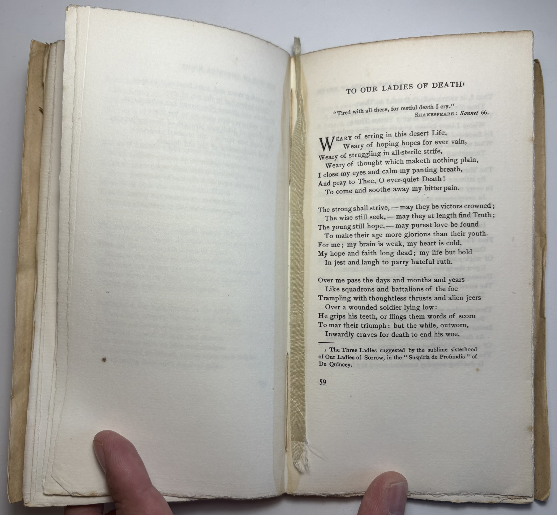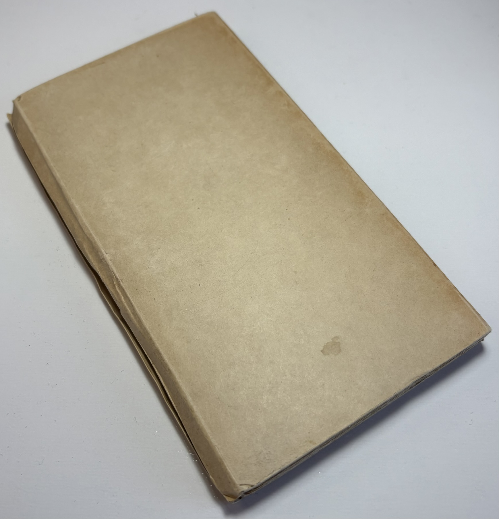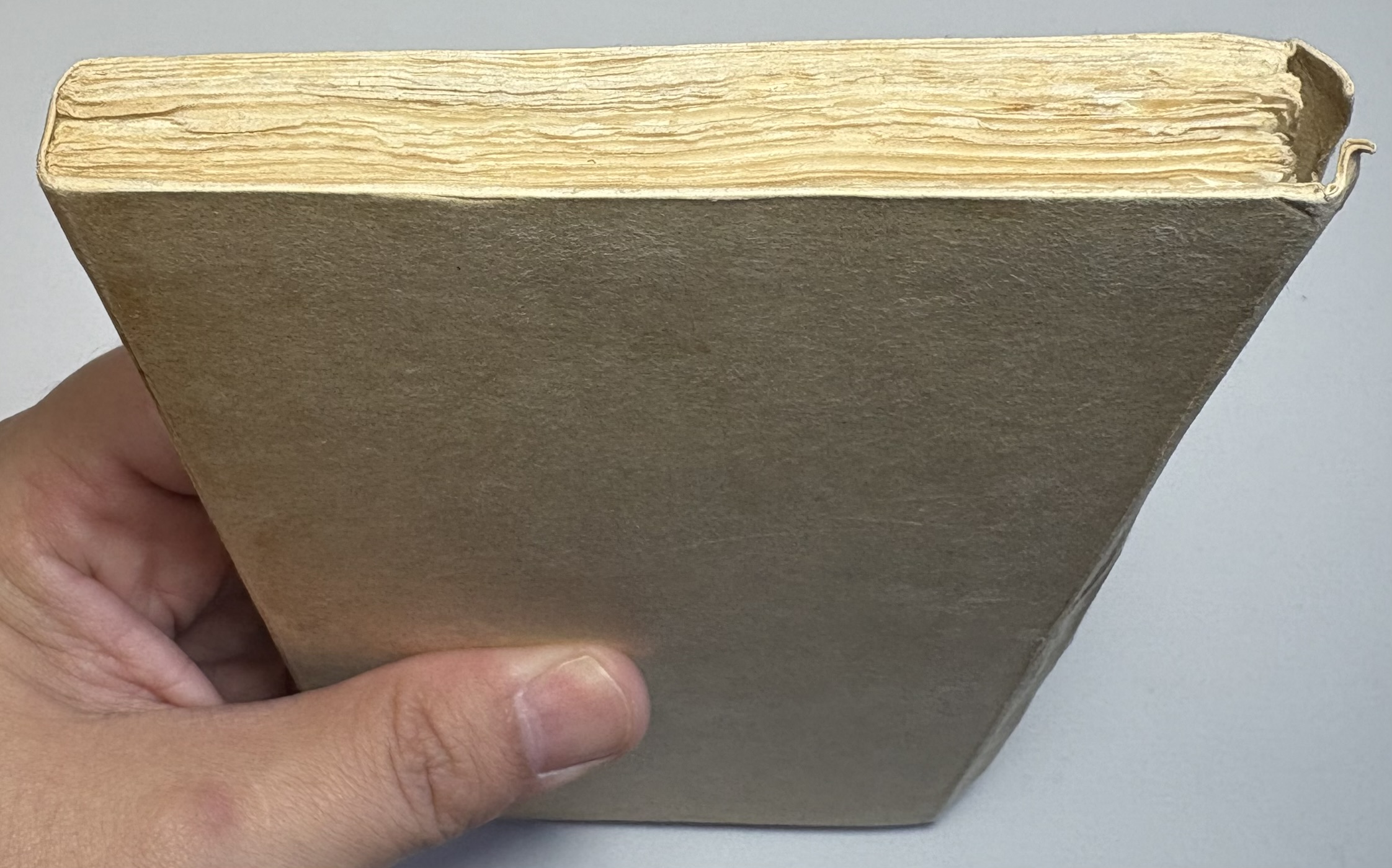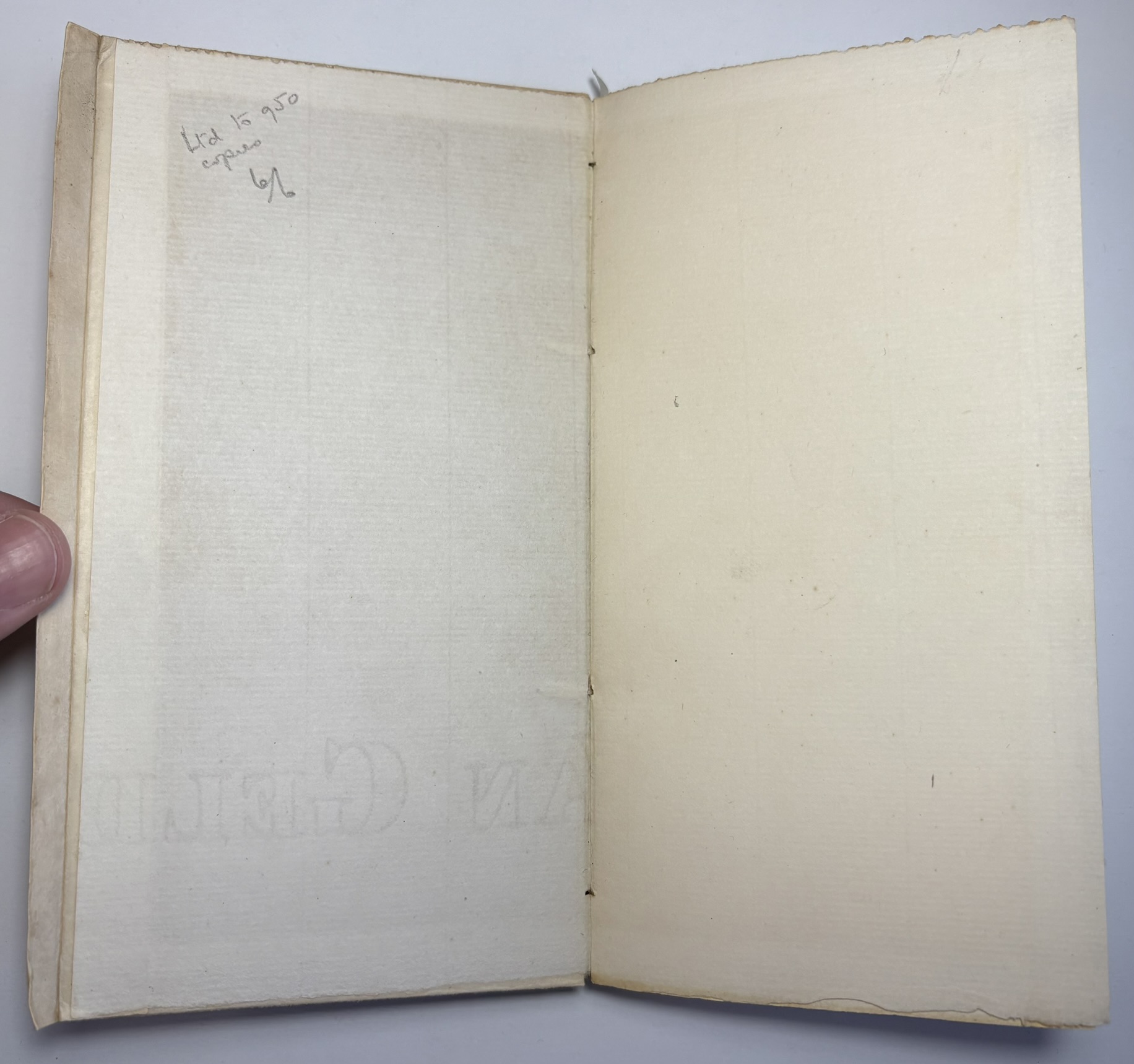 The paper binding has yellowed/discoloured with age. Some mild staining, spine sunned/darkened. Floral title to front board, title and date on spine. Both boards have a 1cm yapp overhang, protecting the text block fore edge. All edges rough cut, wavy edged. Both paste downs have a visible paper water mark of the papermaker Van Gelder Zonen. Booksellers pencil inscription noting ltd to 950 copies. Overall text block binding good, firm and complete. One detached ribbon page marker, appears to have remained in situ for quite some time, leaving a discoloured strip beneath. The contents remains in great condition, perfectly legible and in crisp clean type. No other previous owner inscriptions, highlighting or notes.
