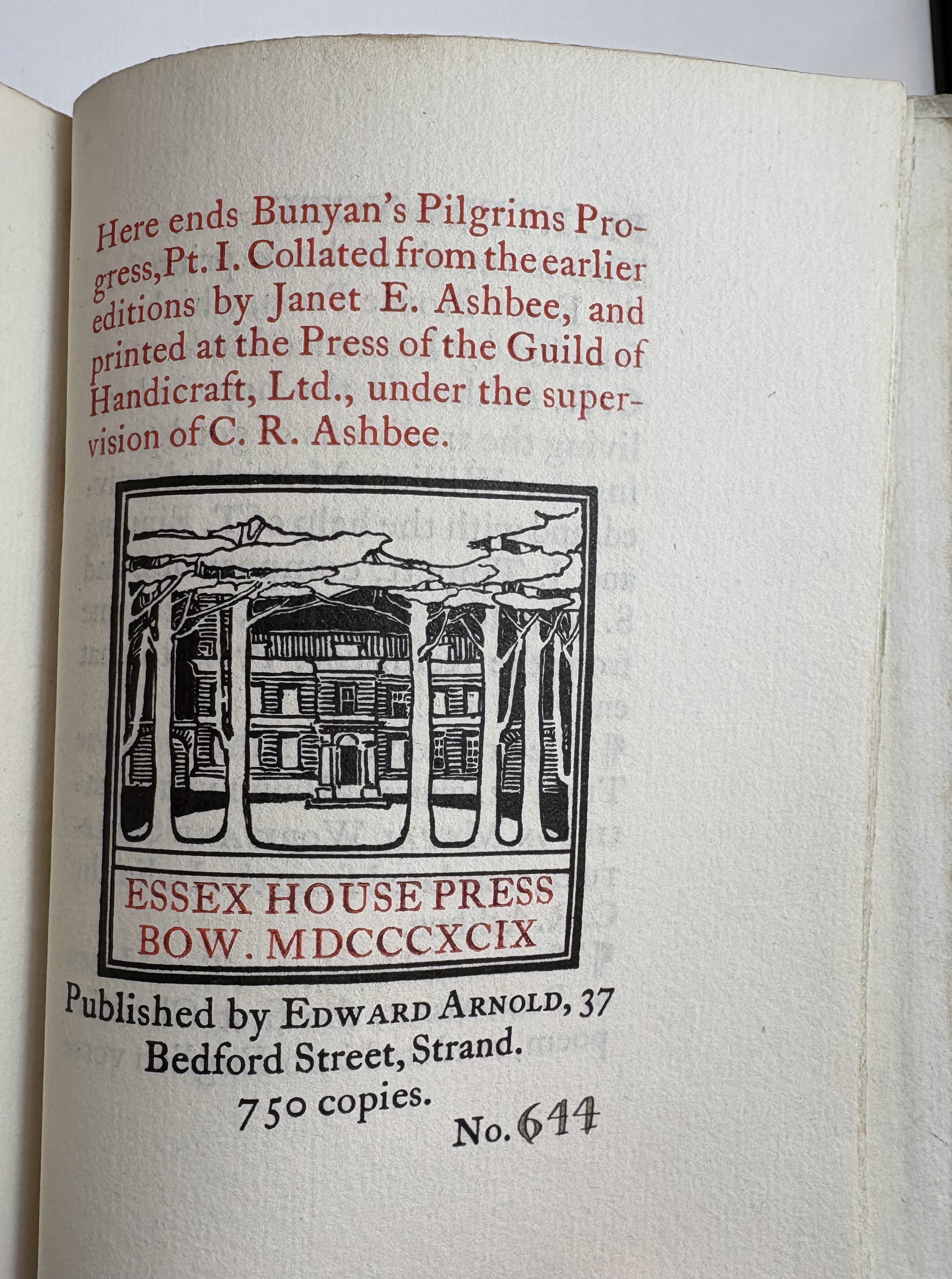 Pt. I. Collated from the earlier editions by Janet E. Ashbee, and printed ar the Press of the Guild of Handicraft, Ltd., under the supervision of C. R. Ashbee.Essex House Press Bow.