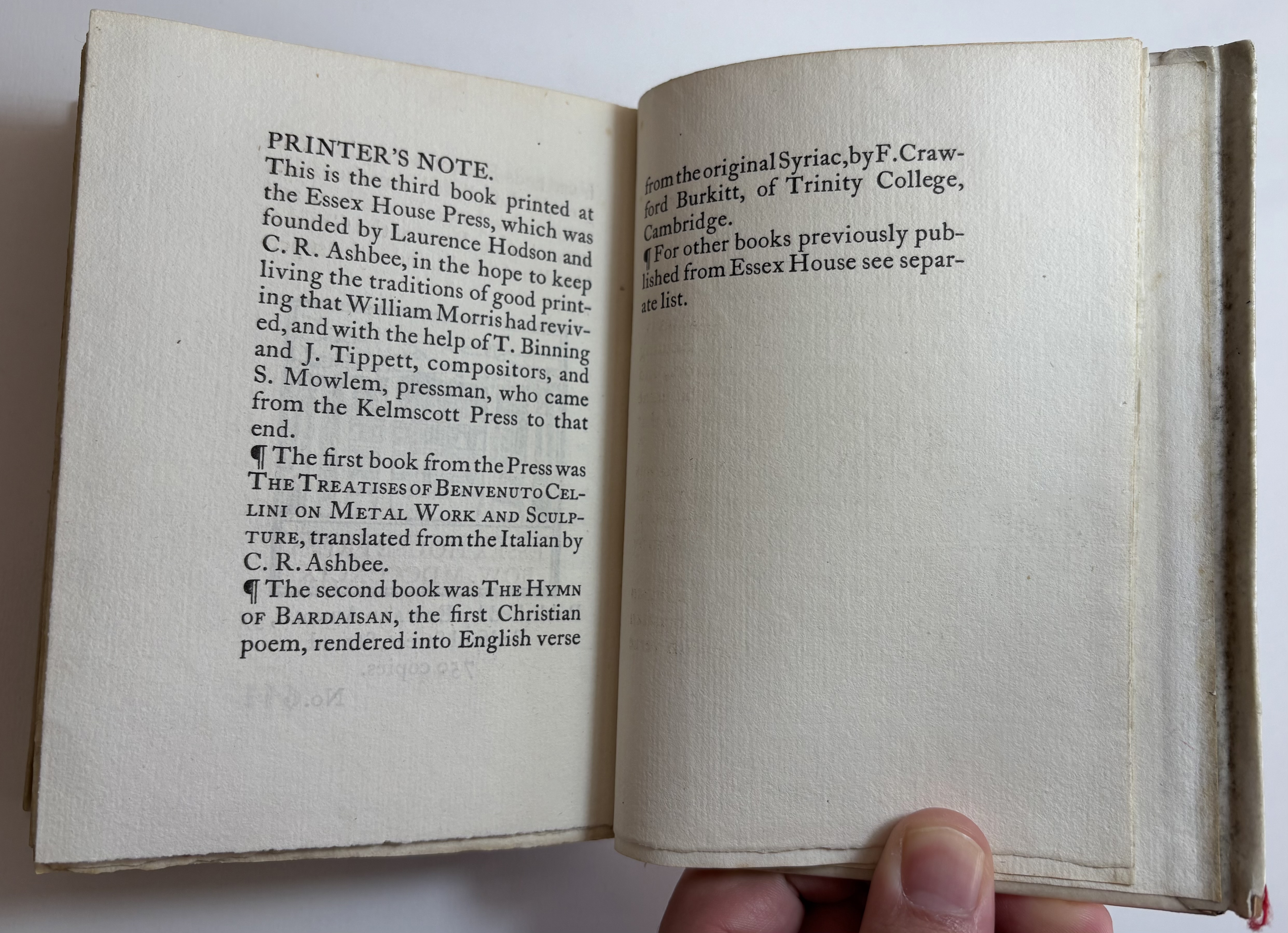 The first book from the Press was The Treatises of Benvenuto Cellini on Metal WorkSculpture, translated from the Italian by C. R. Ashbee. The second book was The Hymn of Bardaisan, the first Christian poem, rendered into English verse from the original Syriac, by F. Crawford Burkitt, of Trinity College, Cambridge.