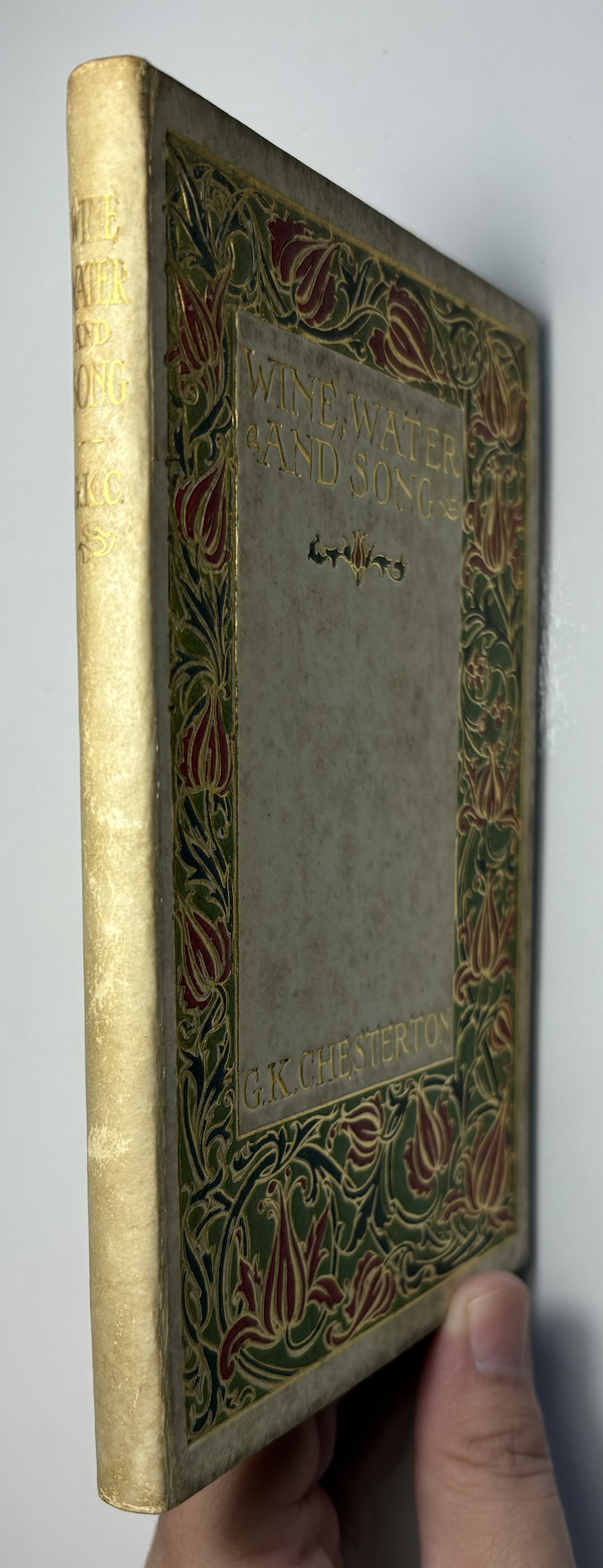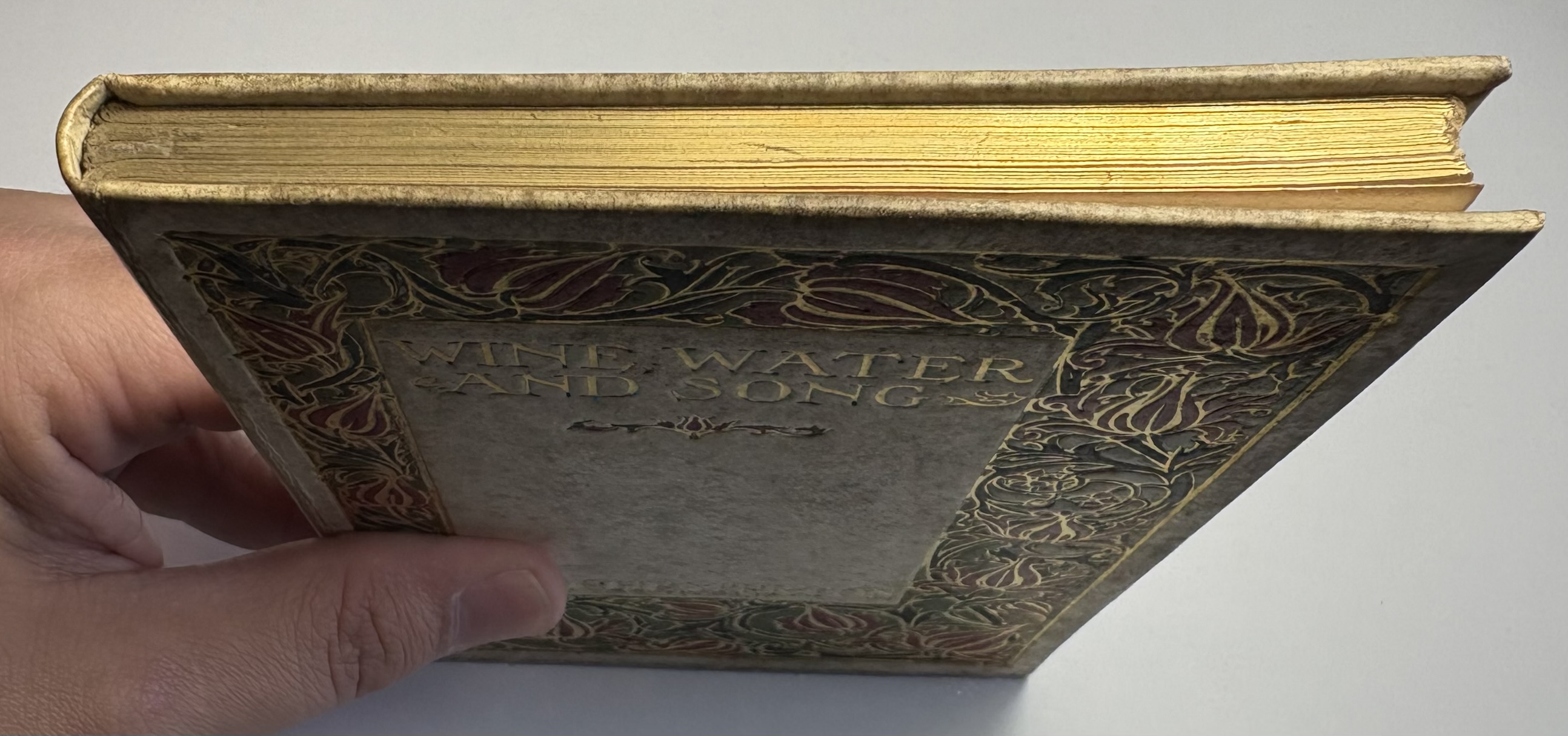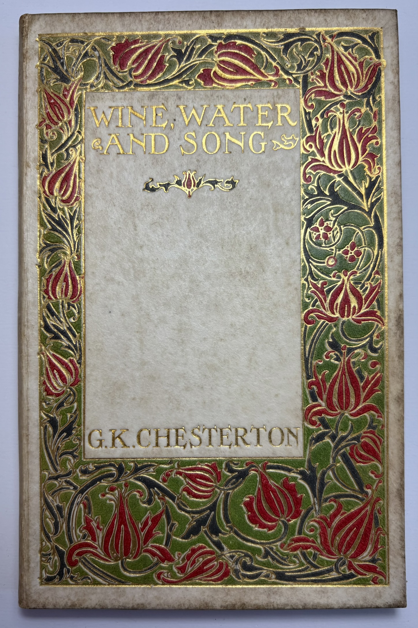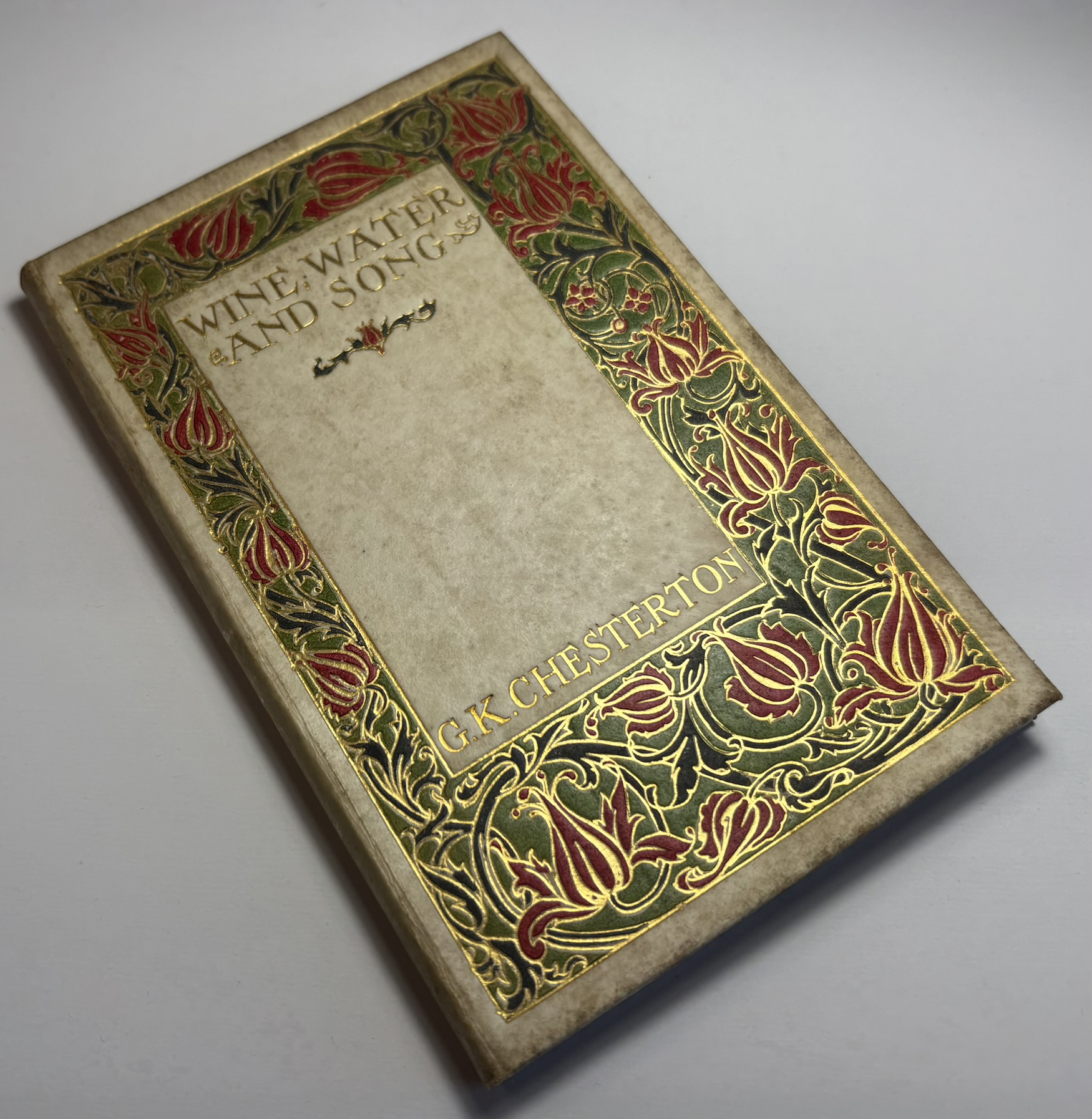 Bound in creamy vellum, with attractive floral red and green border decoration, with gilt tooling highlights to the upper board. Gilt title and author name within the border panel. Gilt title and author initials on spine. Vellum is darkened, with significant patchy discolouration on all sides. Gilding and colours remain bright and appealing. Joints holding well with no splitting.