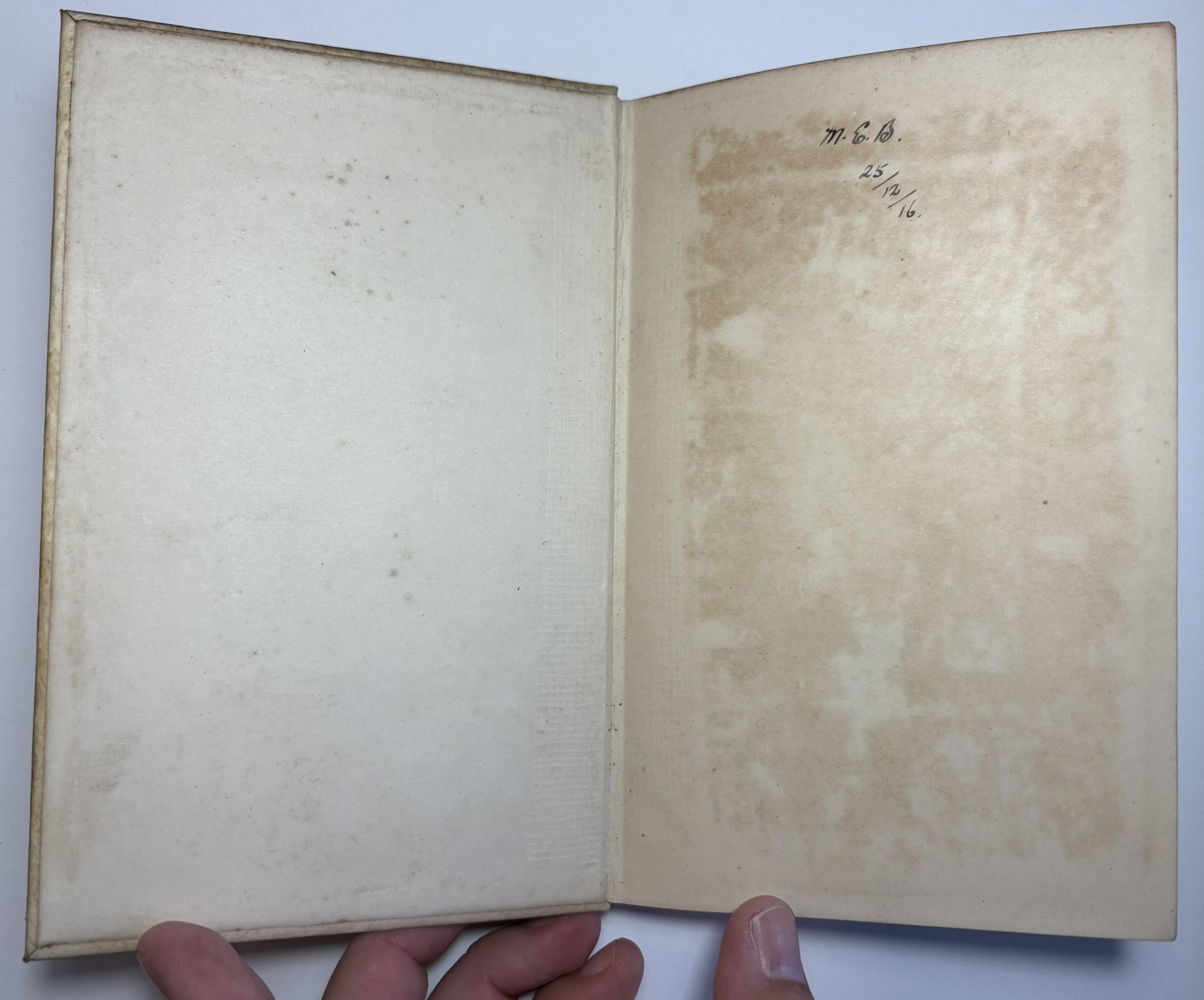Text block is complete, no loose or missing pages. Top edge gilt, a little darkened and scuffed. Generally age toned throughout, mild foxing, mostly affecting endpapers. Small ink initial inscription on flyleaf, M.E.B 25/12/16, clearly a Christmas gift. Hinges holding well with no splitting.