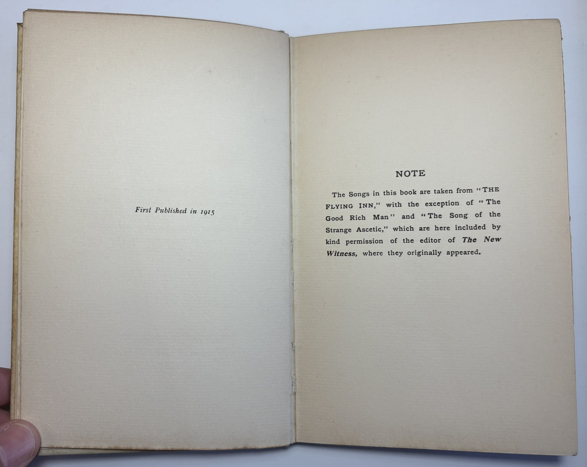The Songs in this book are taken from "The Flying Inn," with the exception of "The Good Rich Man" and "The Song of the Strange Ascetic," which are here included by kind permission of the editor of The New Witness, where they originally appeared.